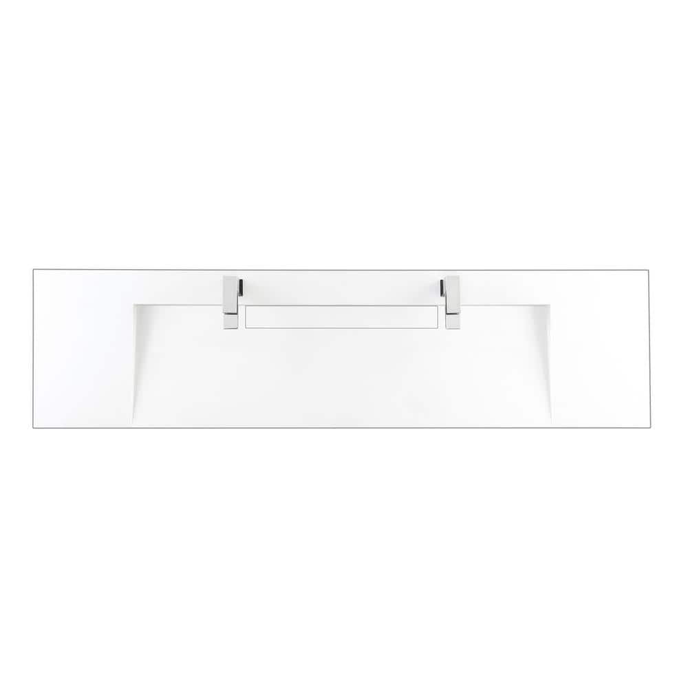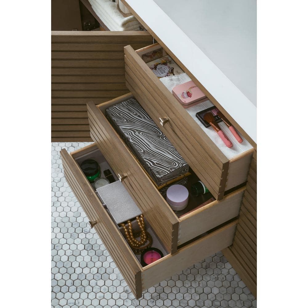 The Linear Double Bath Vanity by James Martin Vanities is a masterpiece of modern design. Its whitewashed walnut finish exudes warmth, while the glossy white solid surface top adds a touch of sophistication. The slatted wood design and satin nickel hardware create a harmonious blend of style and functionality. Pair it with minimalist decor and soft lighting to create a serene and luxurious bathroom retreat.