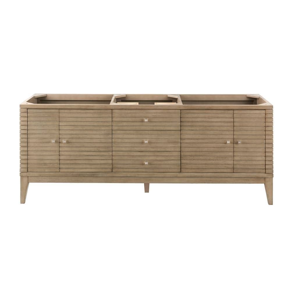 The James Martin Vanities Linear Double Bath Vanity combines modern design with practical storage. Featuring a whitewashed walnut finish and a glossy white solid surface top, it offers a sleek and durable solution for your bathroom.