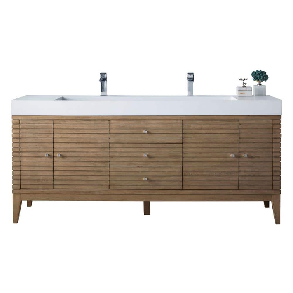 The James Martin Vanities Linear Double Bath Vanity combines modern design with practical storage. Featuring a whitewashed walnut finish and a glossy white solid surface top, it offers a sleek and durable solution for your bathroom.