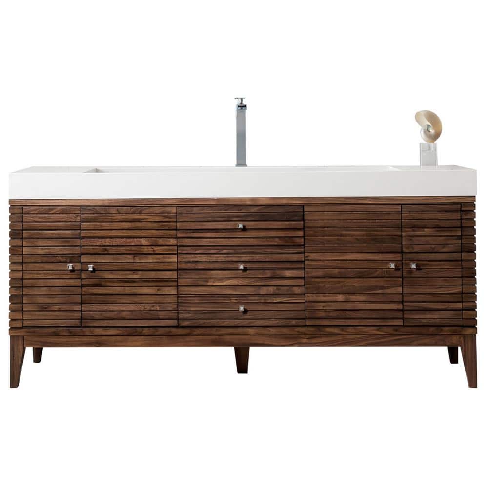 The Linear 72.5 in. Single Bath Vanity combines modern design with practical storage. Featuring a Mid Century Walnut finish and a Glossy White solid surface top, it offers a sleek and durable solution for your bathroom.