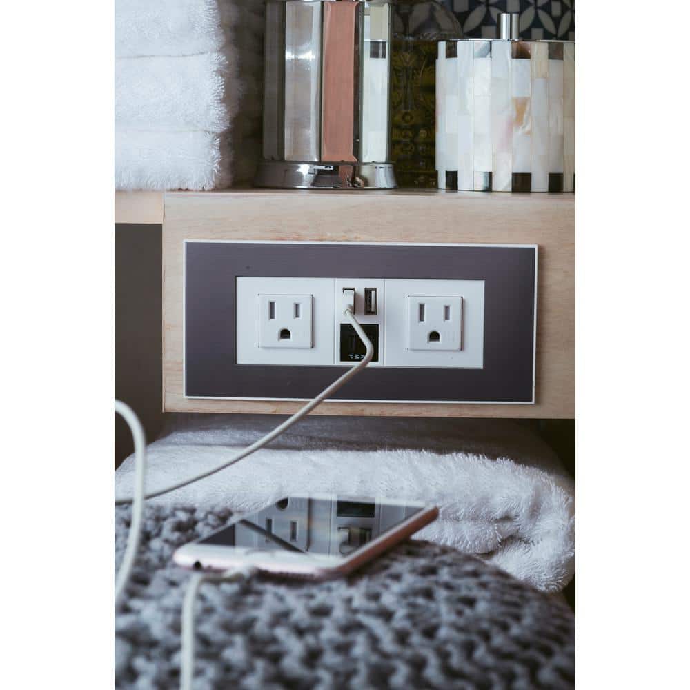 Premium Features: Soft-close hinges, brushed aluminum drawer lining, and electrical outlets.