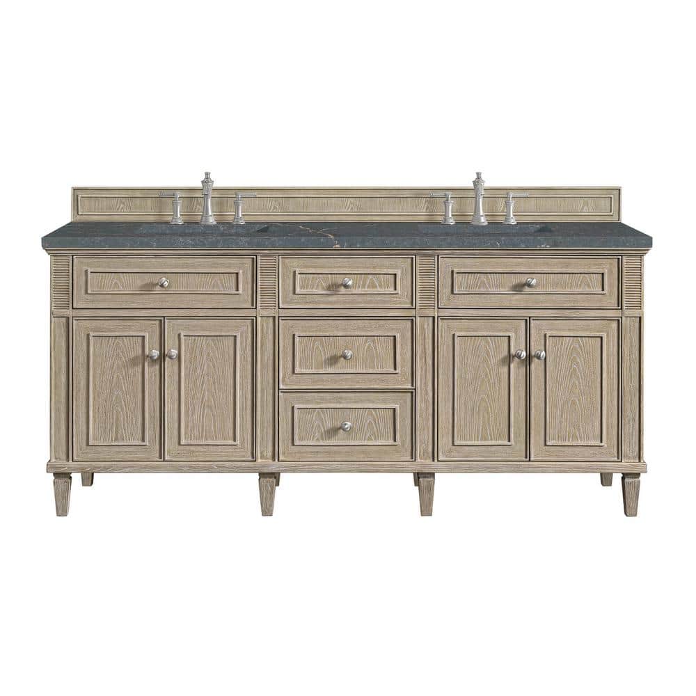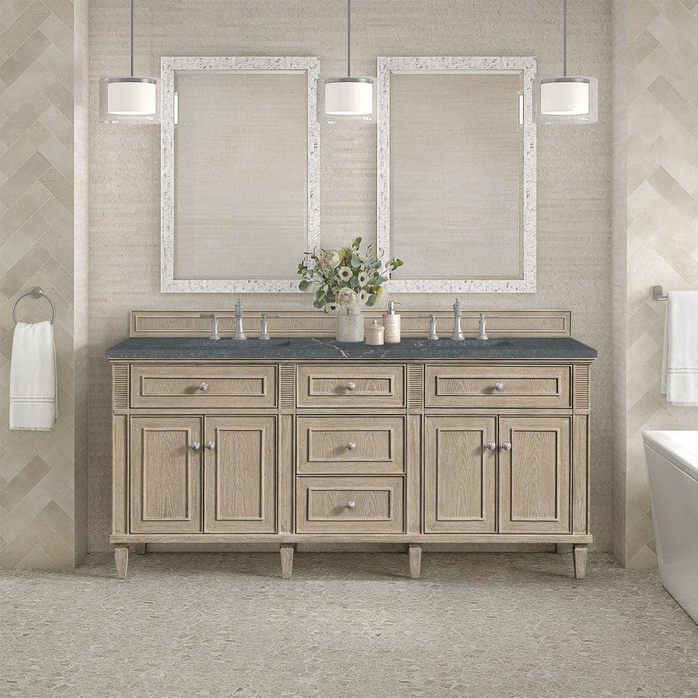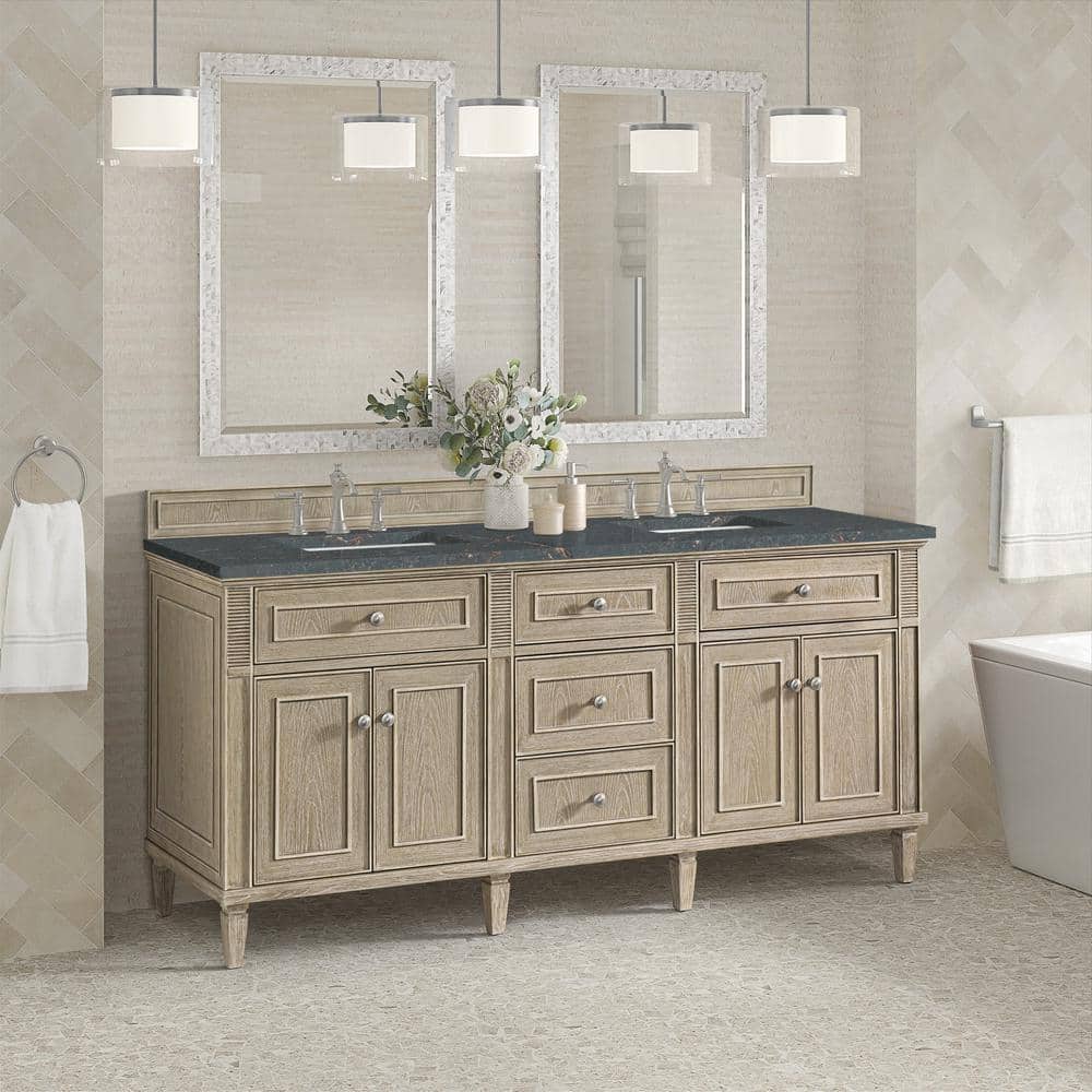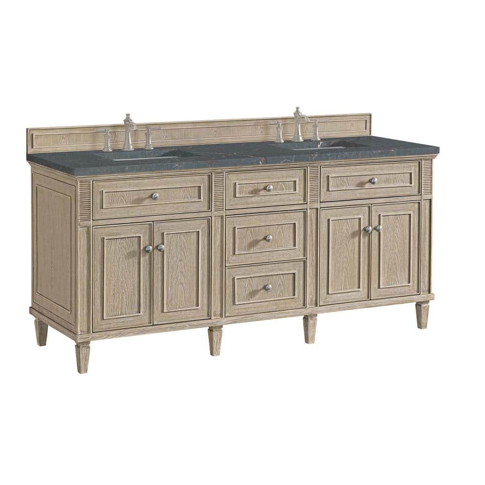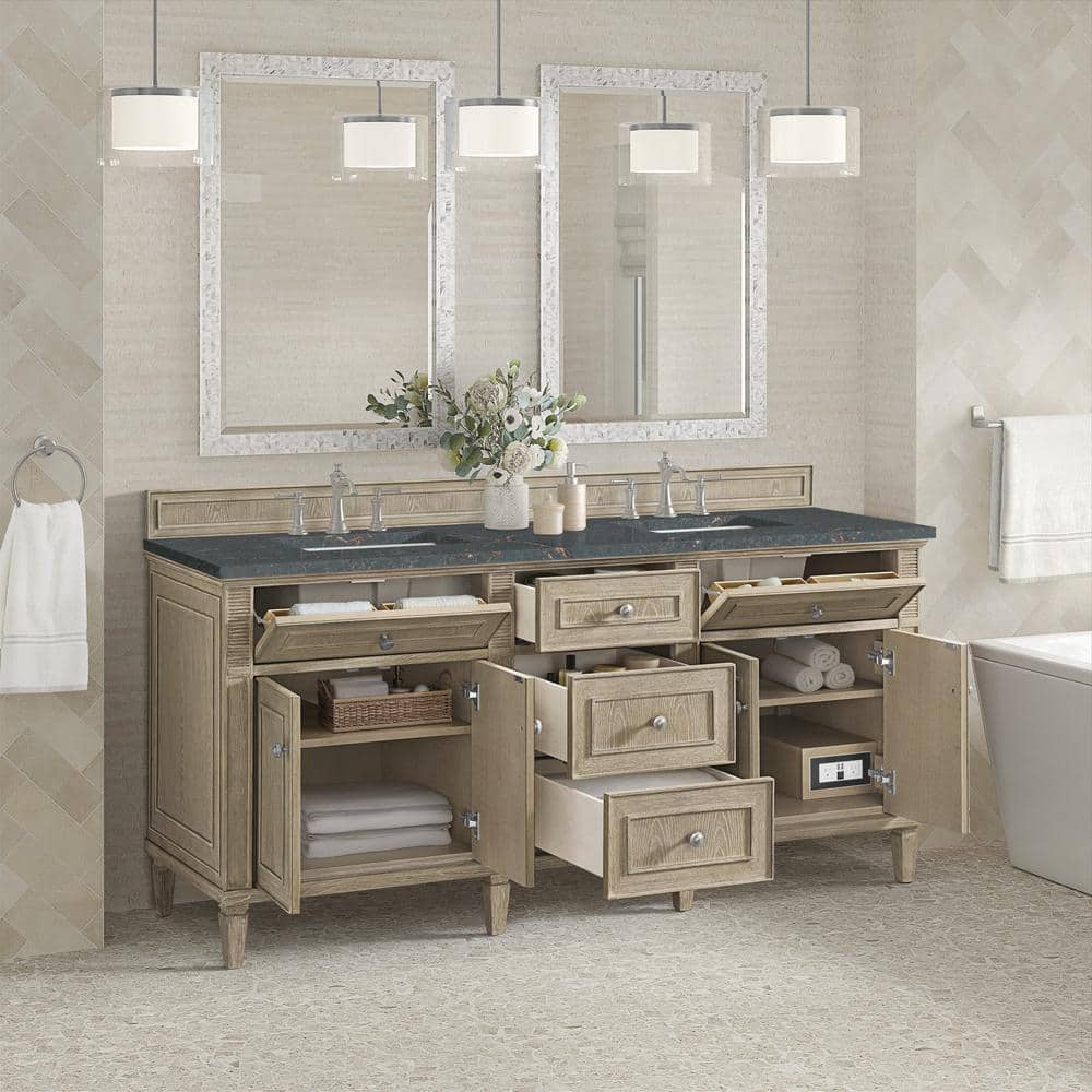 James Martin Vanities Lorelai 72" Double Bathroom Vanity in Whitewashed Oak with Parisien Bleu Quartz Top