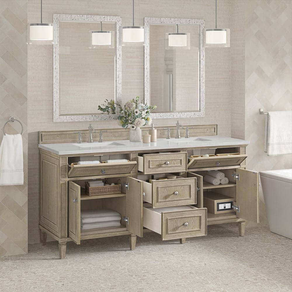 James Martin Vanities Lorelai 72" Double Sink Vanity in Whitewashed Oak with Arctic Fall Top