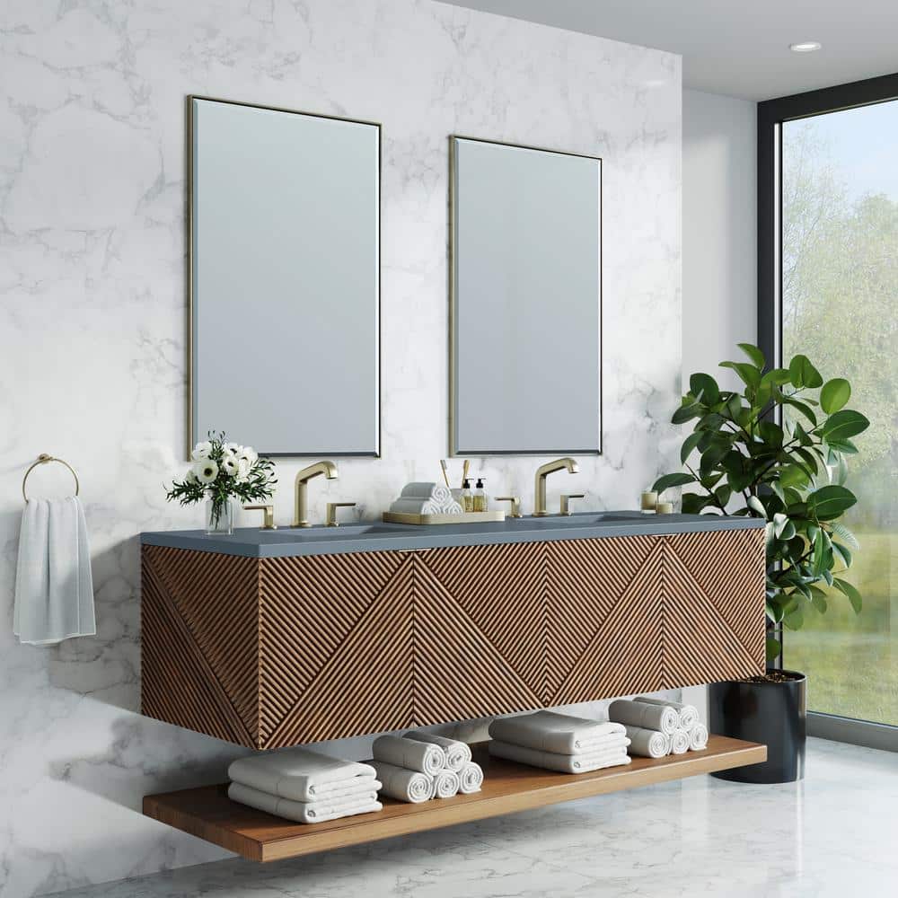 Modern Appeal: Wall-mounted design with Champagne Brass tab-style door pulls.
