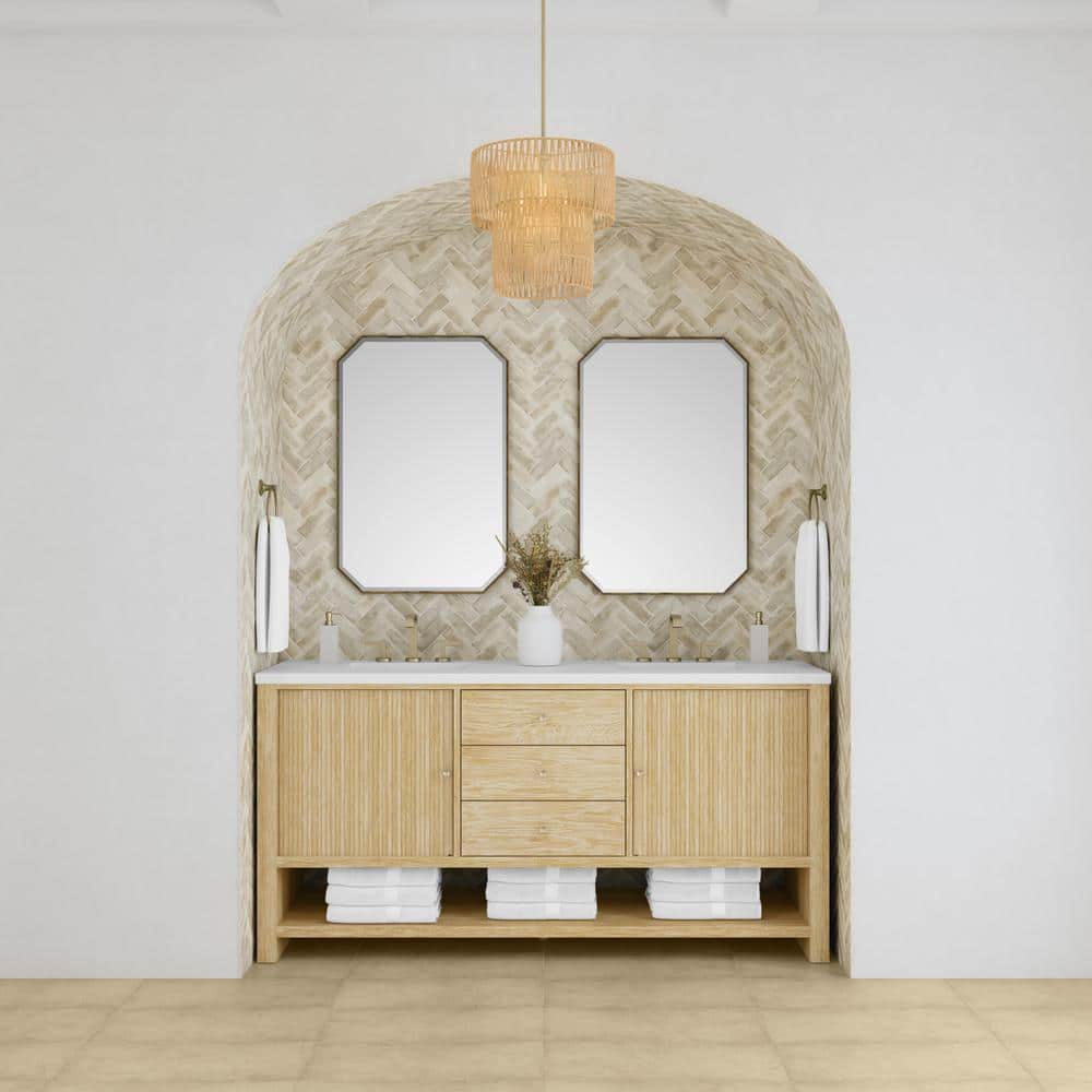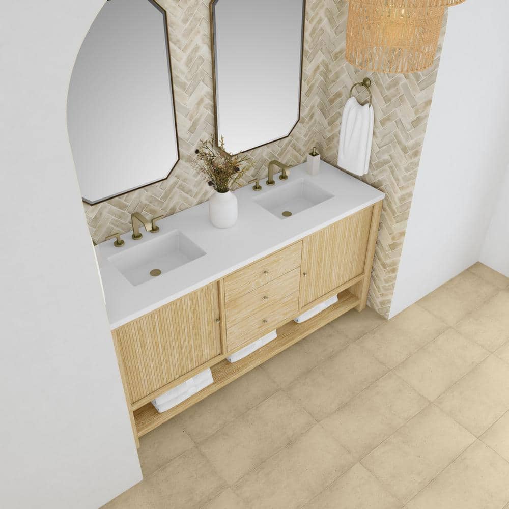 The Marigot Double Bathroom Vanity combines elegant design with practical functionality. Featuring a Sunwashed Oak finish and a White Zeus Quartz top, it includes tambour doors, ample storage, and integrated power outlets for convenience.