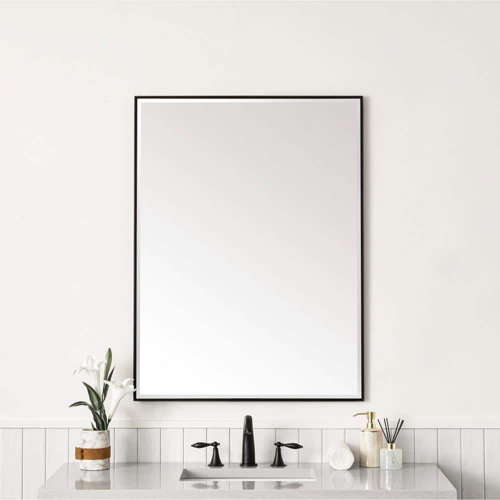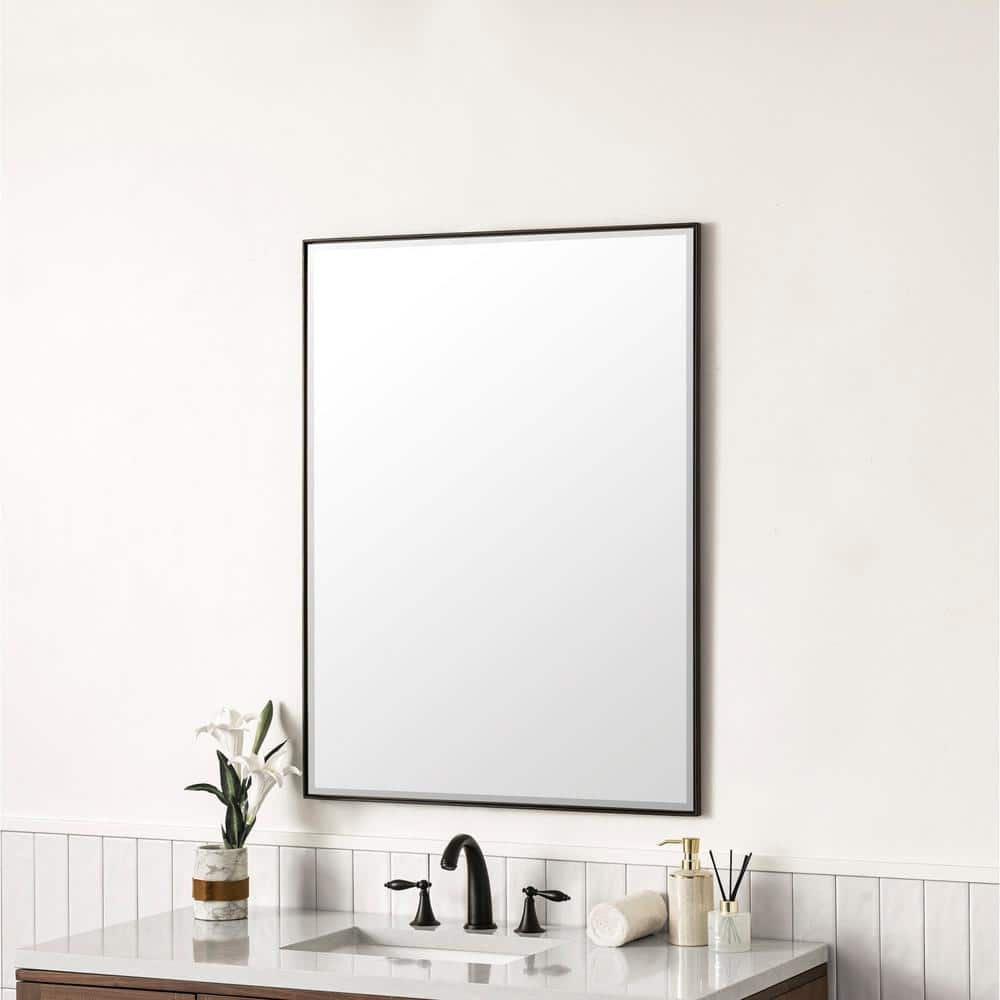 The James Martin Vanities Rohe mirror features a sleek matte black stainless steel frame and a beveled glass design, perfect for modern bathrooms and living spaces. Its versatile mounting options and elegant simplicity make it a stylish and functional addition to any room.