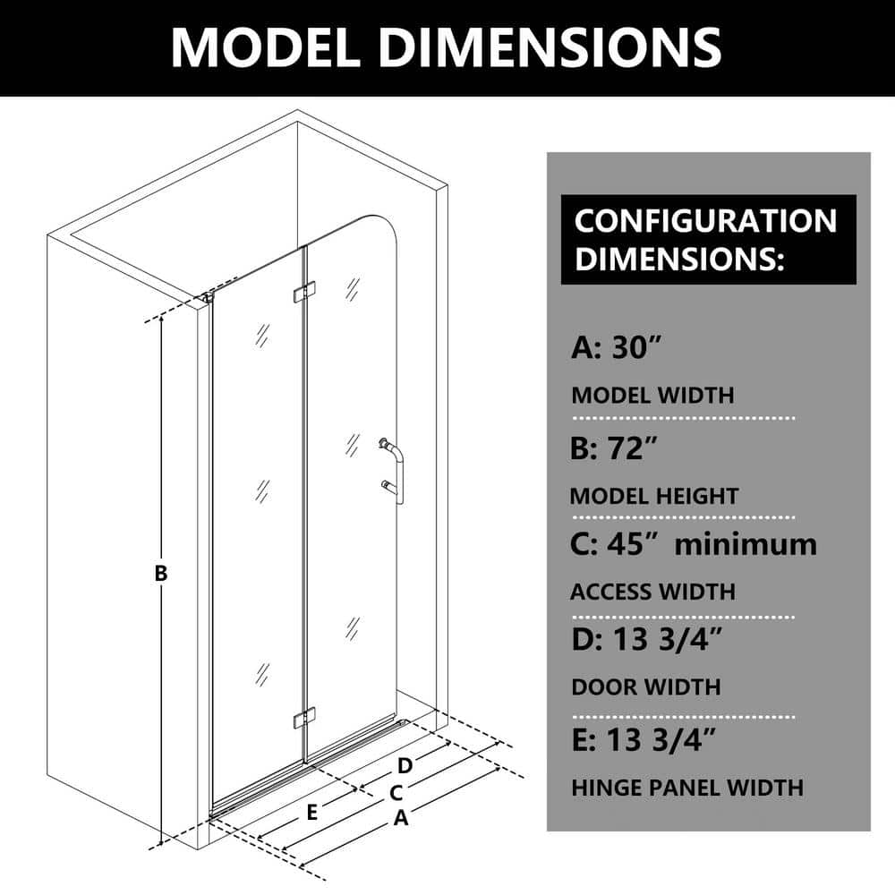 Elevate your bathroom with the JimsMaison 30 x 72 Inch Bifold Semi-Frameless Shower Door. Its space-saving folding design, paired with a sleek chrome finish and clear tempered glass, offers both functionality and style. Ideal for modern bathrooms, this durable door enhances bathroom elegance while providing easy access.