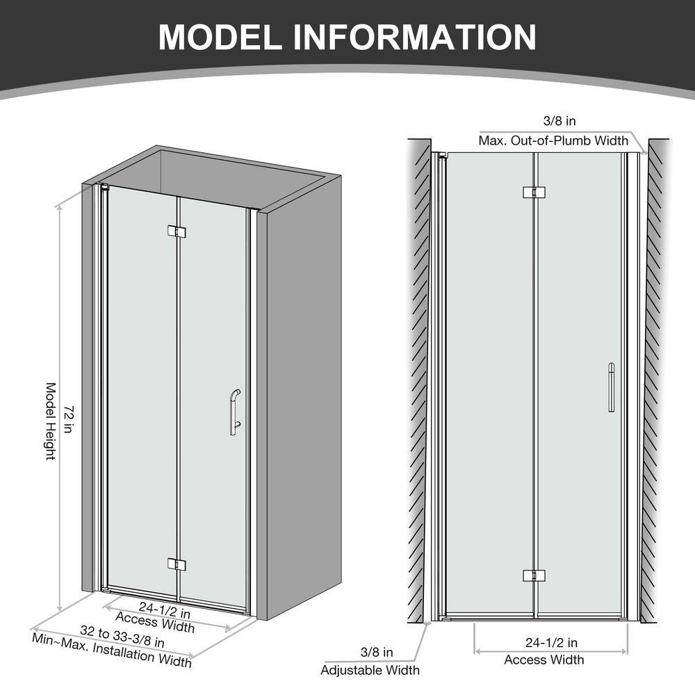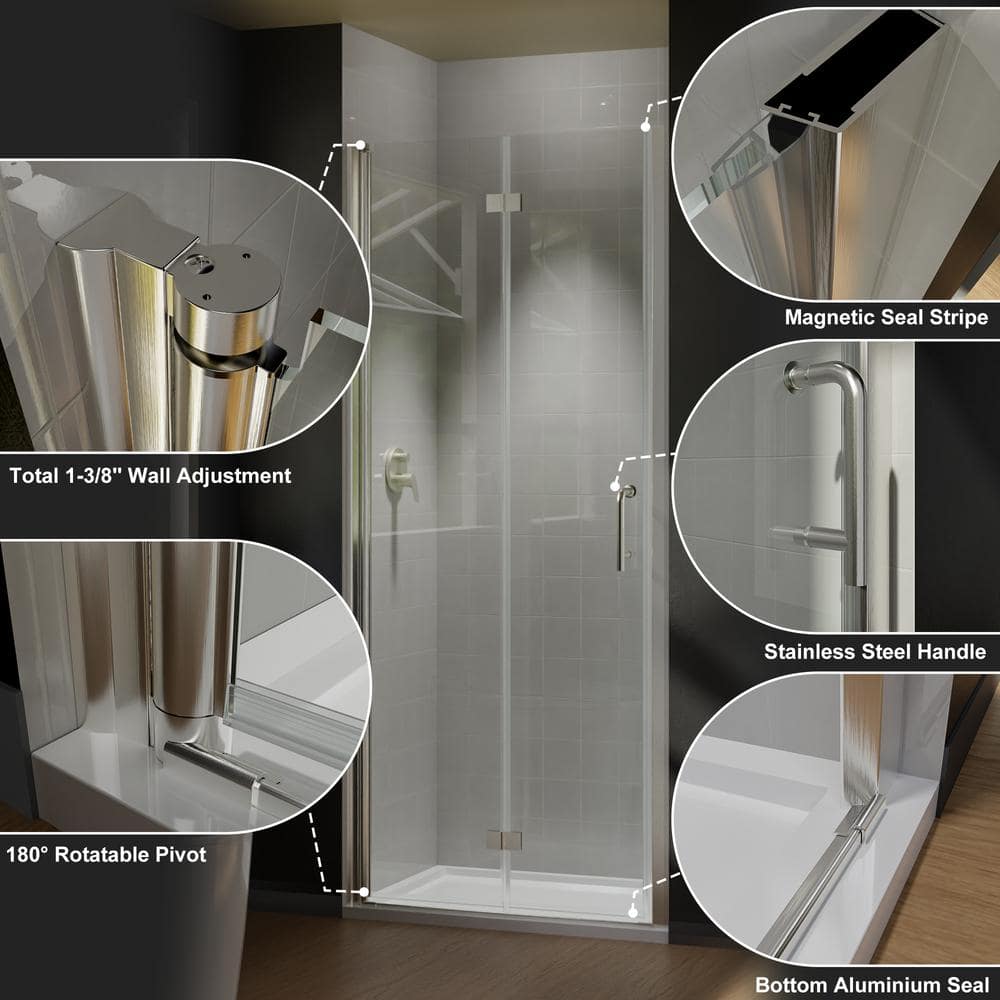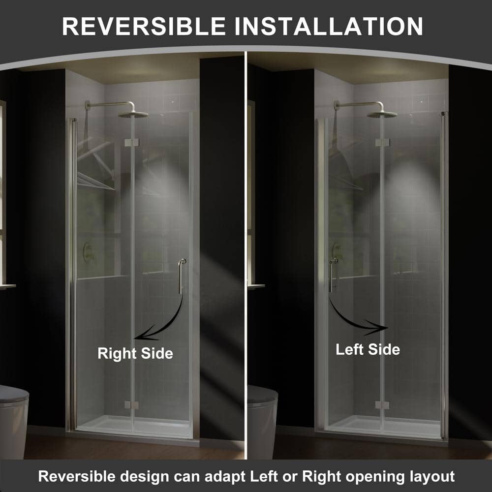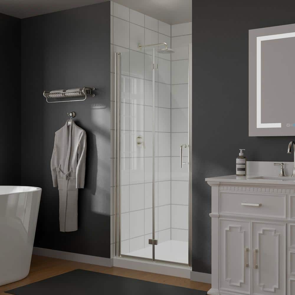 Enhance your bathroom with the JimsMaison Bifold Semi-Frameless Shower Door crafted in a chic Brushed Nickel finish. This elegant door features clear tempered glass for a sleek and modern aesthetic. With its space-saving bi-fold design, it offers both flexibility and style, bringing a touch of sophistication to any shower space.