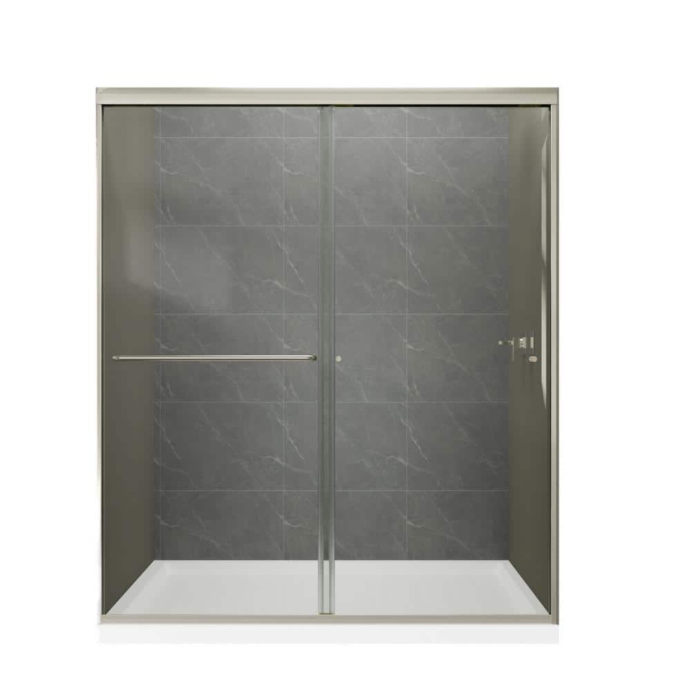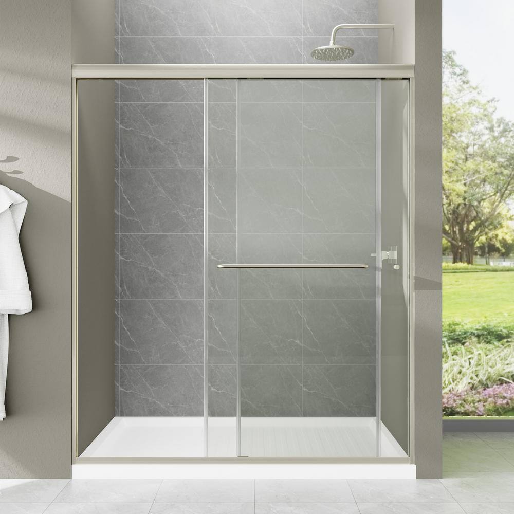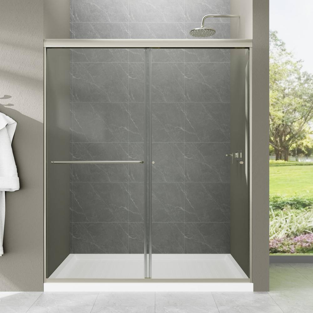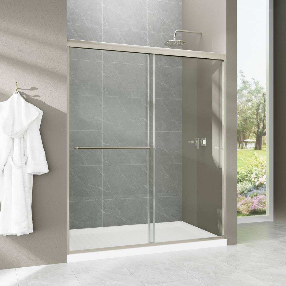 Elevate your bathroom's style and functionality with the JimsMaison 60x70 Pivot Semi-Frameless Shower Door. Its brushed nickel finish and clear tempered glass create an elegant, modern look. Designed with a soft-closing system, it ensures a sleek and safe shower experience.