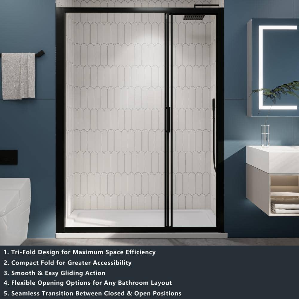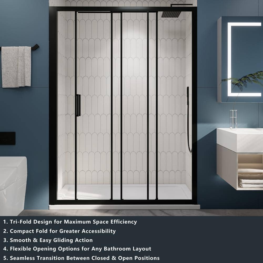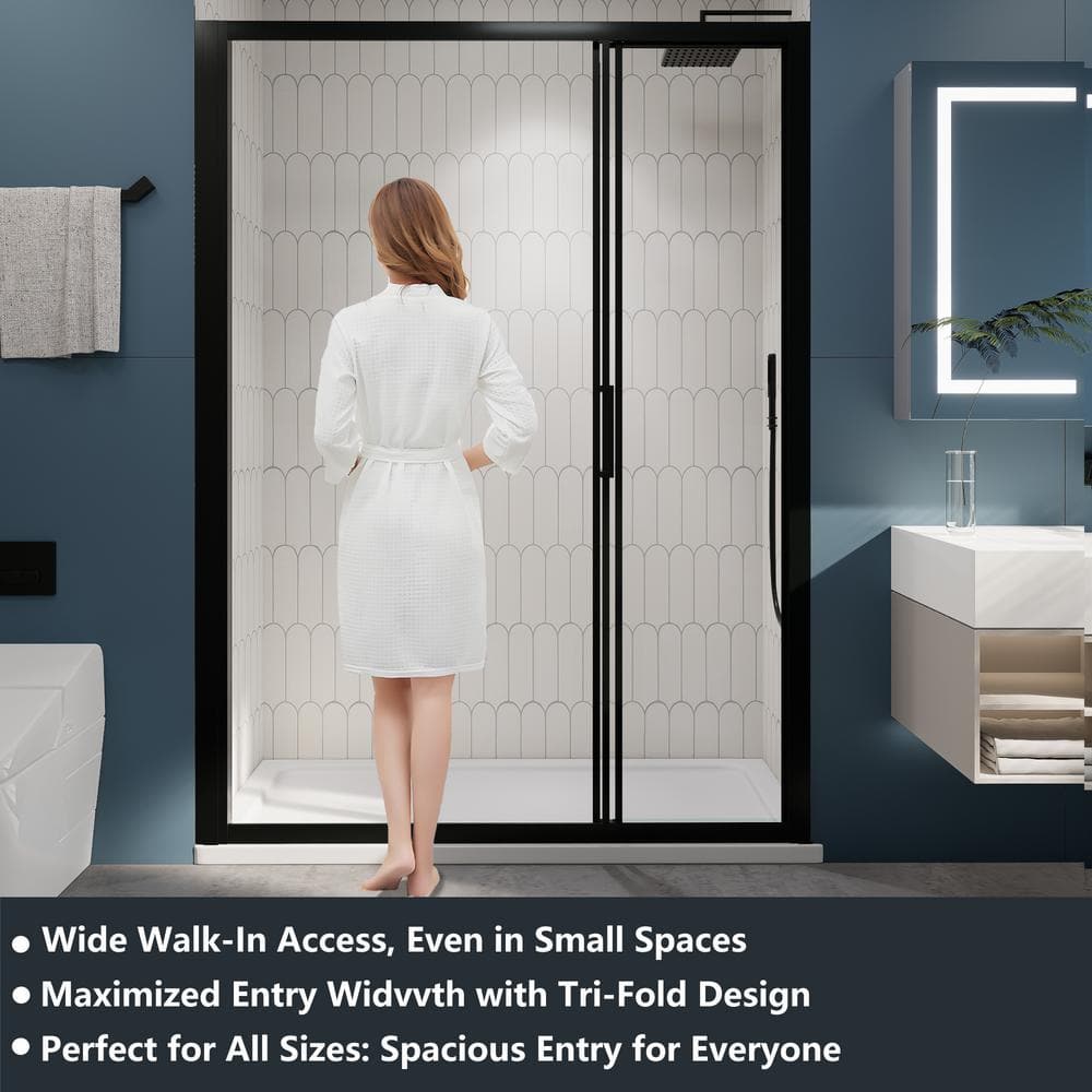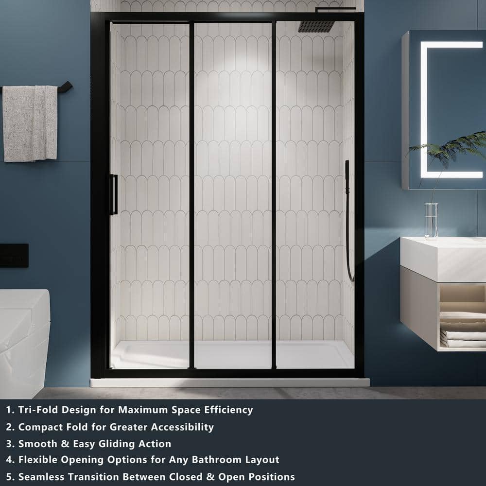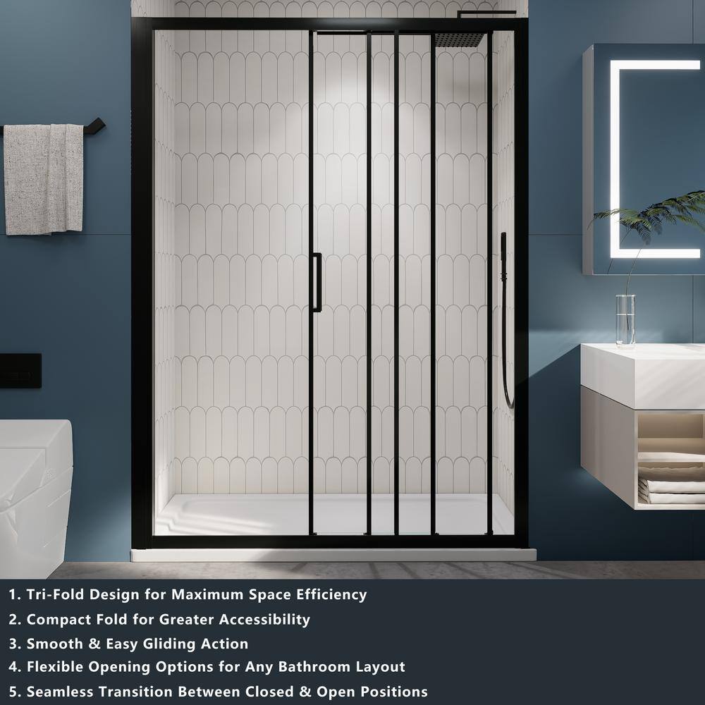 Step into sophistication with this stunning 3-panel sliding shower door, where form meets function. Its matte black finish creates a bold statement, effortlessly elevating any modern bathroom decor. Embrace the fluidity of its sliding panels as a space-saving marvel, perfect for tight quarters or luxurious spa-like retreats. This door isn't just functional; it’s a gateway to transforming your space into a serene and stylish oasis.