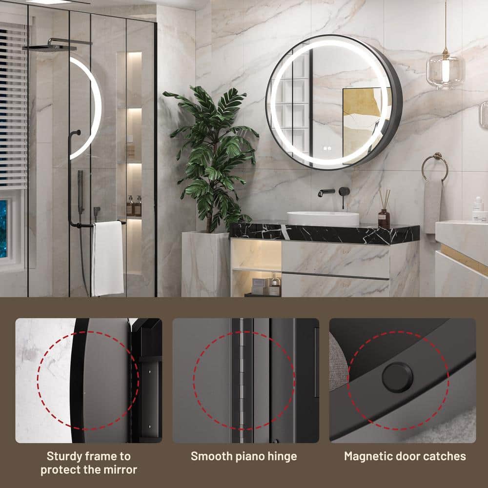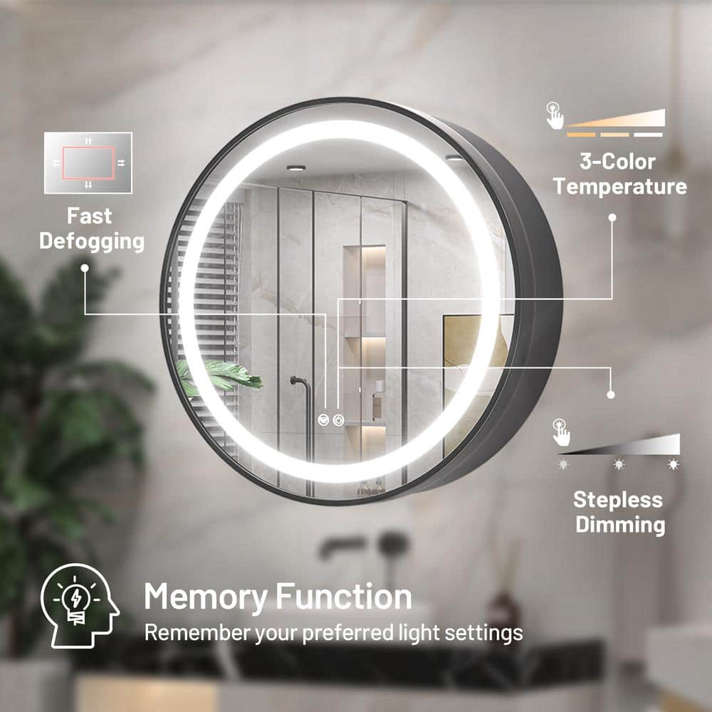 KeonJinn 24 in. W x 24 in. H Round Black Metal Framed Surface Mount Medicine Cabinet with Mirror LED Lighted 3 Colors Dimmable