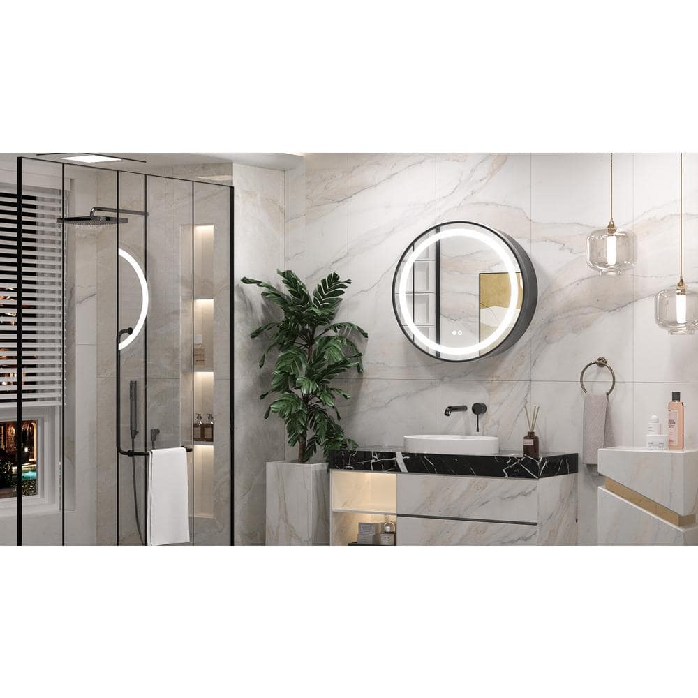 Transform your bathroom into a serene retreat with the sophisticated KeonJinn LED-lighted medicine cabinet. Its round design brings a touch of modern elegance to any space, making it a striking feature against a backdrop of soft tiles. Customize the inner shelving to arrange chic glass bottles or textured towels, while the ambient lighting highlights your unique decor. This cabinet is not just functional; it's a step into luxurious living.