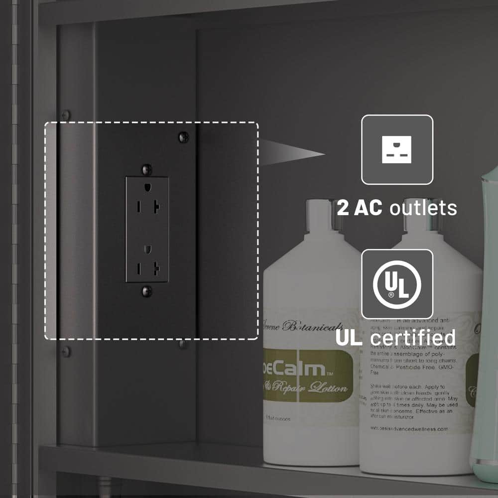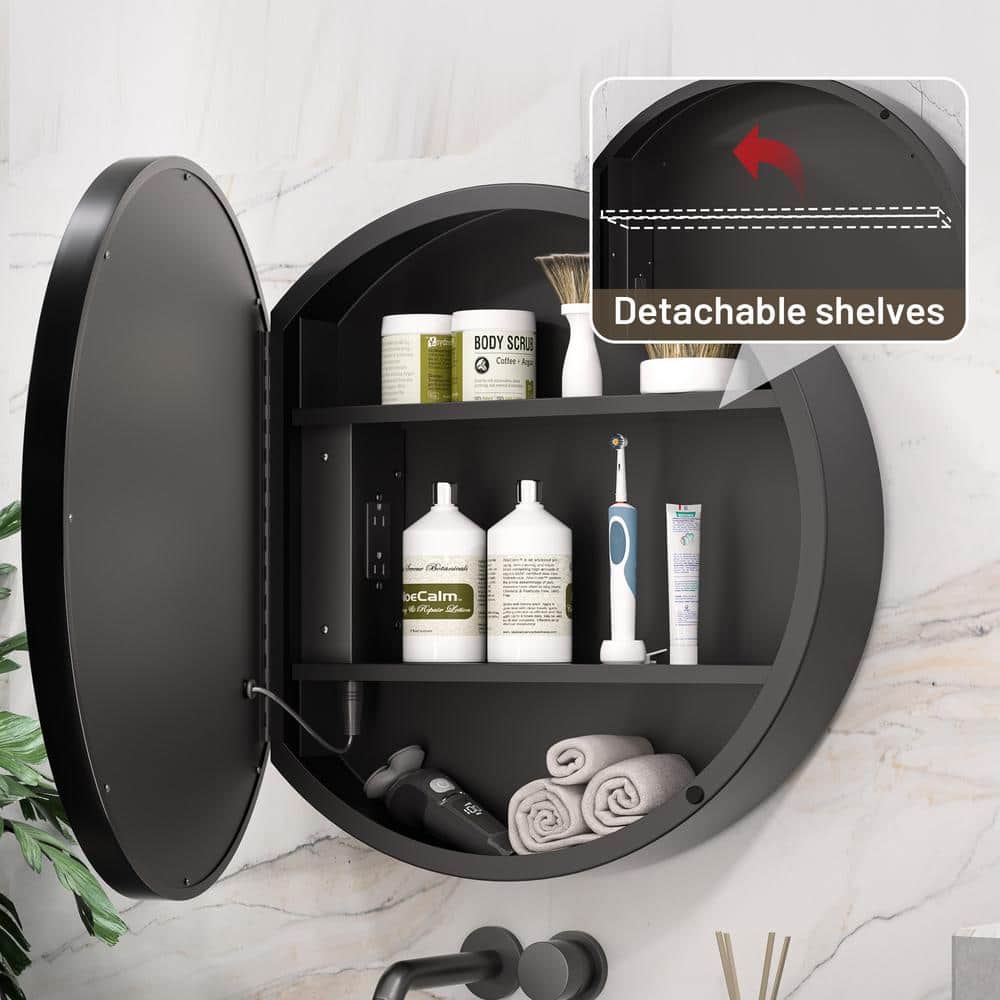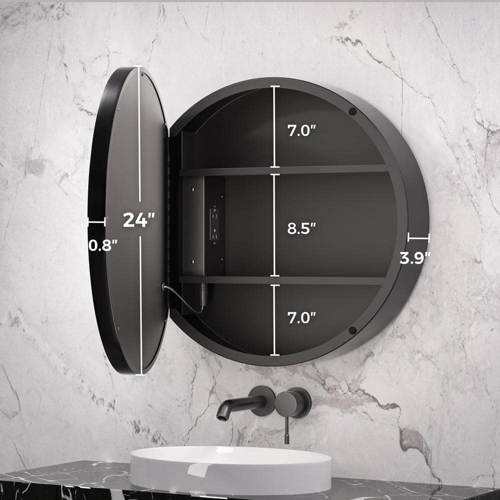 Revitalize your bathroom space with the KeonJinn 24x24 Round Medicine Cabinet with an LED Mirror. This sleek, black metal-framed cabinet features customizable lighting with 3 dimmable color settings, a safe anti-fog function, and flexible storage solutions. Designed for today's high-tech convenience, it also includes built-in outlets and USB ports for easy device charging.