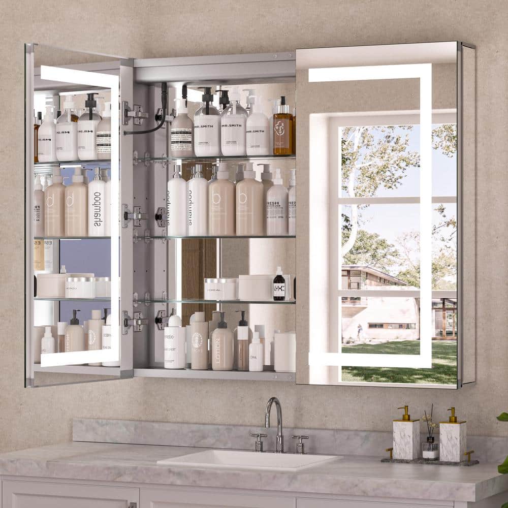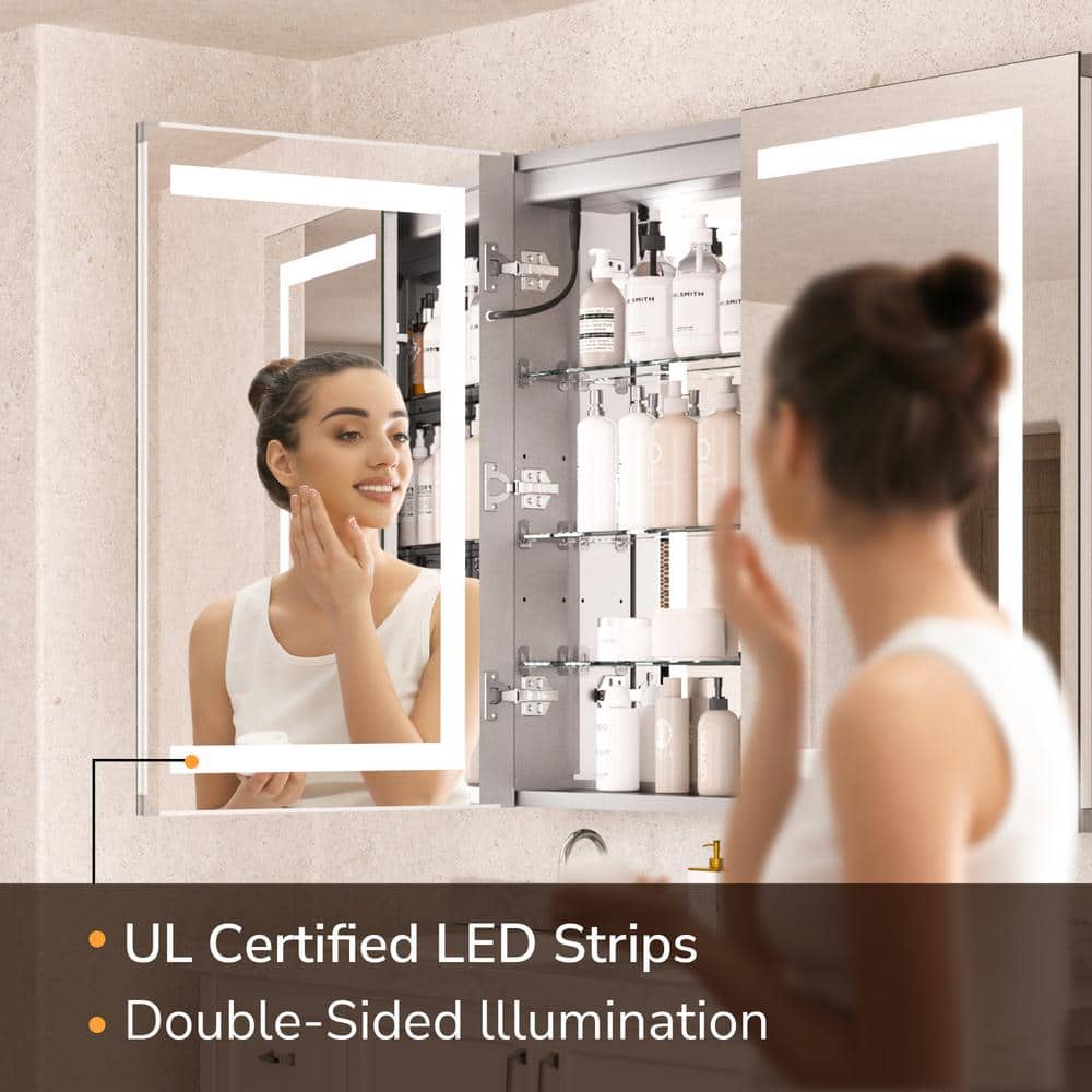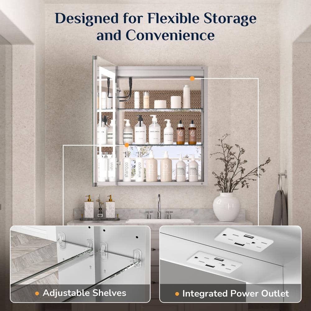 Illuminate and streamline your bathroom with the KeonJinn LED Lighted Anti-Fog Medicine Cabinet. With LED mirrors on both sides, built-in outlets, and adjustable glass shelves, this cabinet offers versatile storage and modern elegance. Its anti-fog tempered glass and customizable light settings make it the perfect addition for any contemporary bathroom.