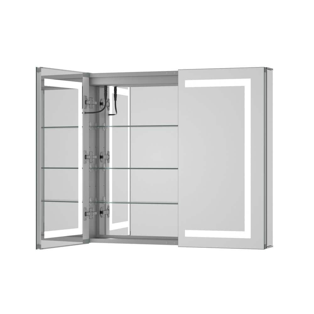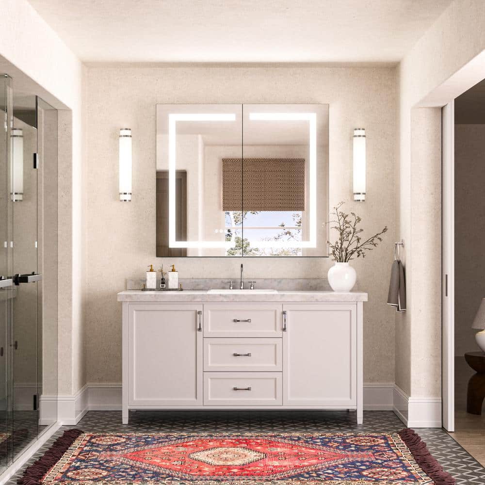 Embrace elegance with the KeonJinn LED Lighted Anti-Fog Medicine Cabinet—a luminous centerpiece for any modern bathroom. Its double-sided illumination bathes the room in a customizable glow, echoing the hues of dawn or the cool tones of daylight. Artfully crafted with sleek aluminum, the cabinet’s mirror transforms routine grooming into a luxurious ritual. Its anti-fog feature ensures that the mirror remains pristine, inviting you to a daily moment of clarity and style. Elevate your space into a sanctuary of reflection and refinement—true sophistication awaits.