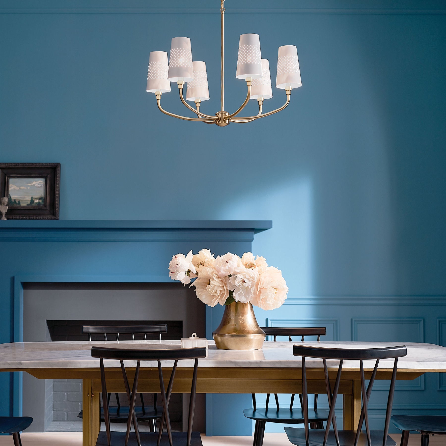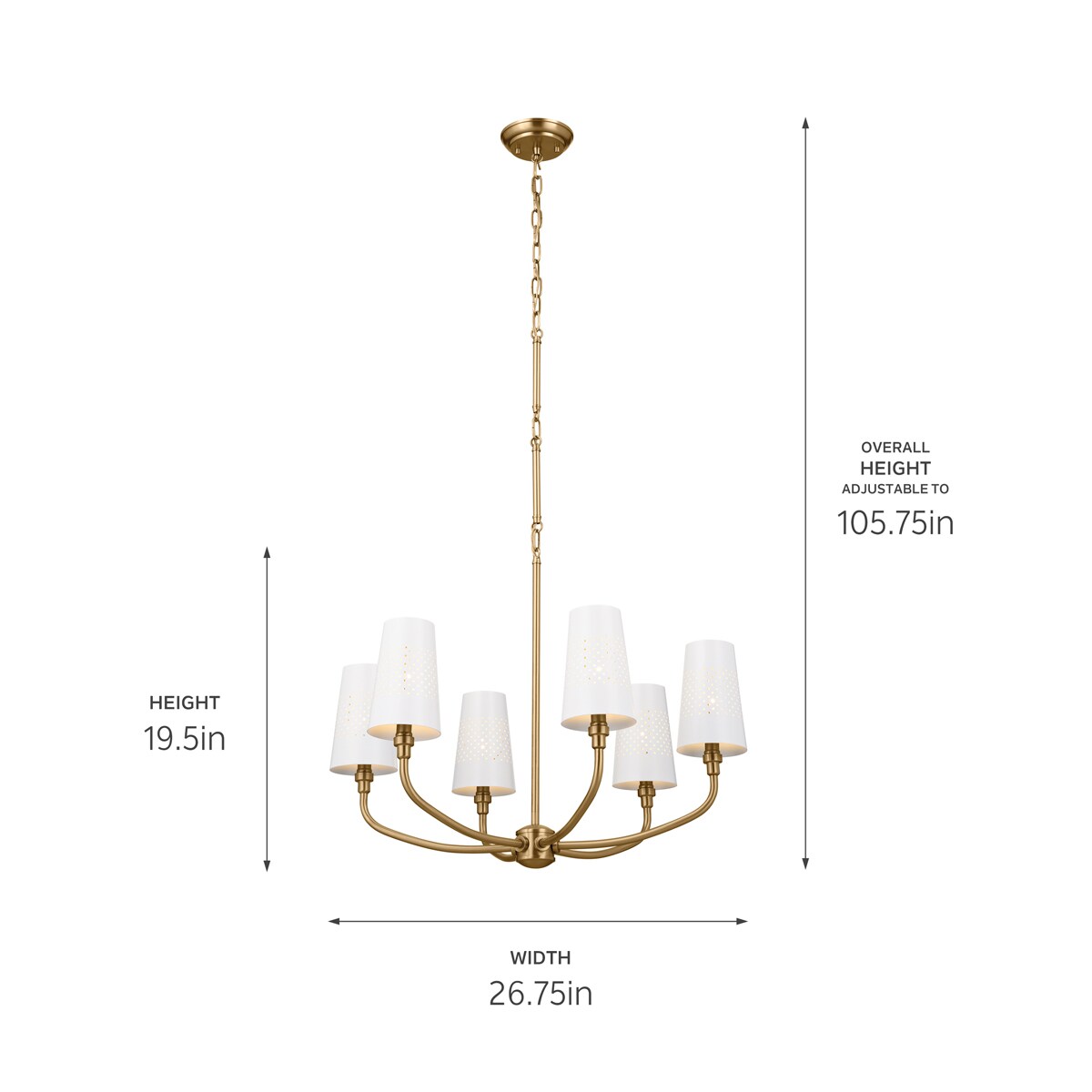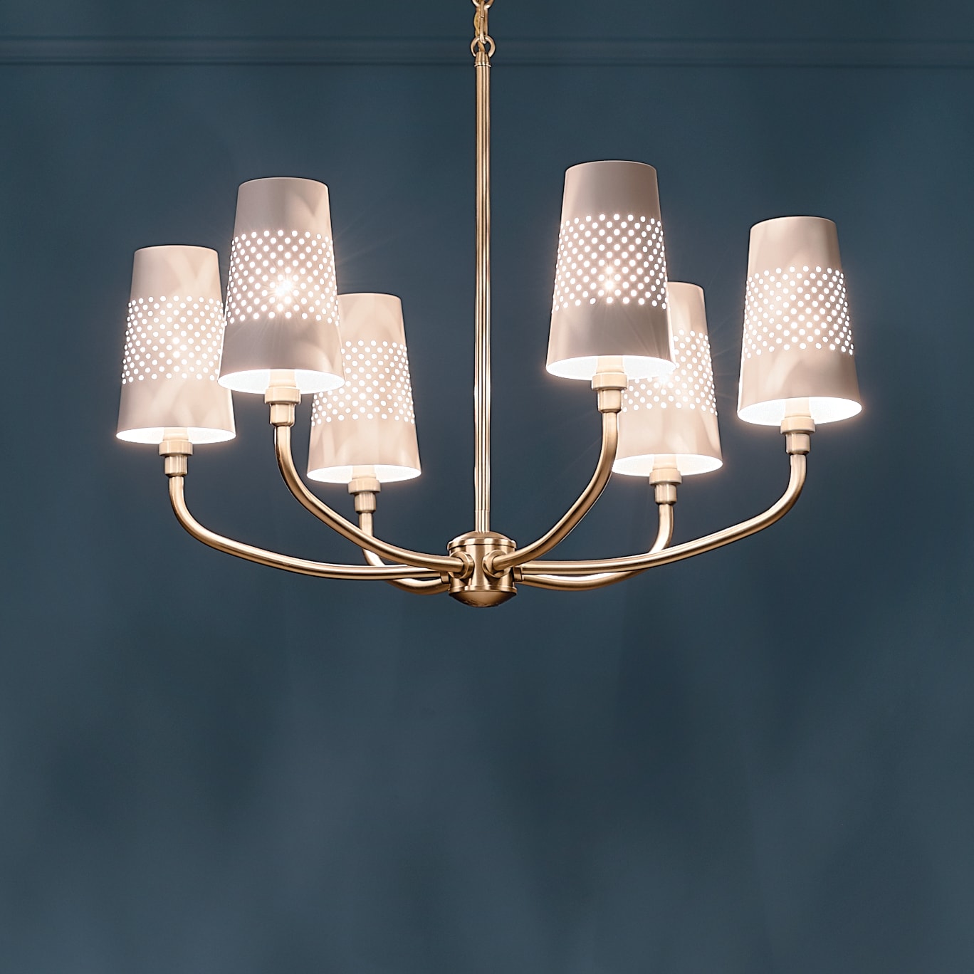 Illuminate your space with the Kichler Adeena 6-Light Brushed Brass Chandelier, exuding timeless elegance and modern sophistication. Crafted from durable steel in a warm brushed natural brass finish, this traditional chandelier creates a cozy and romantic ambiance with its perforated metal shades.