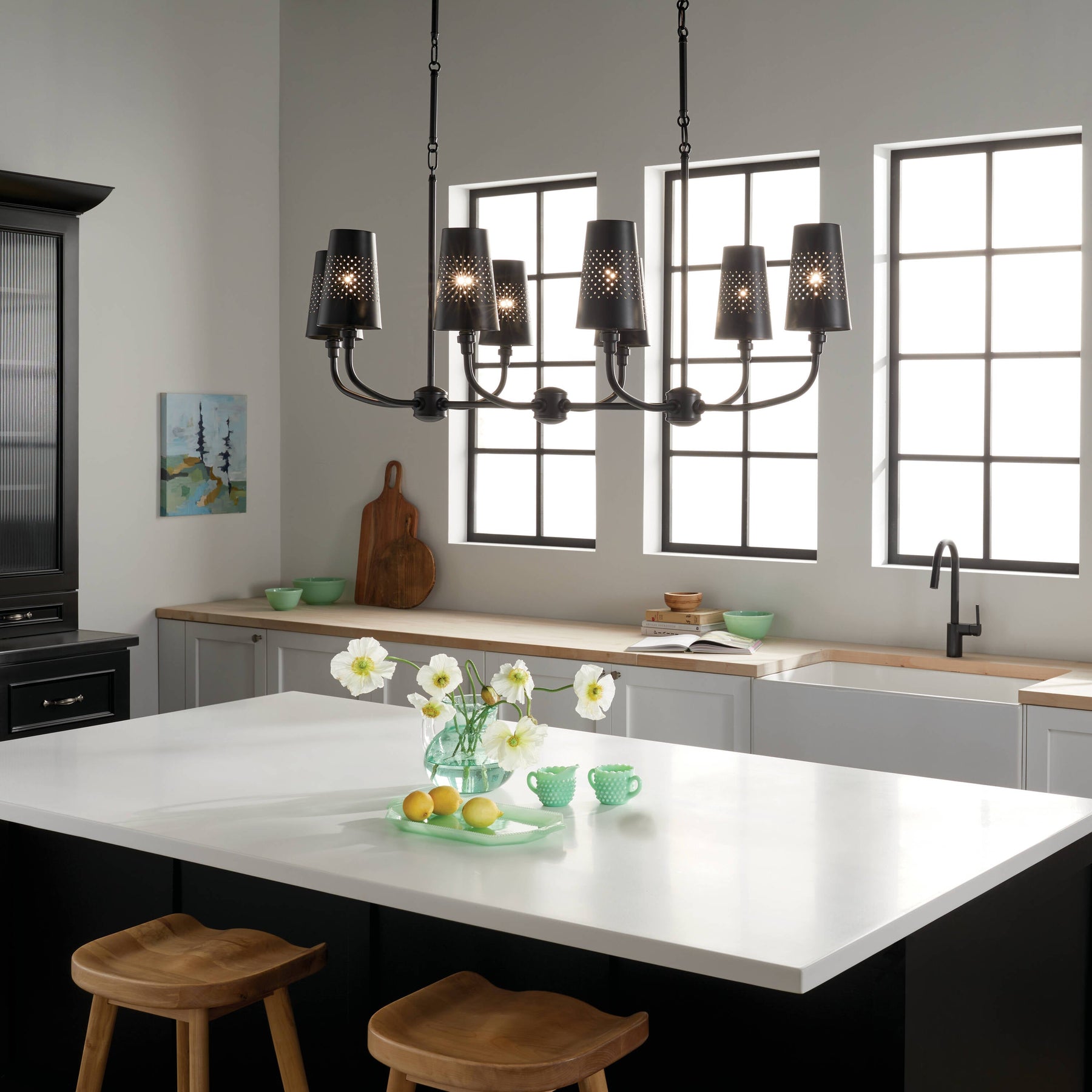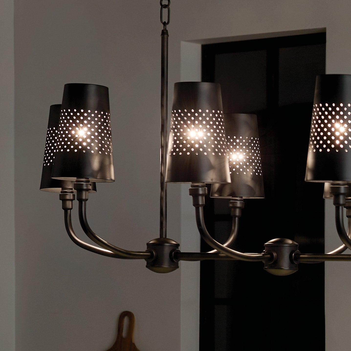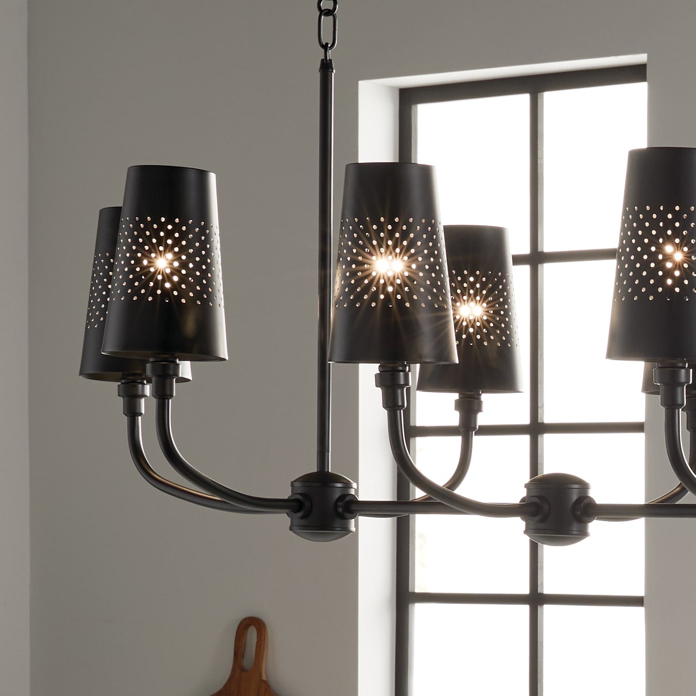 Illuminate your space with the elegant charm of the Kichler Adeena 8-Light Black Traditional Chandelier. Its steel construction and perforated metal shades create a sophisticated ambiance, perfect for enhancing dining rooms, kitchens, and more. This chandelier showcases a timeless design with flexibility in installation to suit any indoor decor.