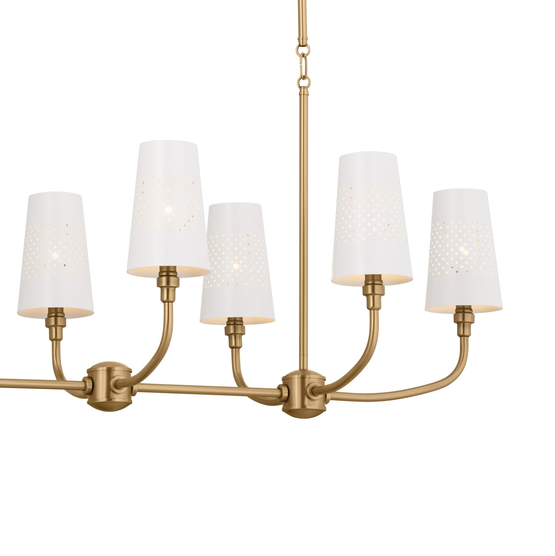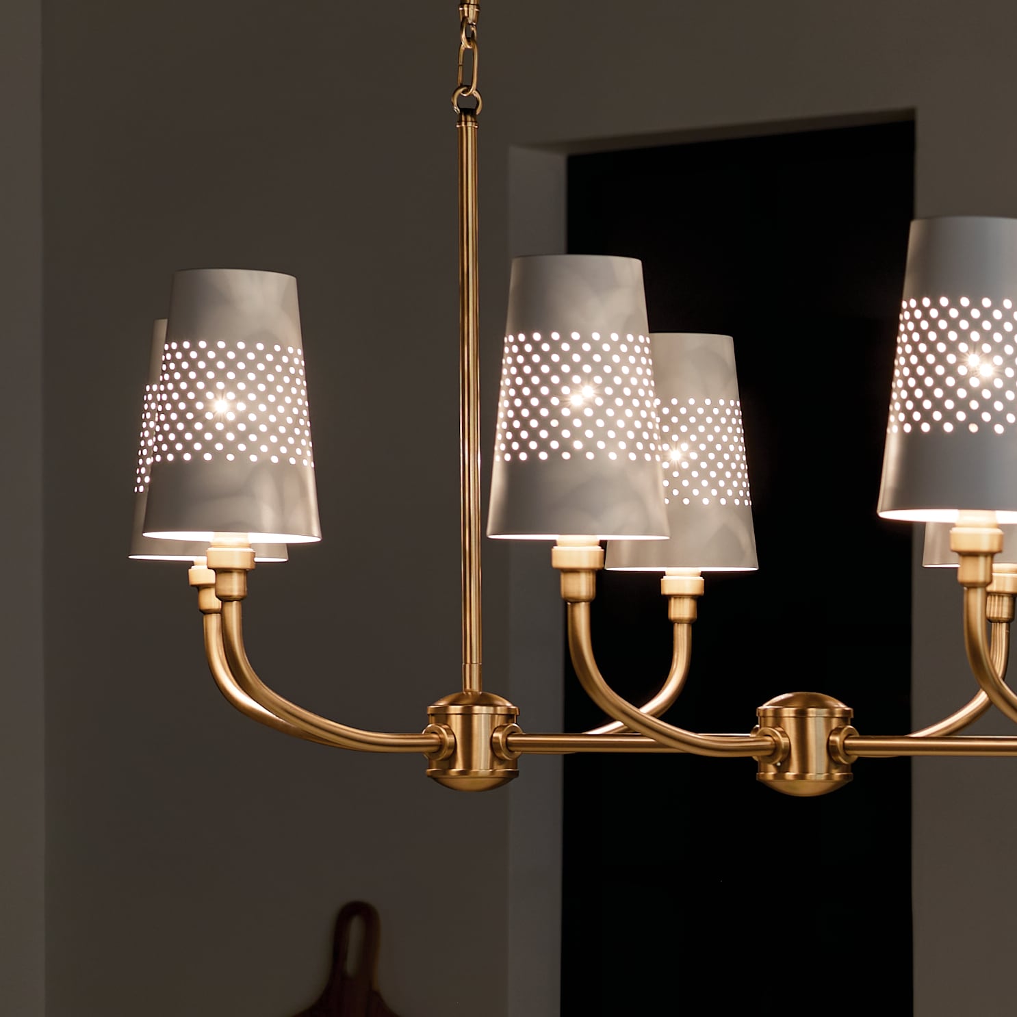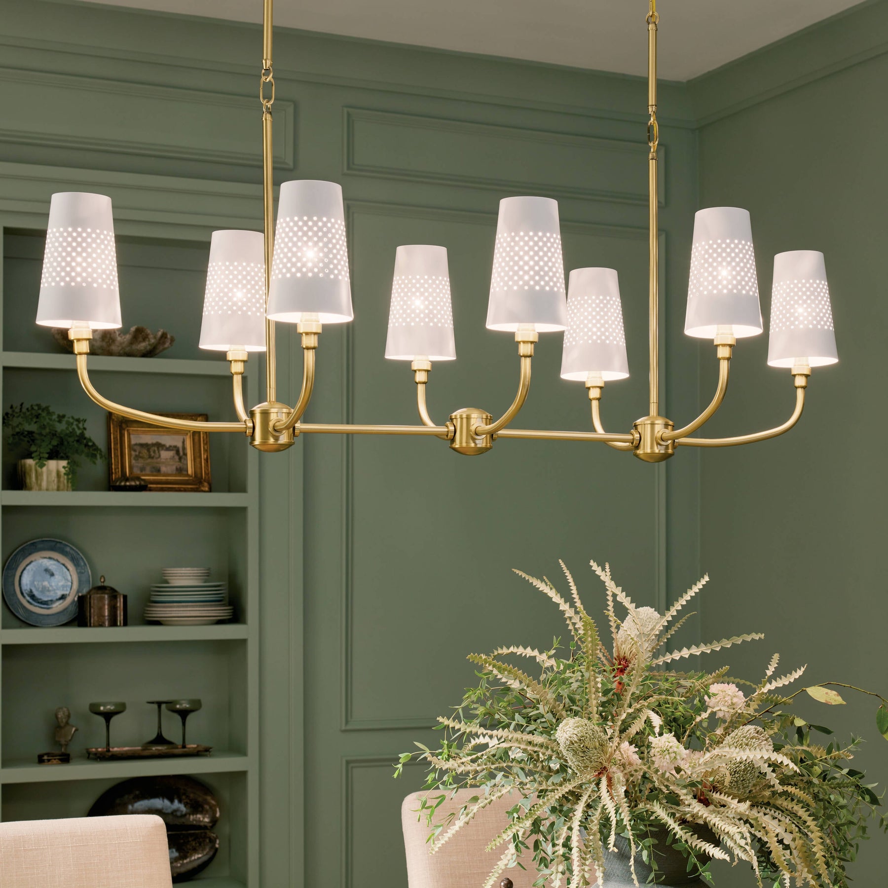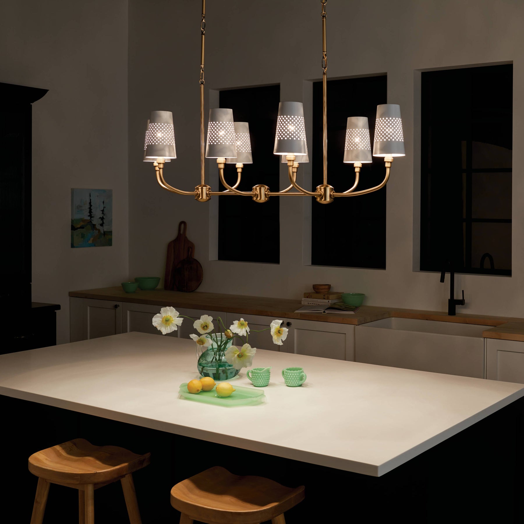 The Kichler Adeena 8-Light Chandelier combines traditional elegance with contemporary flair in a brushed natural brass finish. Its metallized shades with a perforated design allow for diffused lighting, creating a warm, inviting atmosphere ideal for dining and living areas.