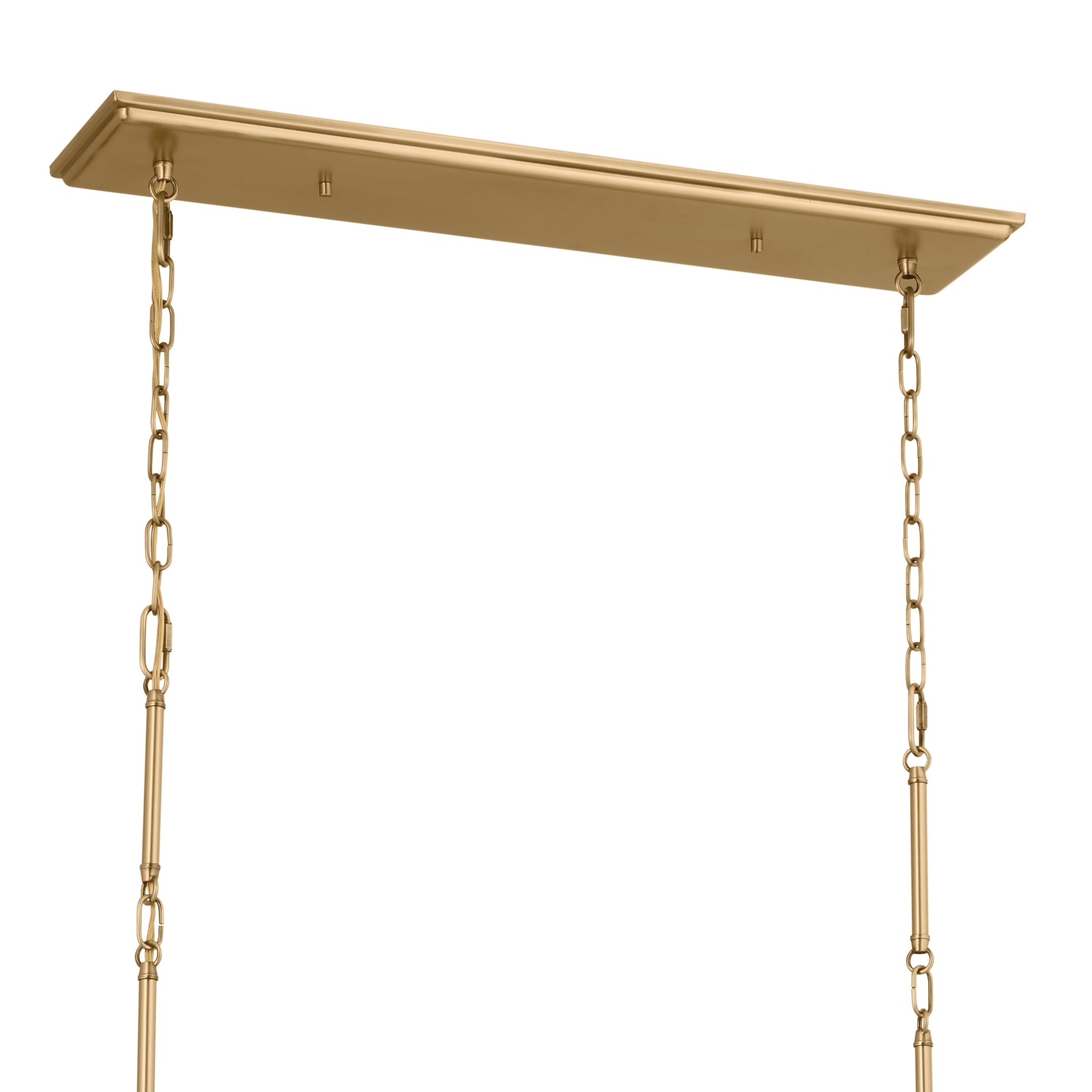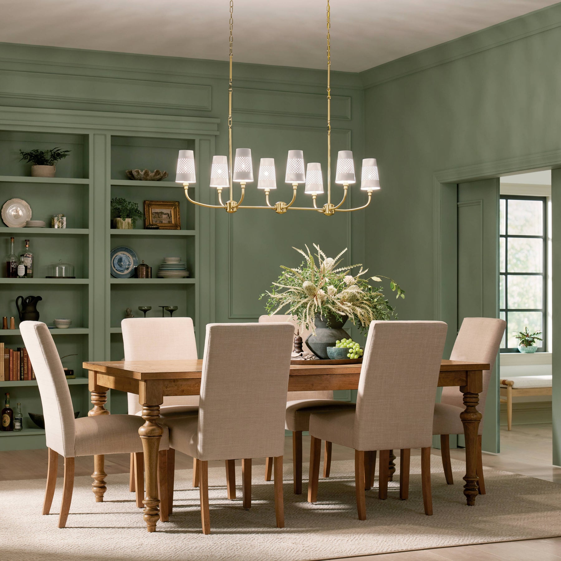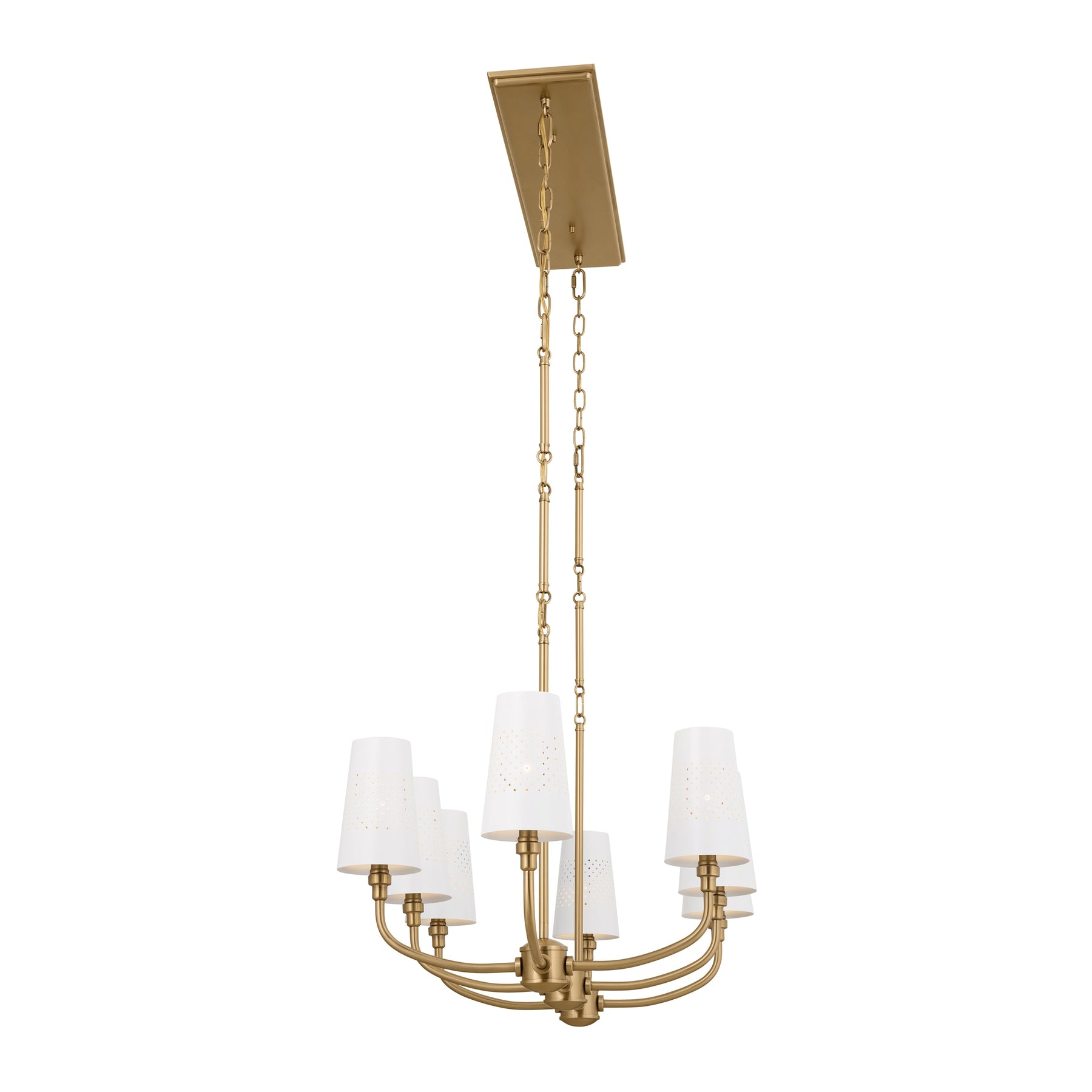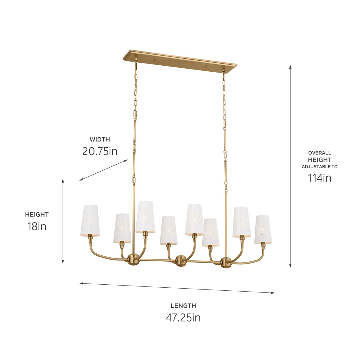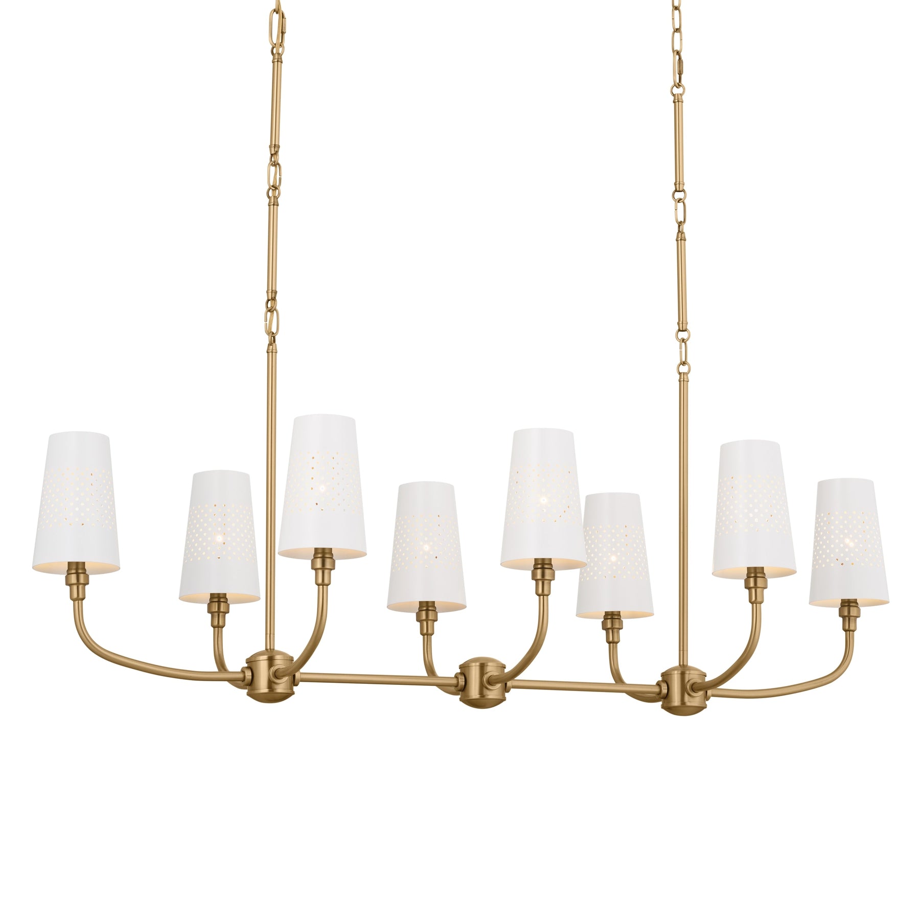The Kichler Adeena 8-Light Chandelier combines traditional elegance with contemporary flair in a brushed natural brass finish. Its metallized shades with a perforated design allow for diffused lighting, creating a warm, inviting atmosphere ideal for dining and living areas.