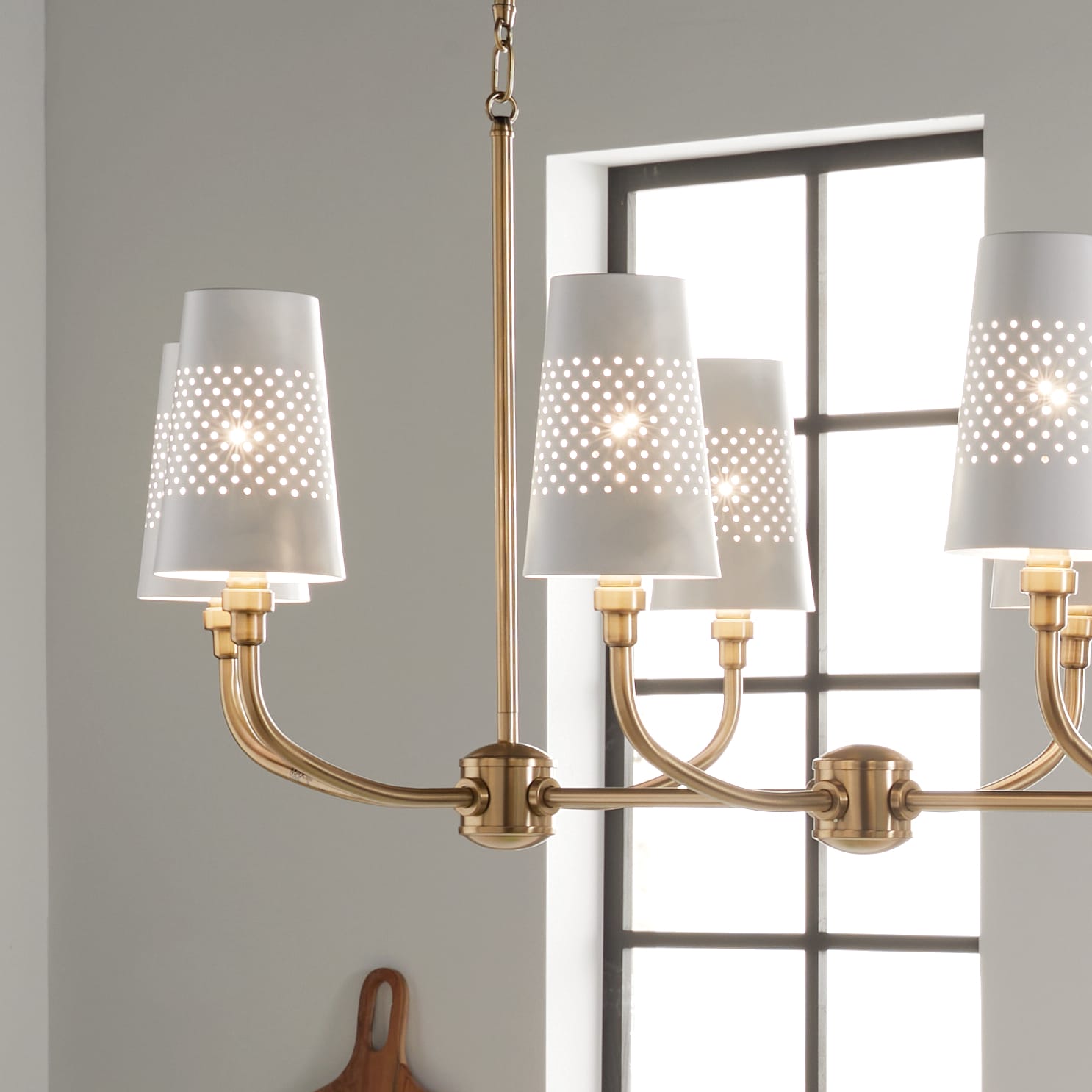 Elevate your space with the Adeena 8-Light Chandelier, a perfect fusion of timeless elegance and modern design. Its brushed natural brass finish captures light, enhancing rich interiors with a gentle luminescence. Imagine this piece gracing a grand dining room, where its perforated shades cast a captivating dance of shadow and light. This chandelier doesn't just illuminate—it transforms, making it an essential focal point in any luxurious home.