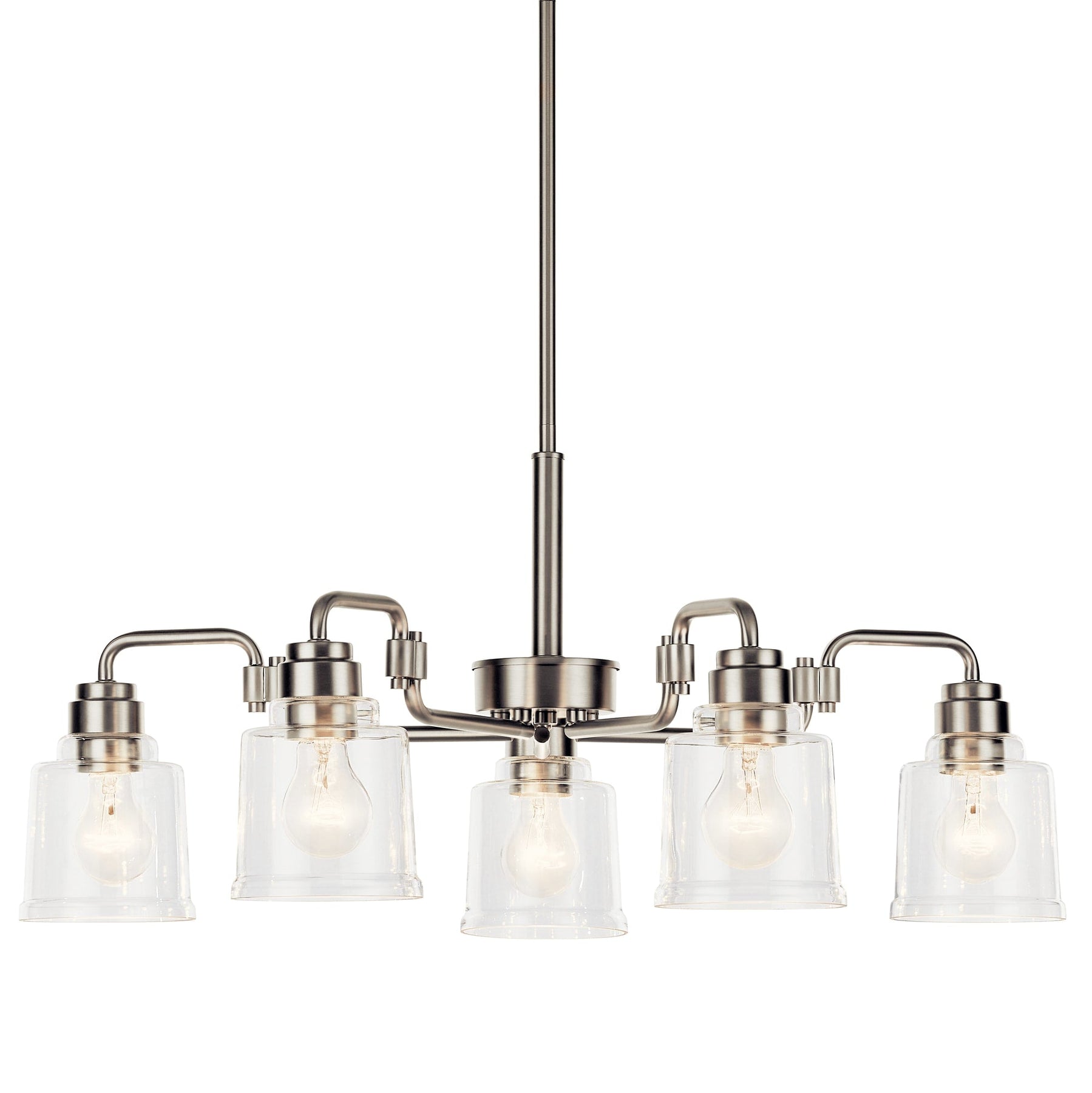 Illuminate your home with the Kichler Aivian 5-Light Chandelier, a perfect blend of vintage charm and contemporary flair. This refined brushed nickel fixture offers versatile lighting solutions with its clear glass shades and customizable hanging length, adapting to a range of interior styles from rustic to modern.