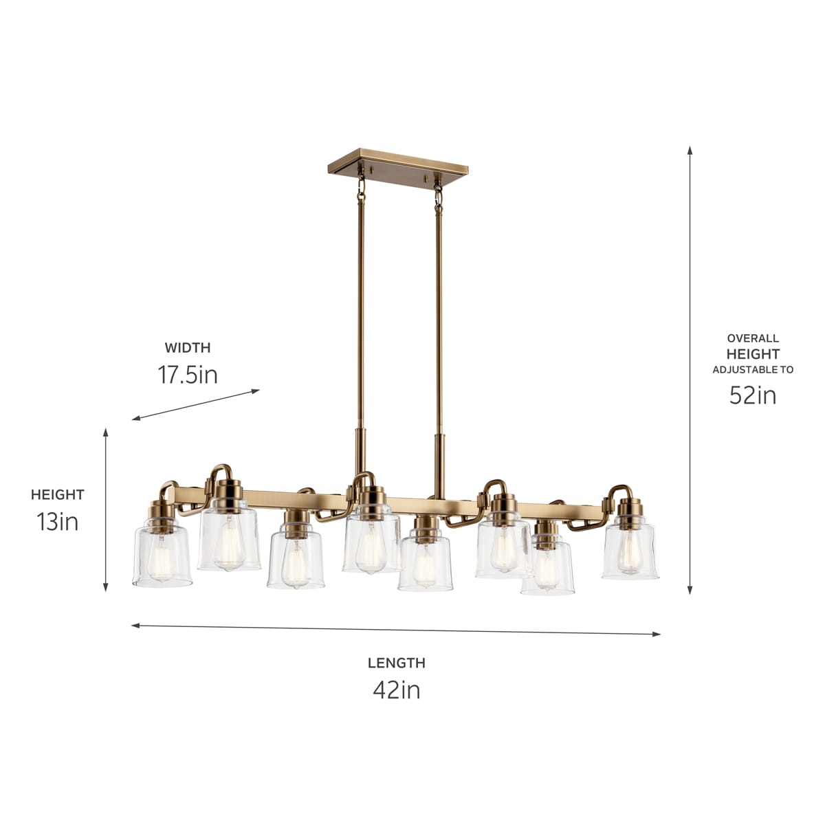 Illuminate your space with the Kichler Aivian 8-Light Industrial Chandelier. With its striking Weathered Brass finish and edgy industrial design, it's perfect for adding a touch of sophistication to rustic, vintage, or modern interiors. Whether for a dining room or kitchen, this linear chandelier is sure to make a bold statement.