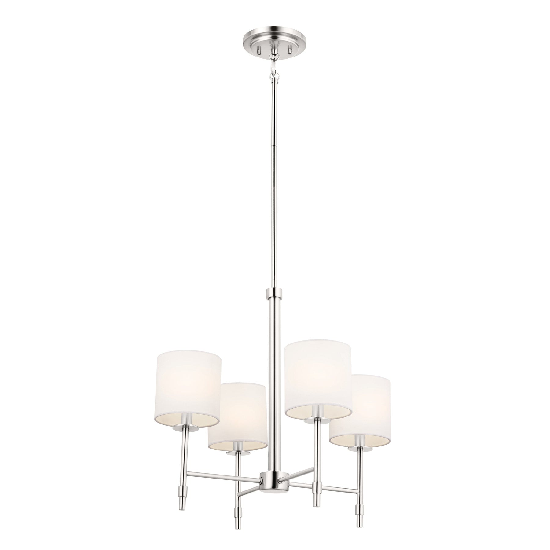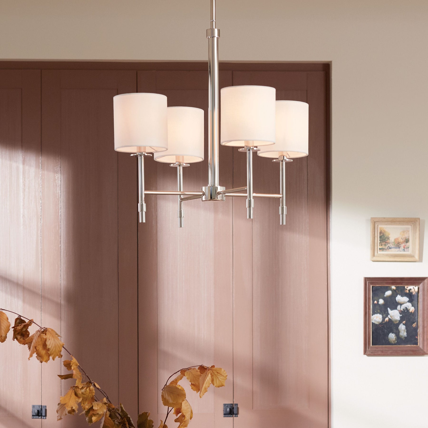 The Kichler Ali 4-Light Chandelier elegantly combines classic aesthetics with modern refinement. Its polished nickel finish adds a touch of sophistication, making it ideal for contemporary and traditional spaces alike. The chandelier features sleek white fabric shades and adjustable hanging heights, perfect for customizing your room's ambiance.