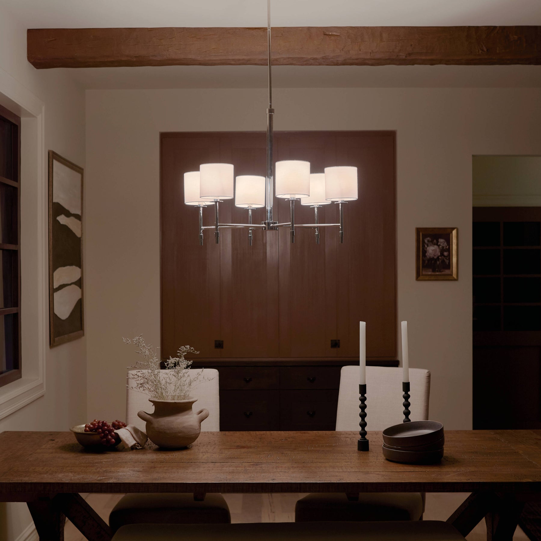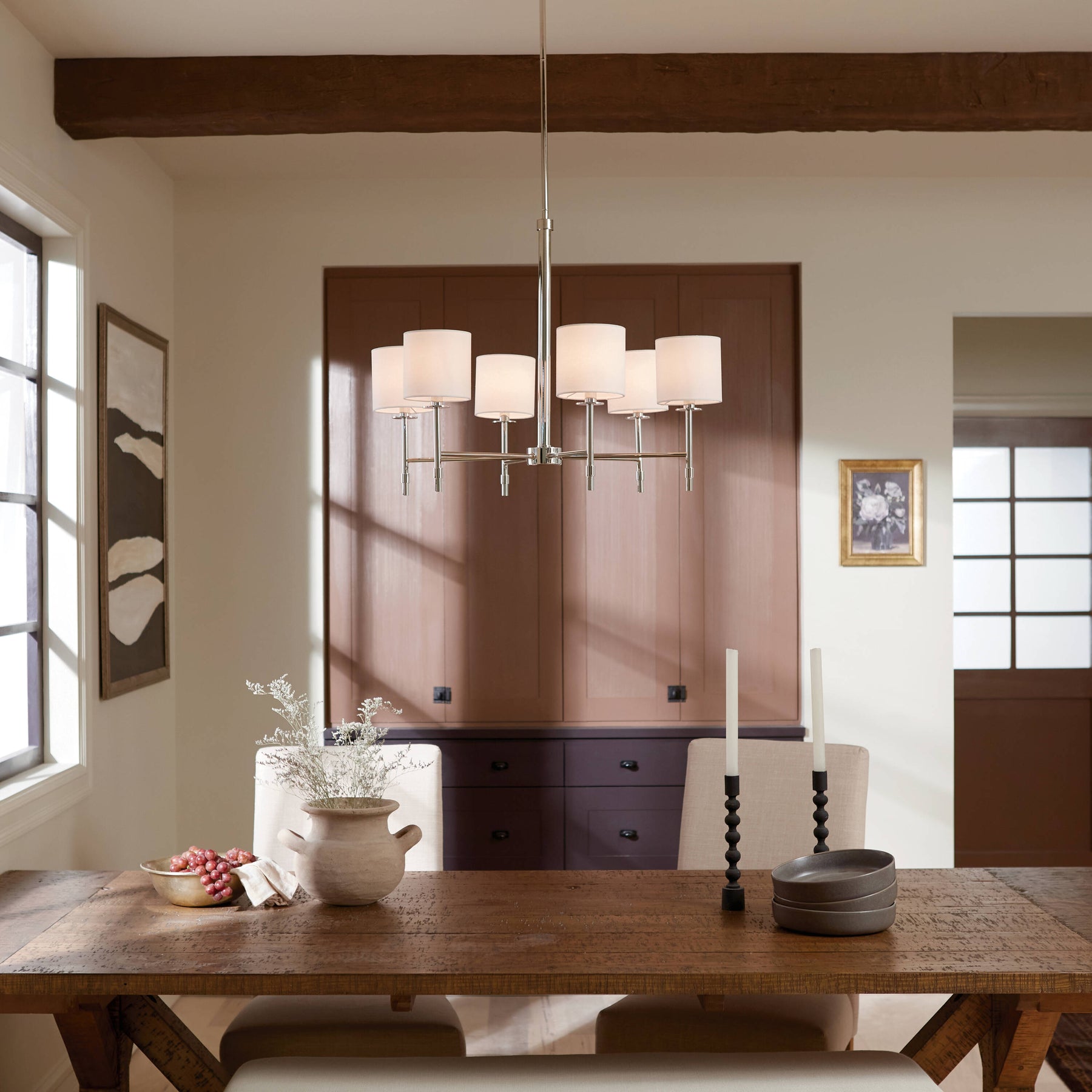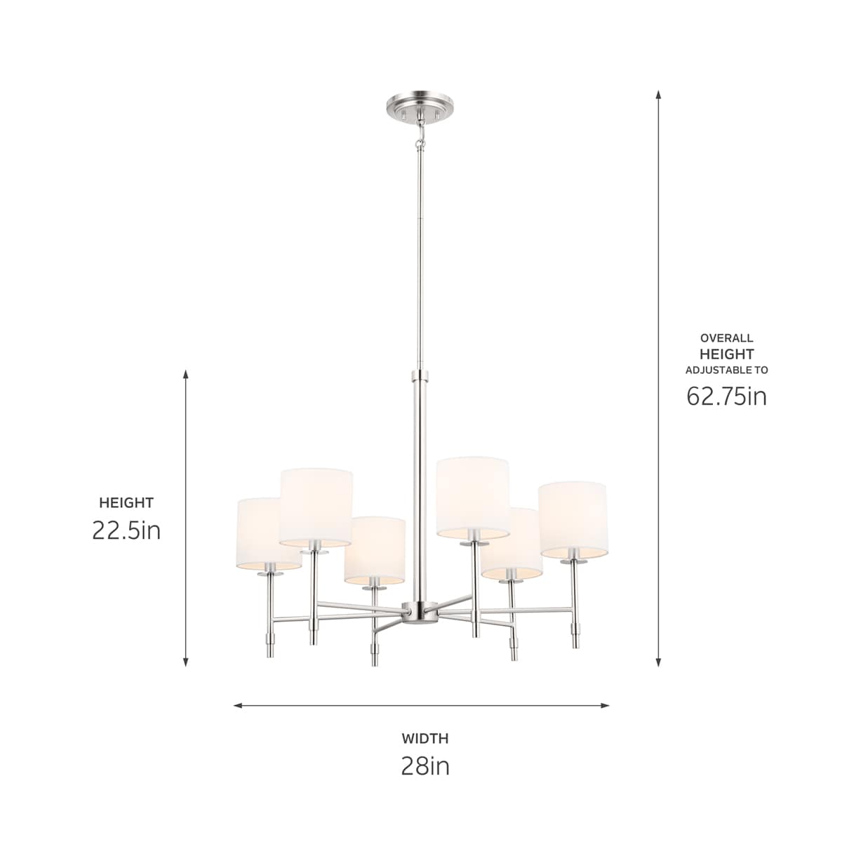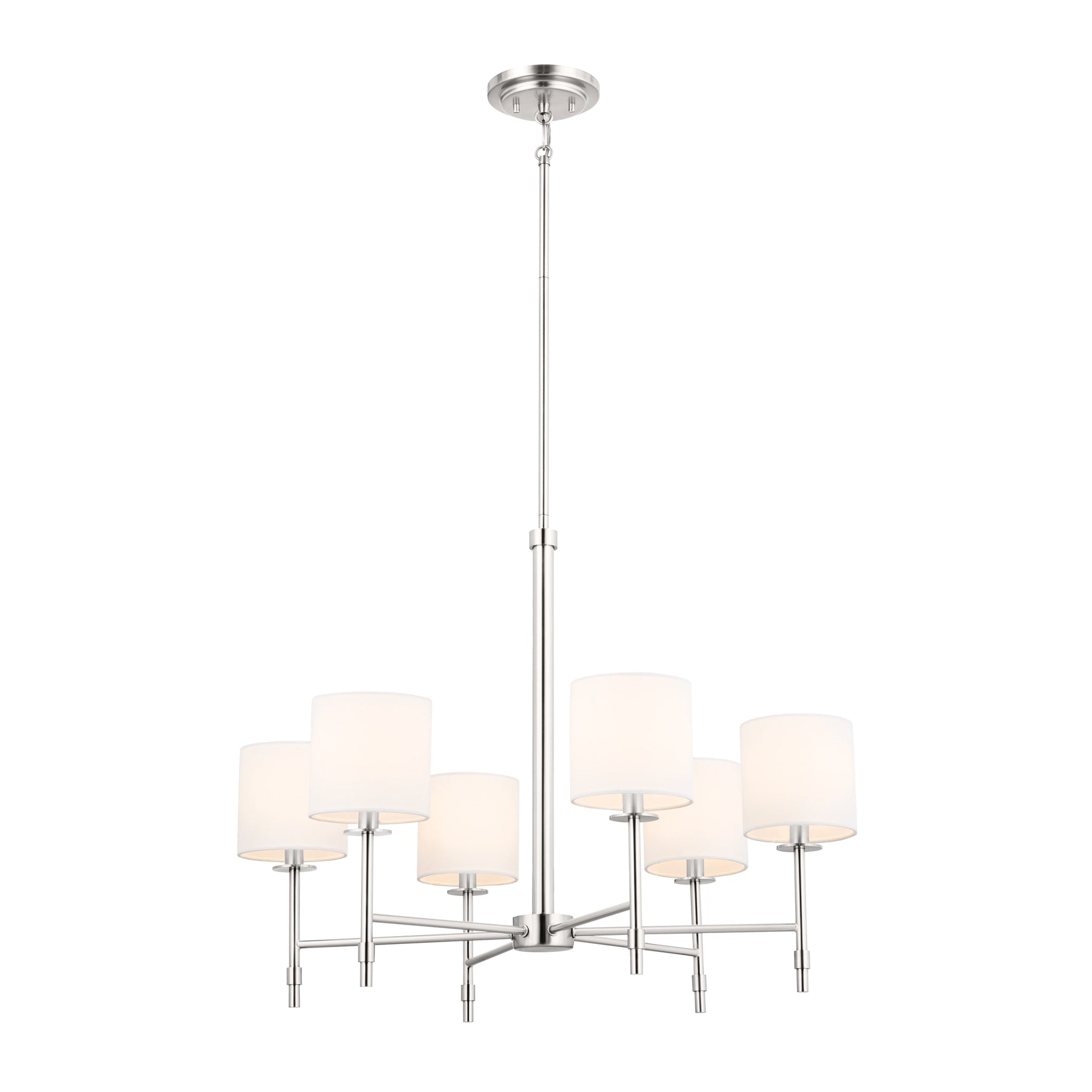 Illuminate your home with the Kichler Ali 6-Light Polished Nickel Chandelier, blending timeless elegance with contemporary appeal. Its polished nickel finish offers a warm, subtle shine, while white fabric shades add a touch of classic sophistication to any space.