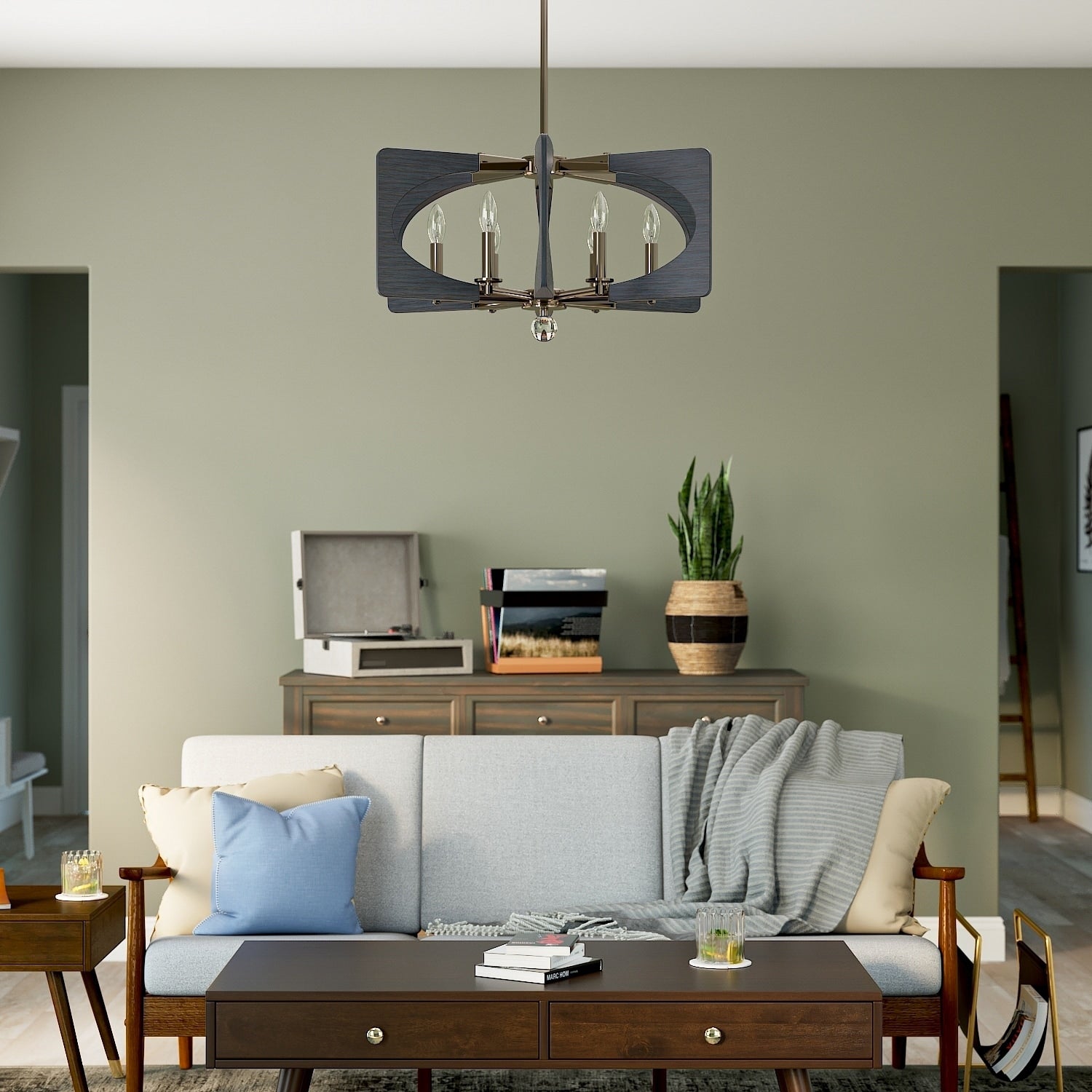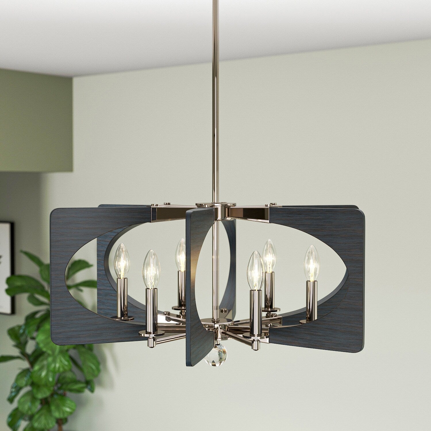Illuminate your space with the Alscar 6-Light Chandelier, blending mid-century modern charm with transitional style. This polished nickel and driftwood grey fixture offers a striking geometric design, perfect for enhancing any dining room, kitchen, or foyer. It's a captivating piece inspired by classic 50s and 60s aesthetics.