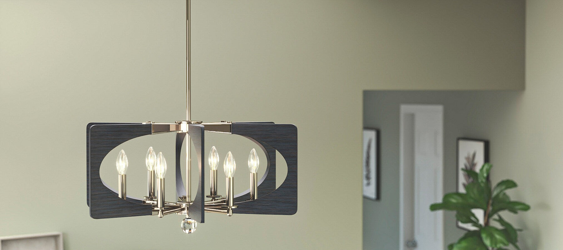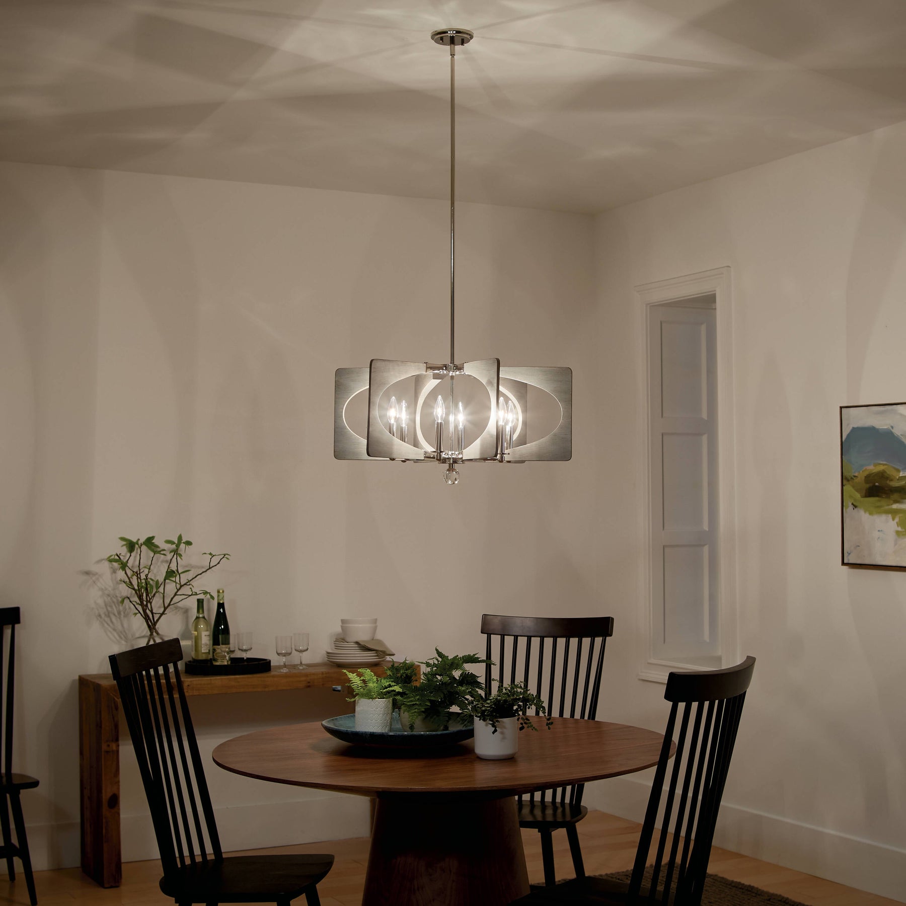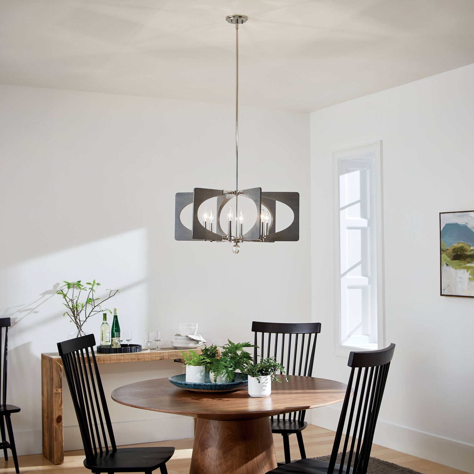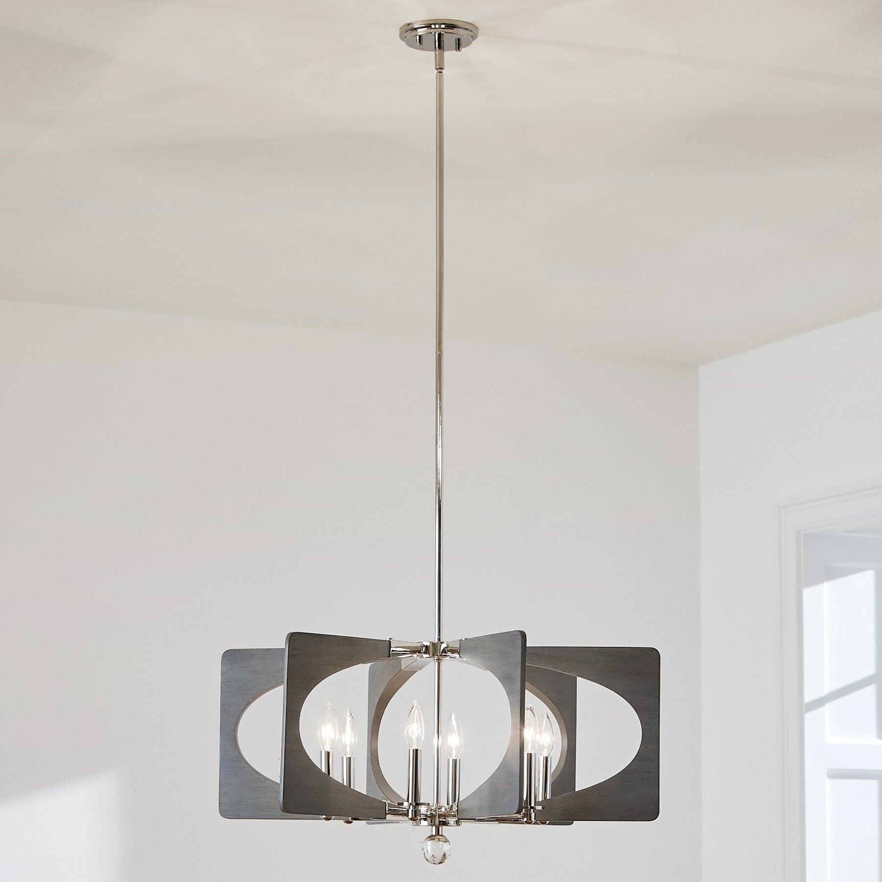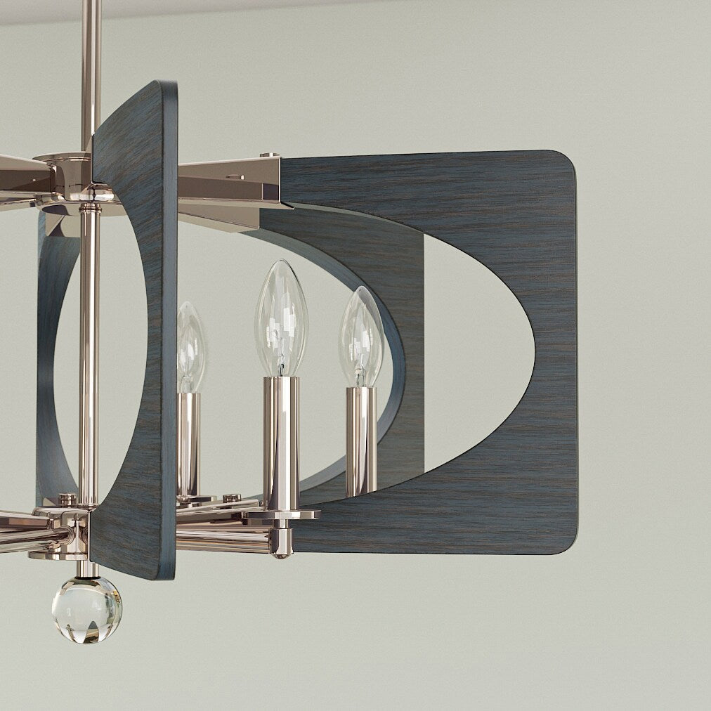 The Alscar 6-Light Chandelier is more than just a lighting fixture; it's an artistic statement piece that breathes mid-century modern sophistication into any room. Its polished nickel finish gleams, contrasting vividly with driftwood grey accents to create a stunning geometric focal point. Consider placing it above a sleek marble dining table, where it will cast an inviting ambient glow that elevates entertaining with chic flair. Essential for those who appreciate the fusion of form and function, the Alscar seamlessly marries classic design with contemporary luxury.