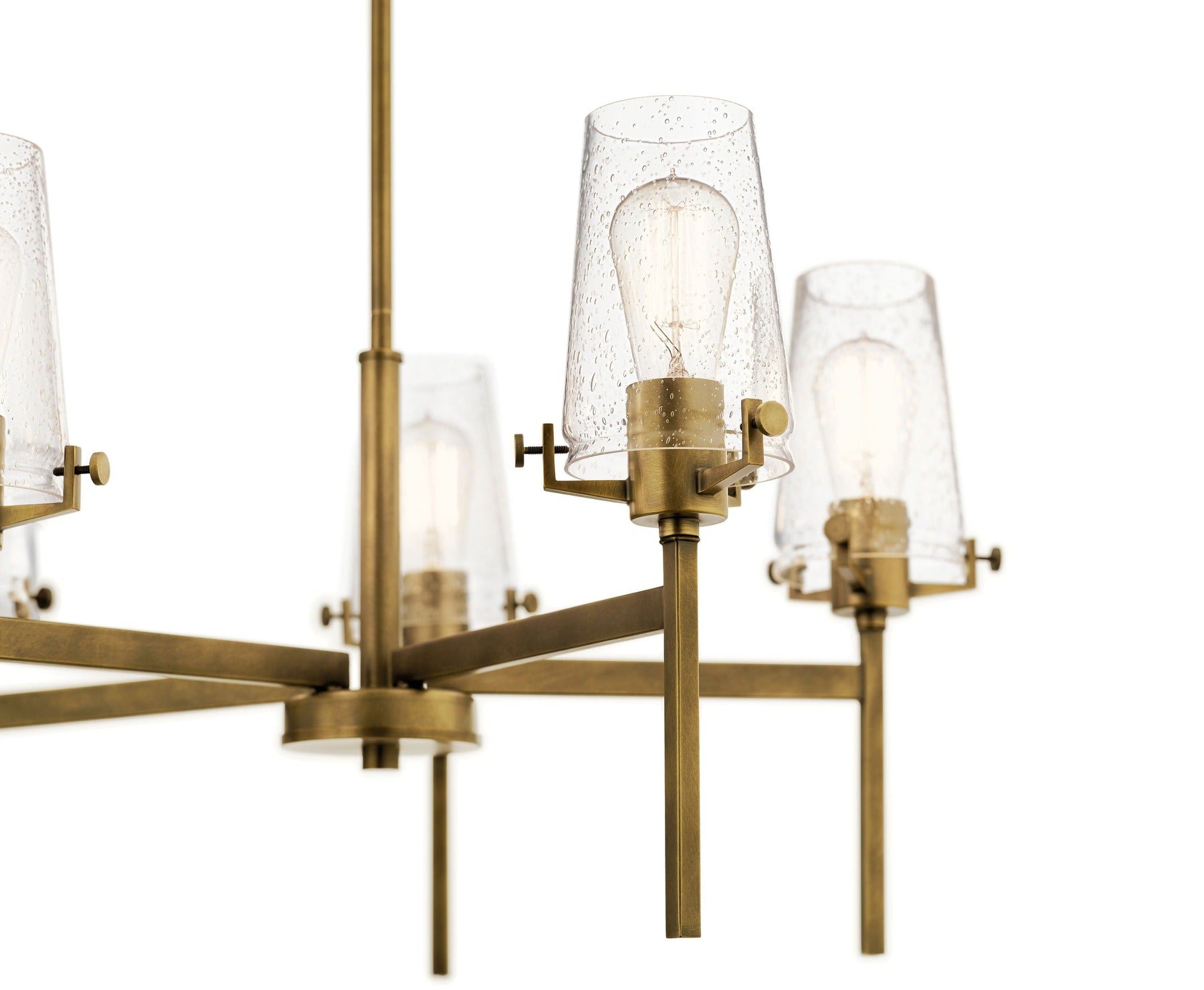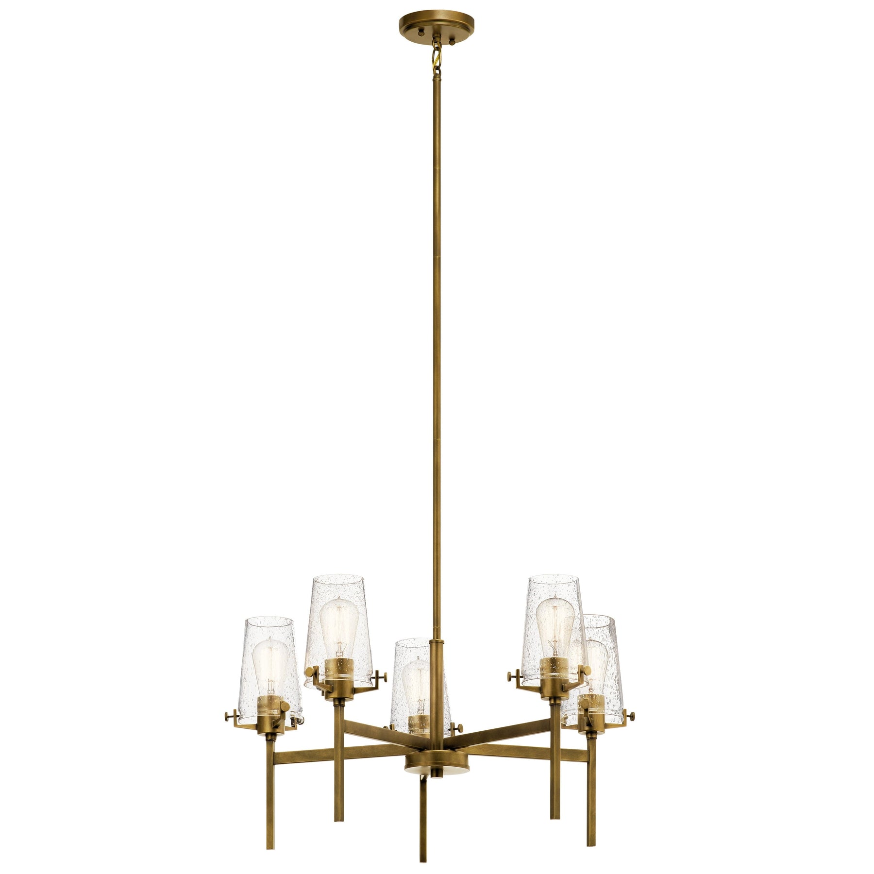 Elevate your space with the timeless elegance of the Kichler Alton 5-Light Vintage Chandelier in Natural Brass. This sophisticated fixture brings a warm, inviting glow to any room, combining classic design with a touch of modernity through its clear seeded glass shades. Perfect for dining rooms, kitchens, or cozy living areas, it’s a versatile choice that complements a variety of interiors.