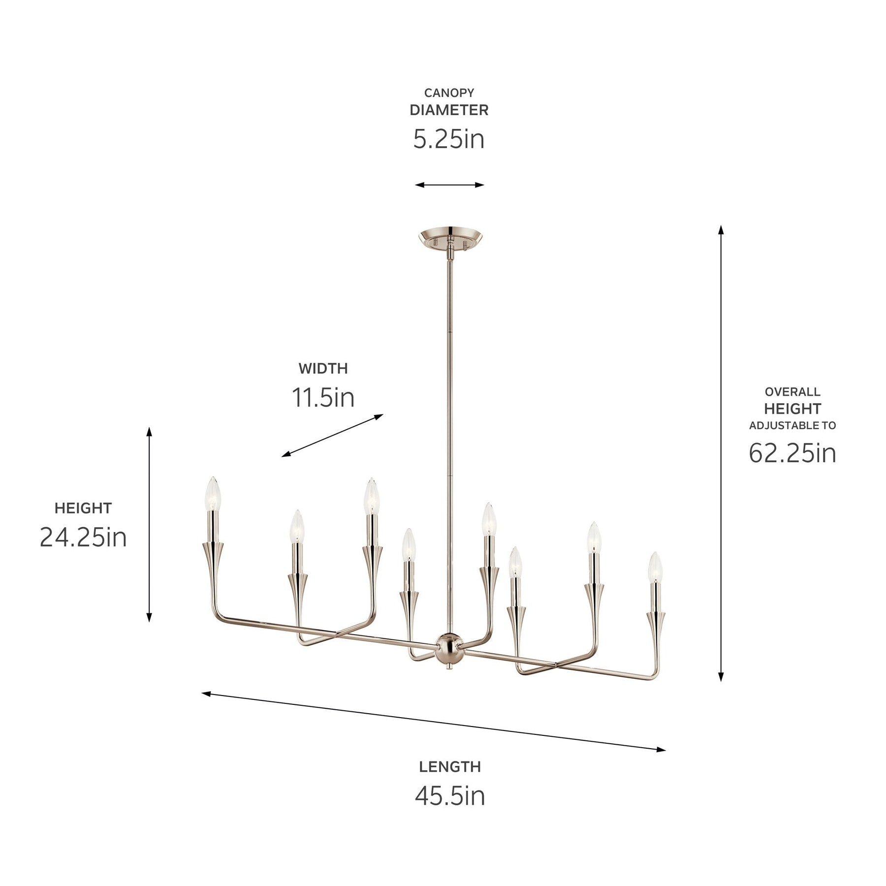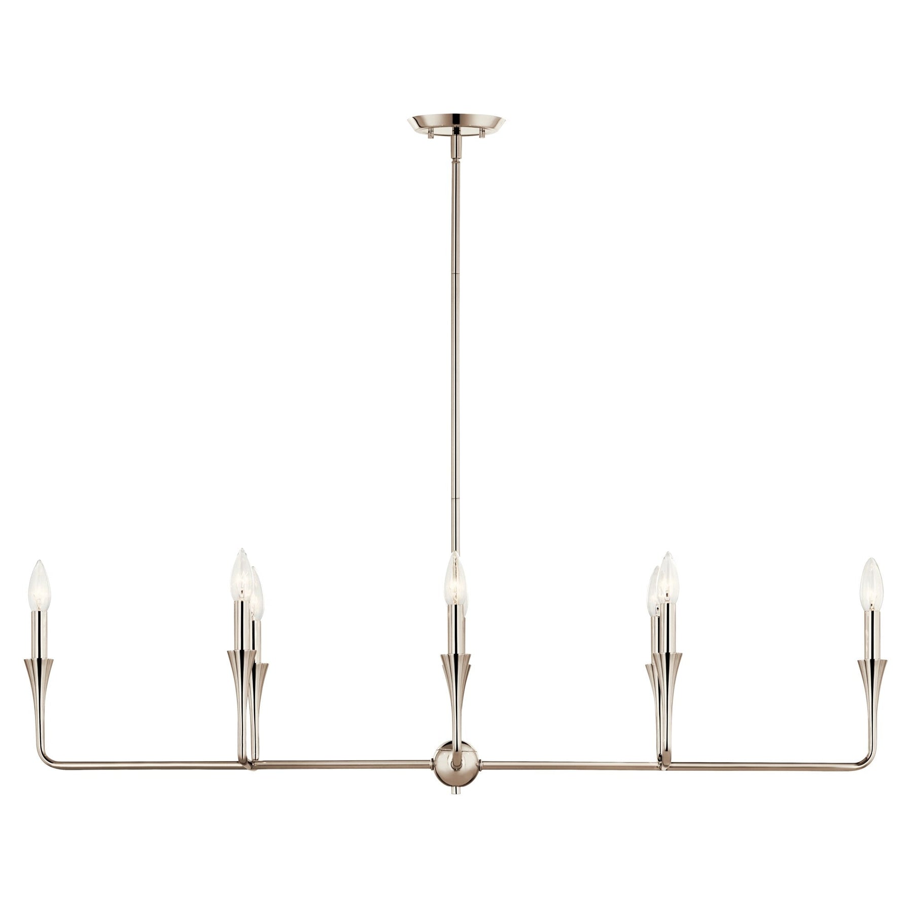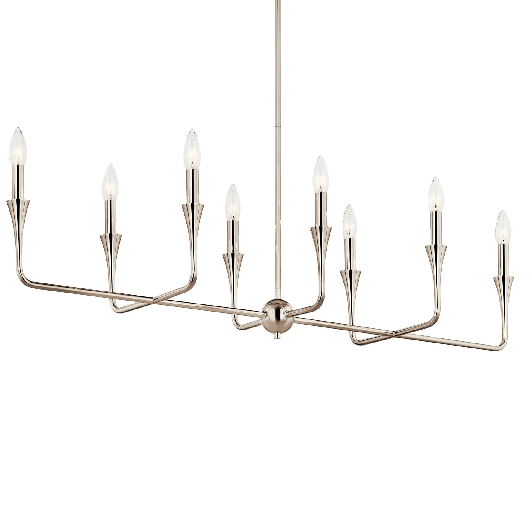 The Kichler Alvaro 8-Light Chandelier blends minimalist sophistication with an elegant touch, perfect for modern interiors. Boasting a polished nickel finish and adjustable height, this chandelier offers both versatility and style, accommodating various design preferences with its bare bulb feature.