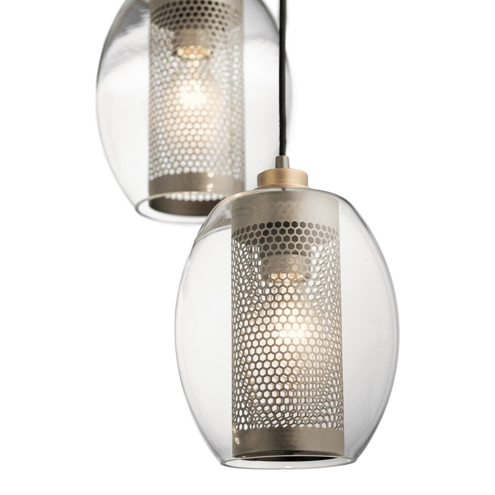 Illuminate your space with the Kichler Asher 3-Light Antique Pewter Pendant Light. It features a modern design with clear glass cylinders that elegantly encase the antique pewter mesh shades. Ideal for contemporary settings, this fixture offers both style and versatility with adjustable hanging heights.