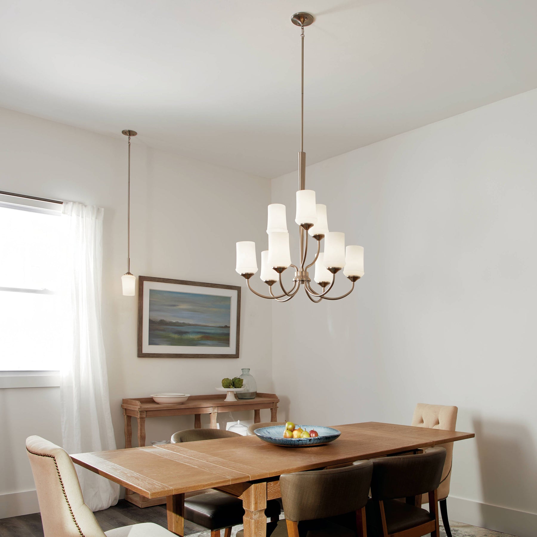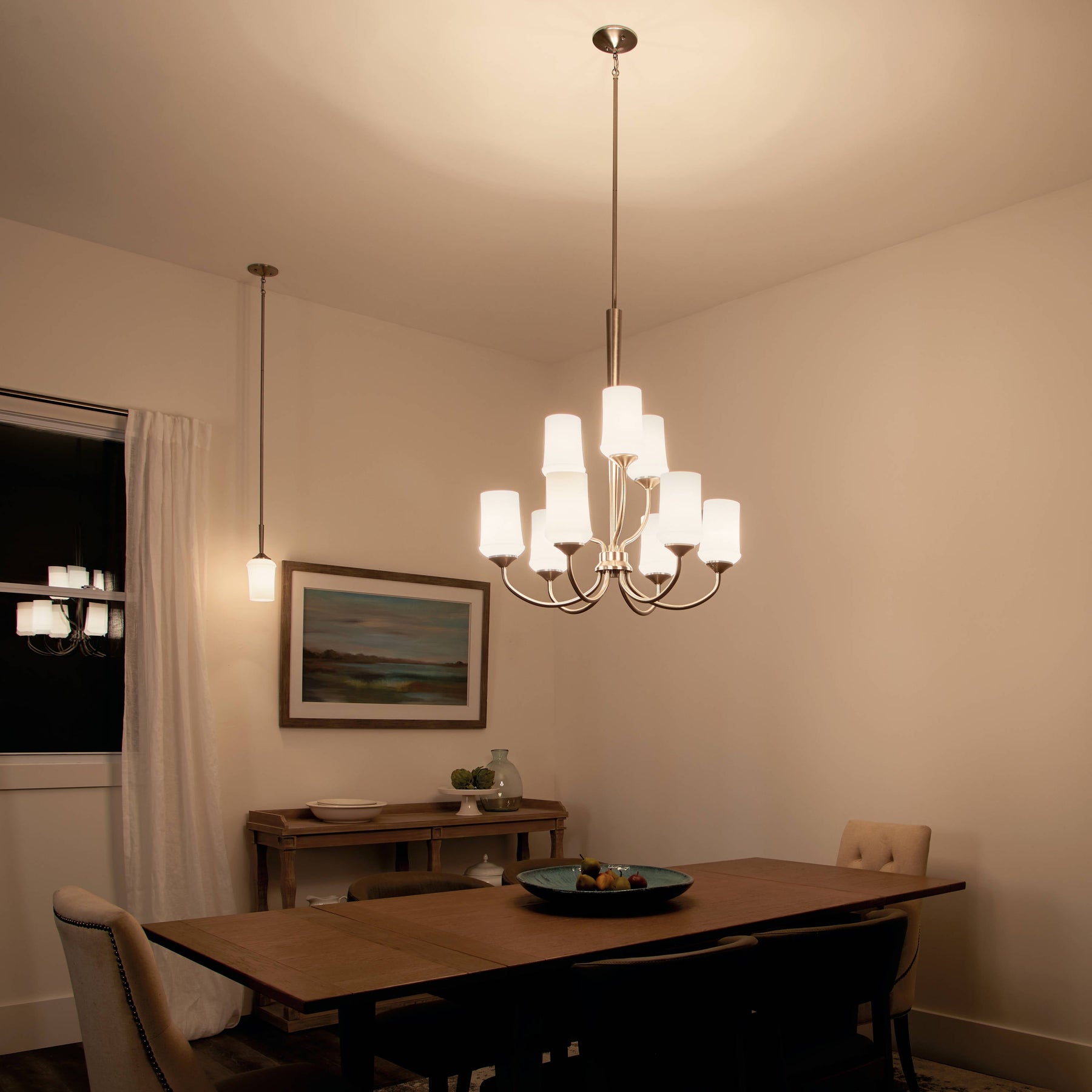 Illuminate your space with the Kichler Aubrey 9-Light Chandelier, a striking centerpiece that combines elegance with functionality. With its versatile brushed nickel finish and satin etched opal glass, this chandelier is designed to complement both traditional and modern interiors. Ideal for foyers and dining rooms, it offers ambient lighting that transforms your home into a beautifully warm and inviting space.
