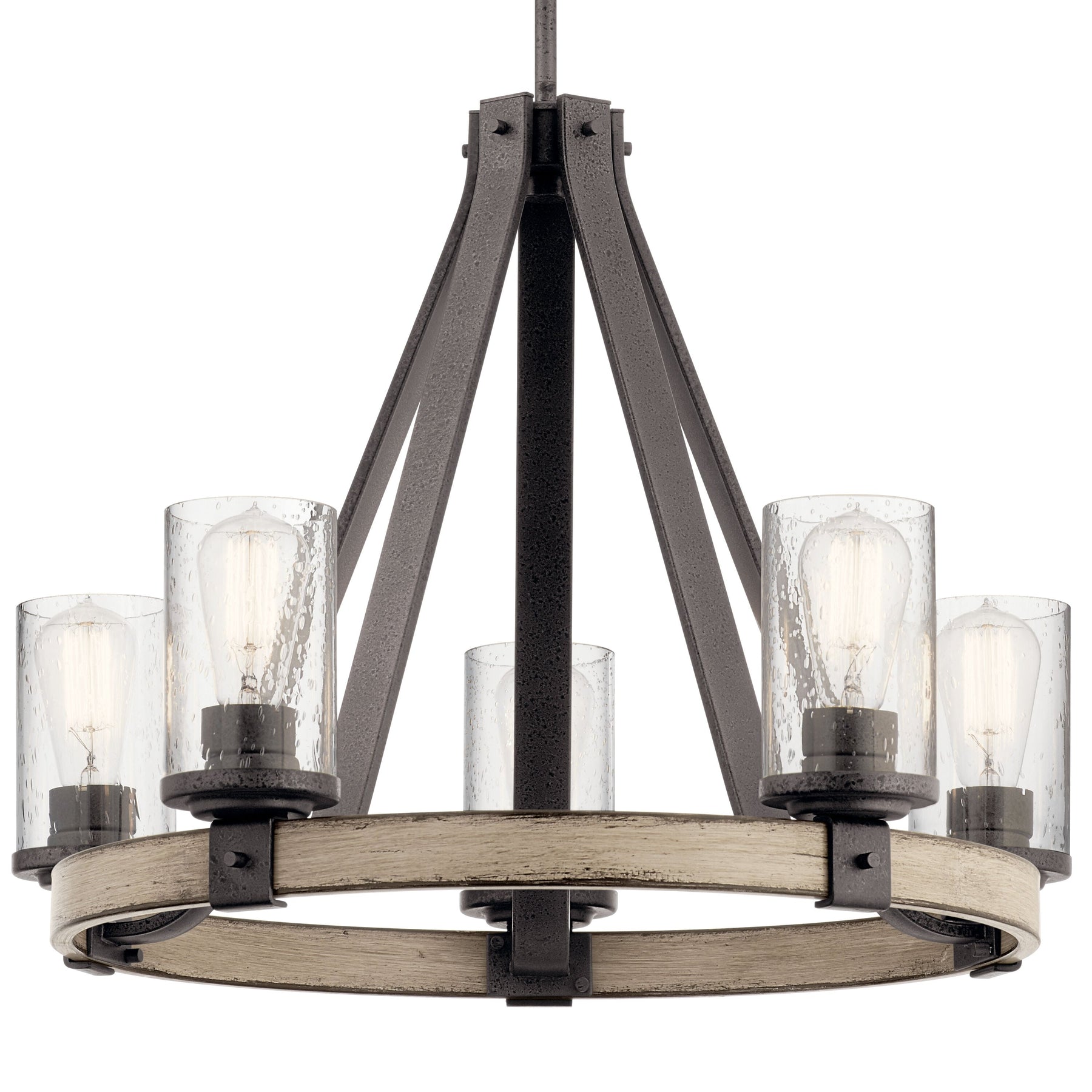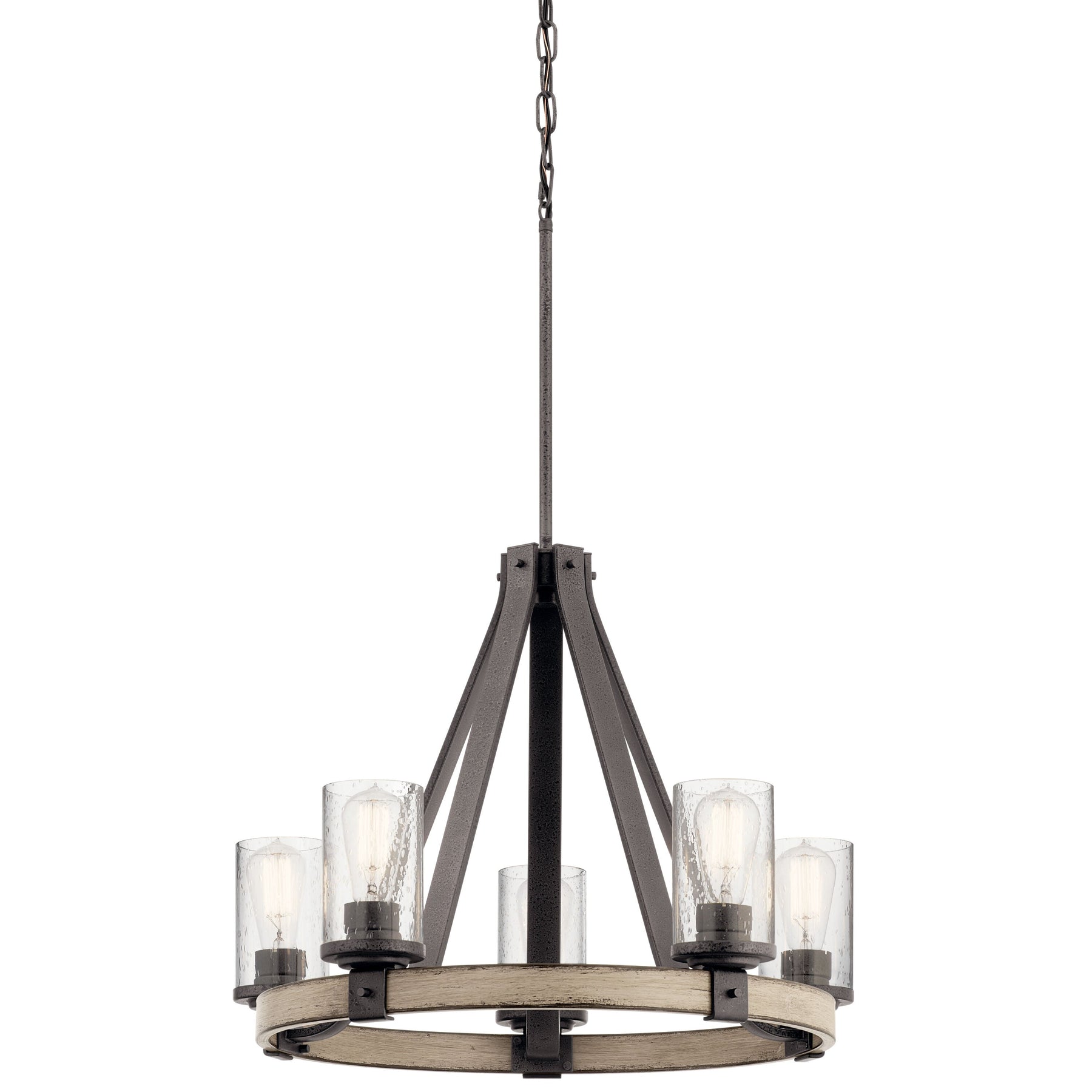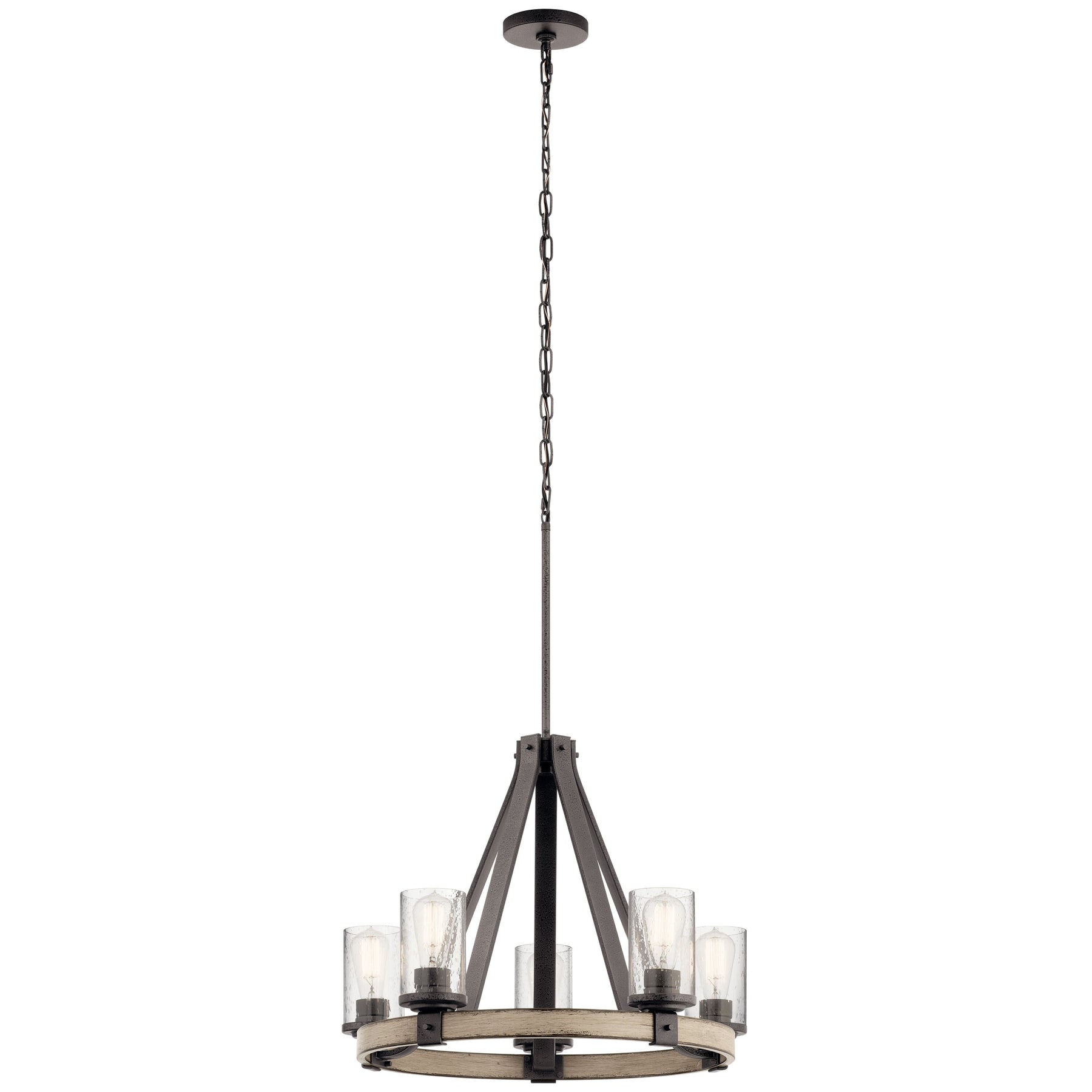 Illuminate your home with the Barrington 5-Light Chandelier by Kichler, a perfect blend of rustic and industrial charm. Its distressed gray finish and anvil iron accentuate the elegant driftwood frame, complemented beautifully by clear seeded glass shades. Ideal for creating an atmosphere that is both warm and inviting, this chandelier becomes the standout centerpiece in any room.