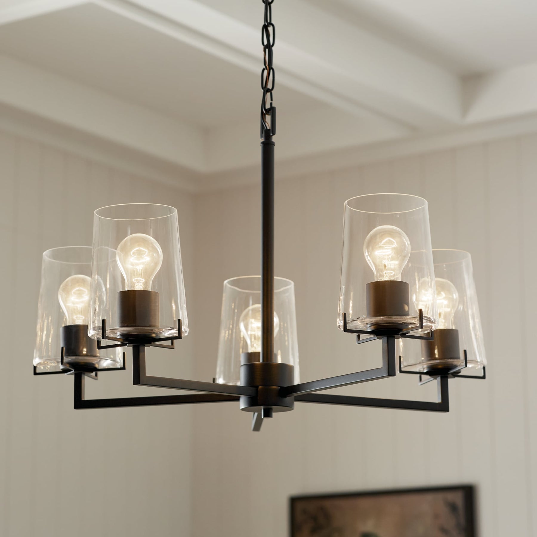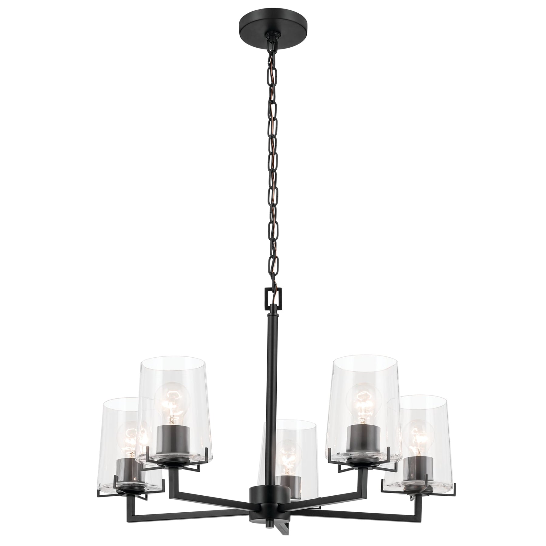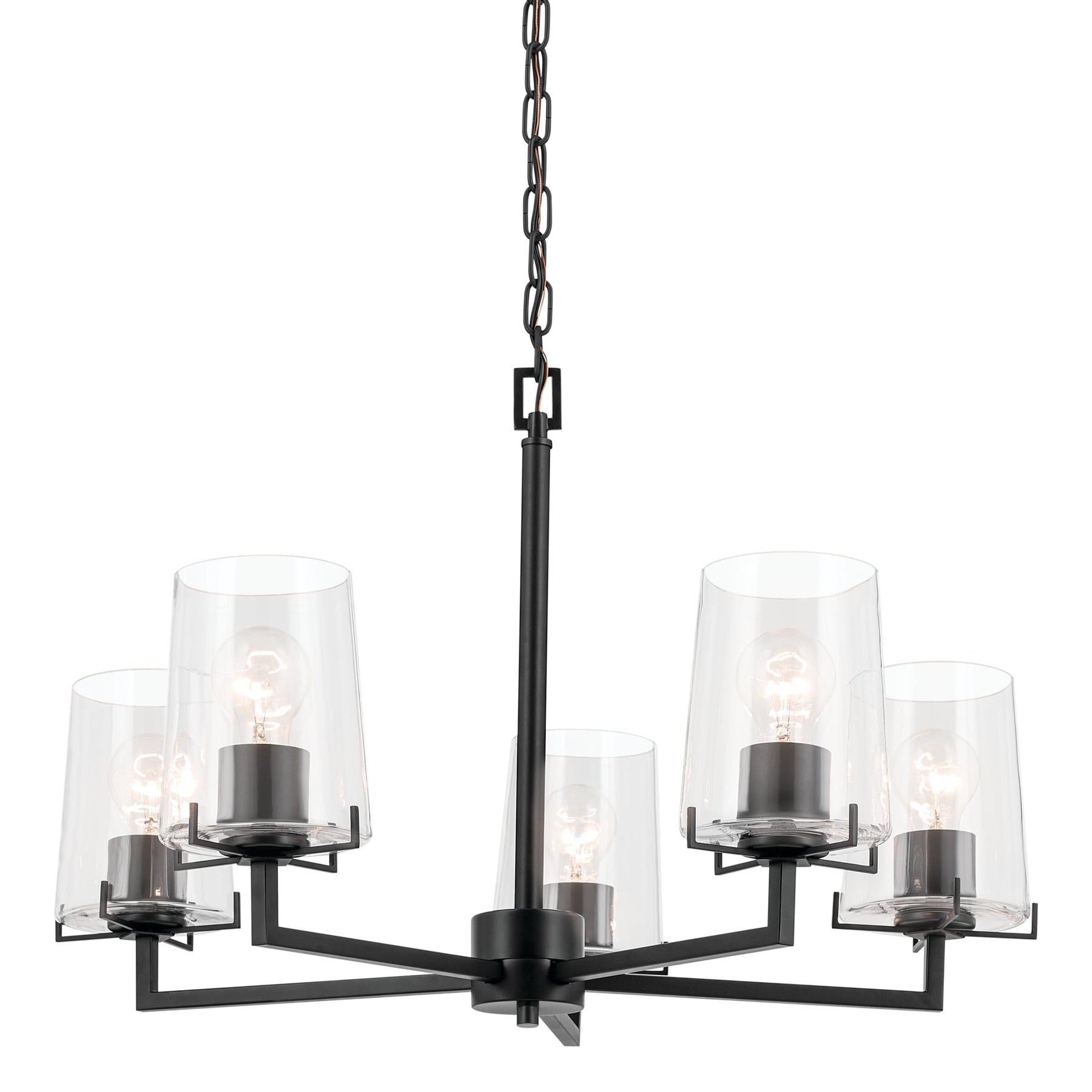Transform your dining room or foyer into a stunning centerpiece with the Kichler Birk 5-Light Chandelier. Its striking black finish combined with clear glass shades exudes a timeless elegance that effortlessly elevates any space. Imagine this fixture casting a warm glow over your rustic wooden dining table or welcoming guests in an artfully designed entryway. With its versatile yet distinguished design, the Birk Chandelier transcends mere function, becoming a pivotal element of luxurious and sophisticated living.