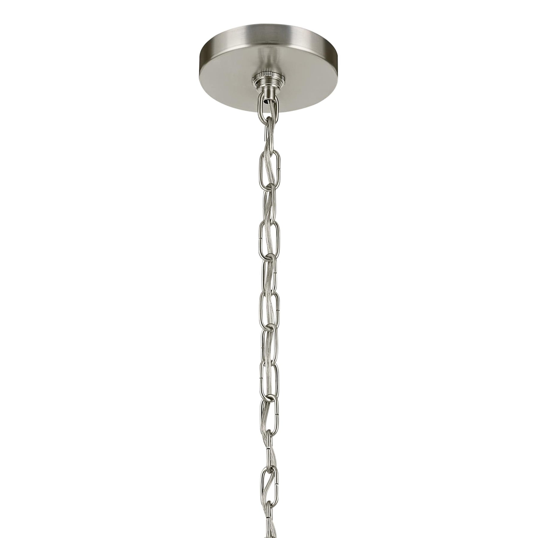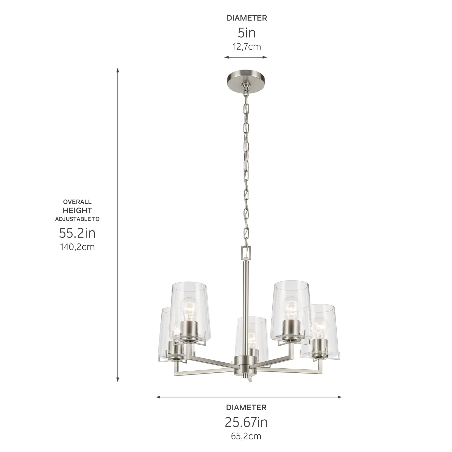 The Kichler Birk 5-Light Farmhouse Chandelier beautifully combines rustic charm with modern elegance. Featuring a brushed nickel finish and clear glass shades, this chandelier acts as a striking centerpiece in any dining room, foyer, or bedroom. Its adaptability to sloped ceilings and variety of installation heights makes it a versatile choice for any interior.