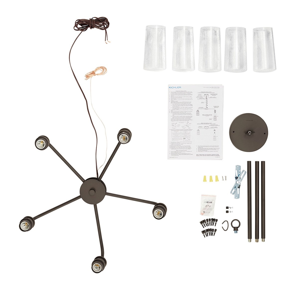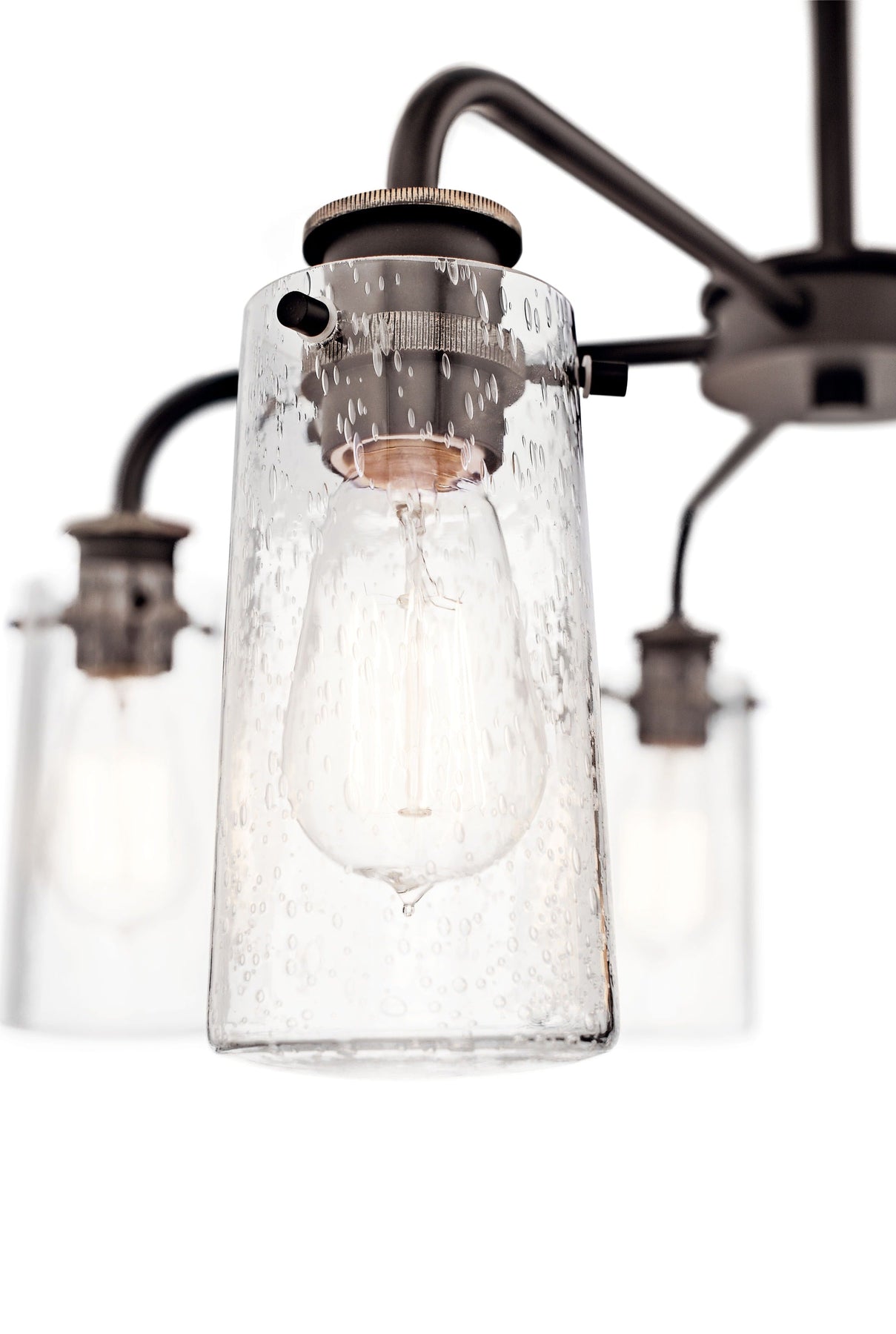 The Kichler Braelyn 5-Light Chandelier seamlessly blends industrial chic with vintage elegance, a truly transformative piece for any space. Its clear seeded glass shades echo the nostalgia of antique glass jars, casting a beautifully scattered light across your room. Hang it over an expansive dining table or in an opulent entryway, and watch as it elevates your decor to a new level of sophistication. This chandelier is not just a light source—it's an essential design element that evokes luxury with every glance.