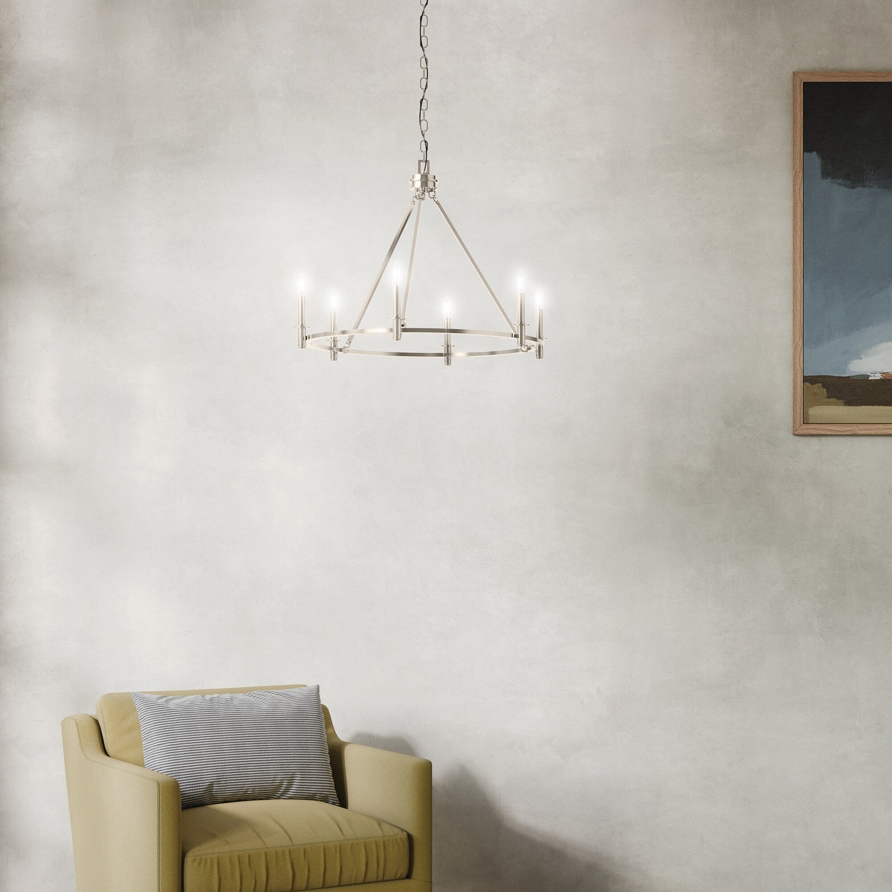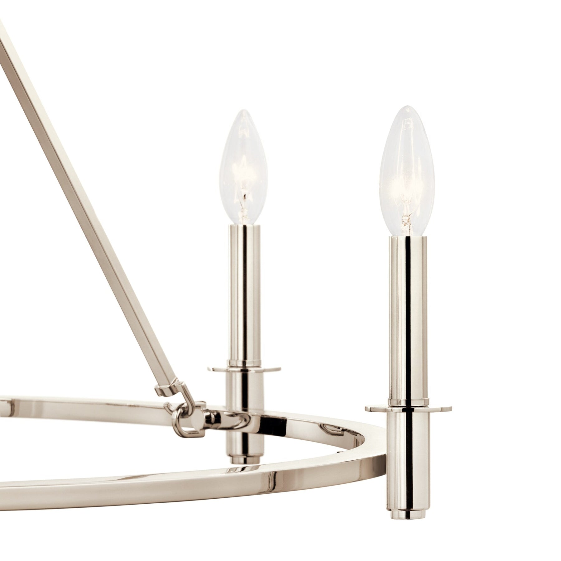 The Kichler Carrick 6-Light Polished Nickel Chandelier elevates any traditional space with its elegant design and airy presence. This distinctive chandelier, featuring a stunning polished nickel finish and bare bulb candlesticks, serves as a focal point in dining rooms, offices, or bedrooms, adding timeless brilliance and sophistication.