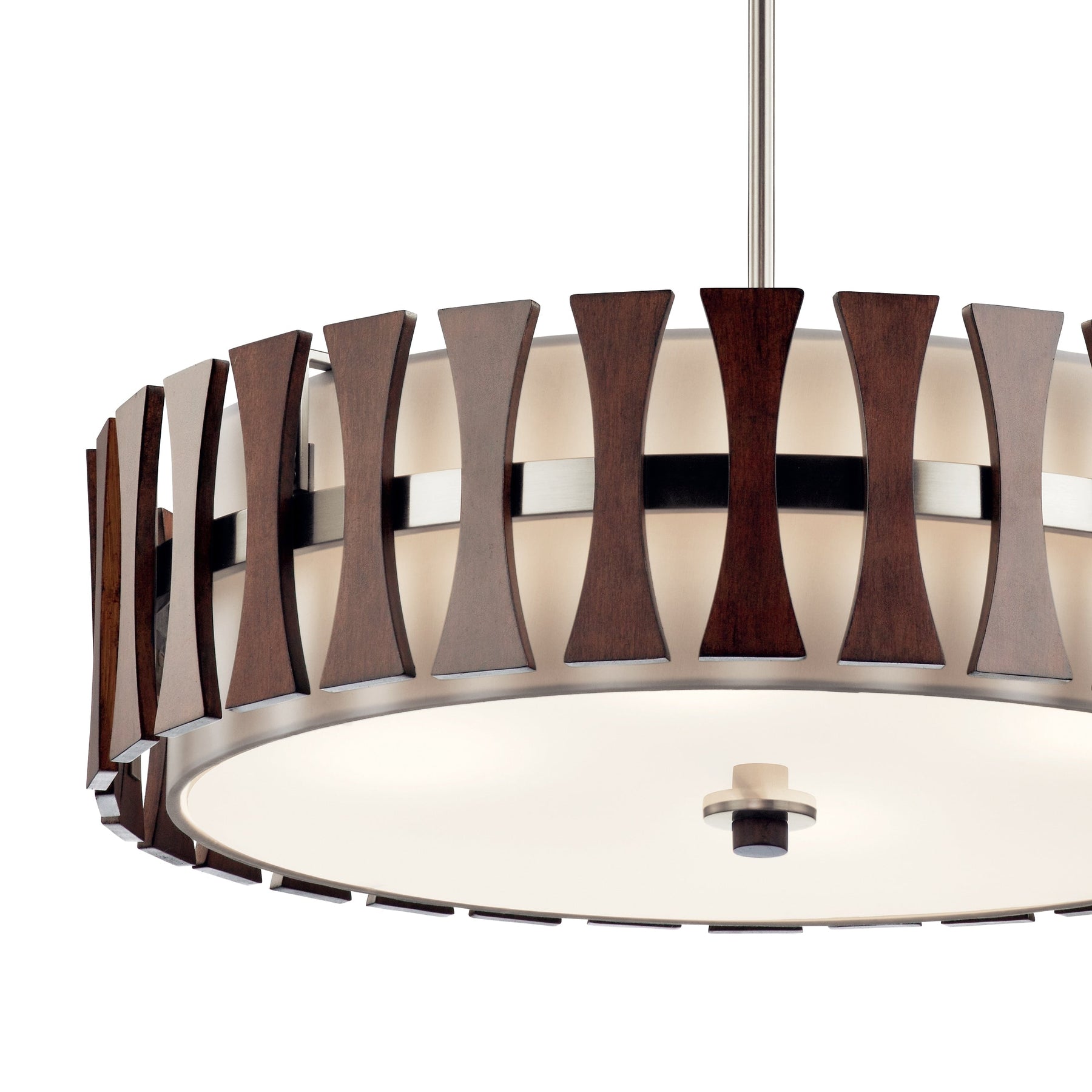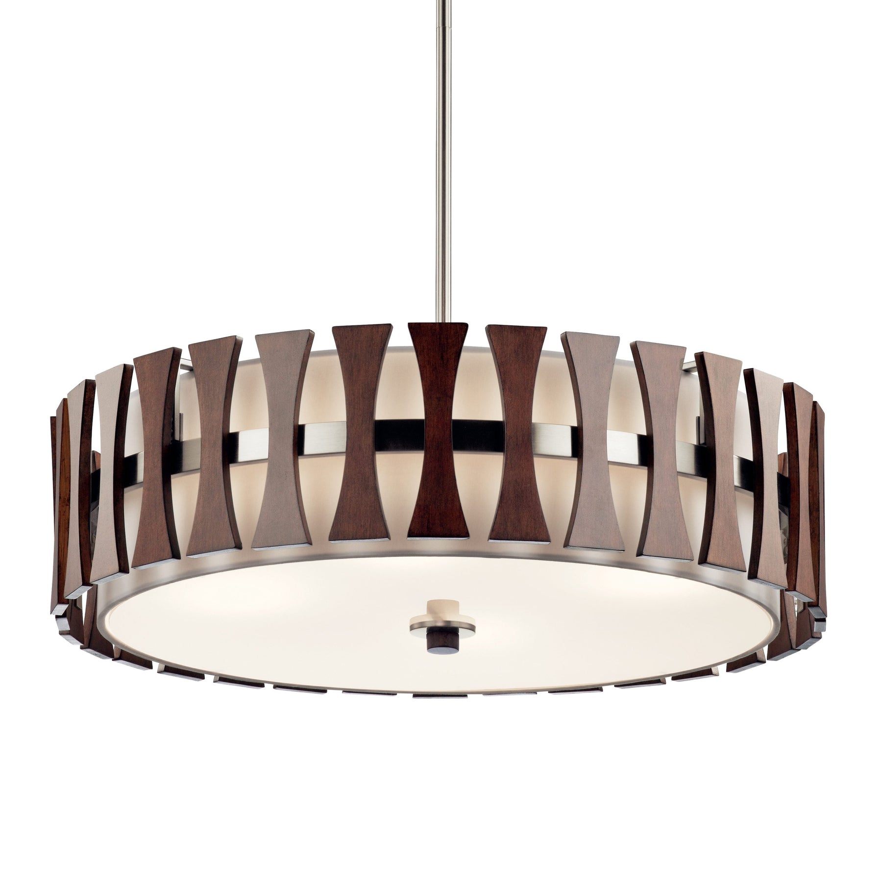 Illuminate your space with the Kichler Cirus 4-Light Auburn Pendant Light, an exquisite blend of mid-century modern and transitional design elements. Its etched glass drum shade provides a sophisticated glow, while the auburn stained finish adds warmth to any room. Perfect for dining and kitchen areas, this versatile light fixture transforms easily between pendant and semi-flush mount configurations to suit your needs.