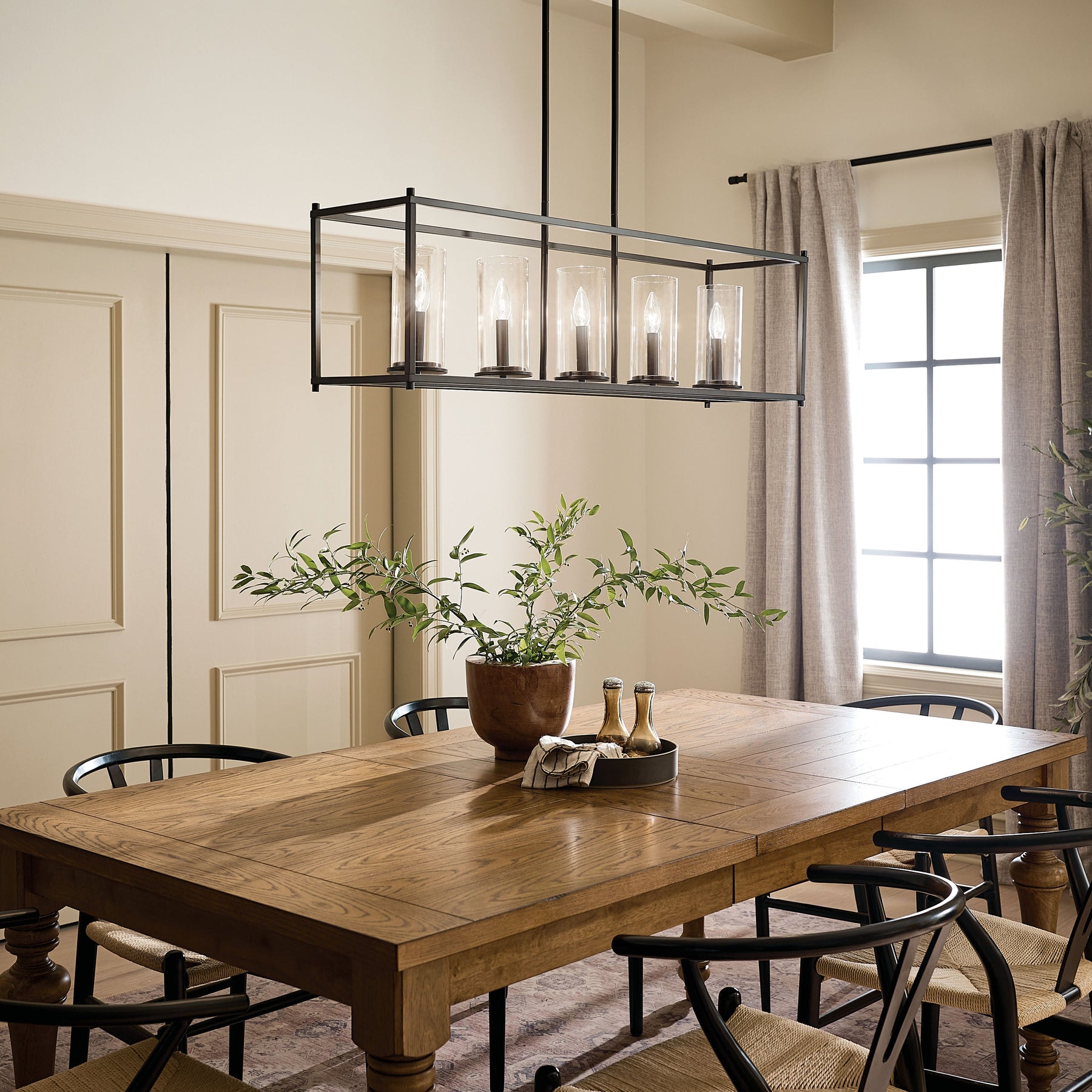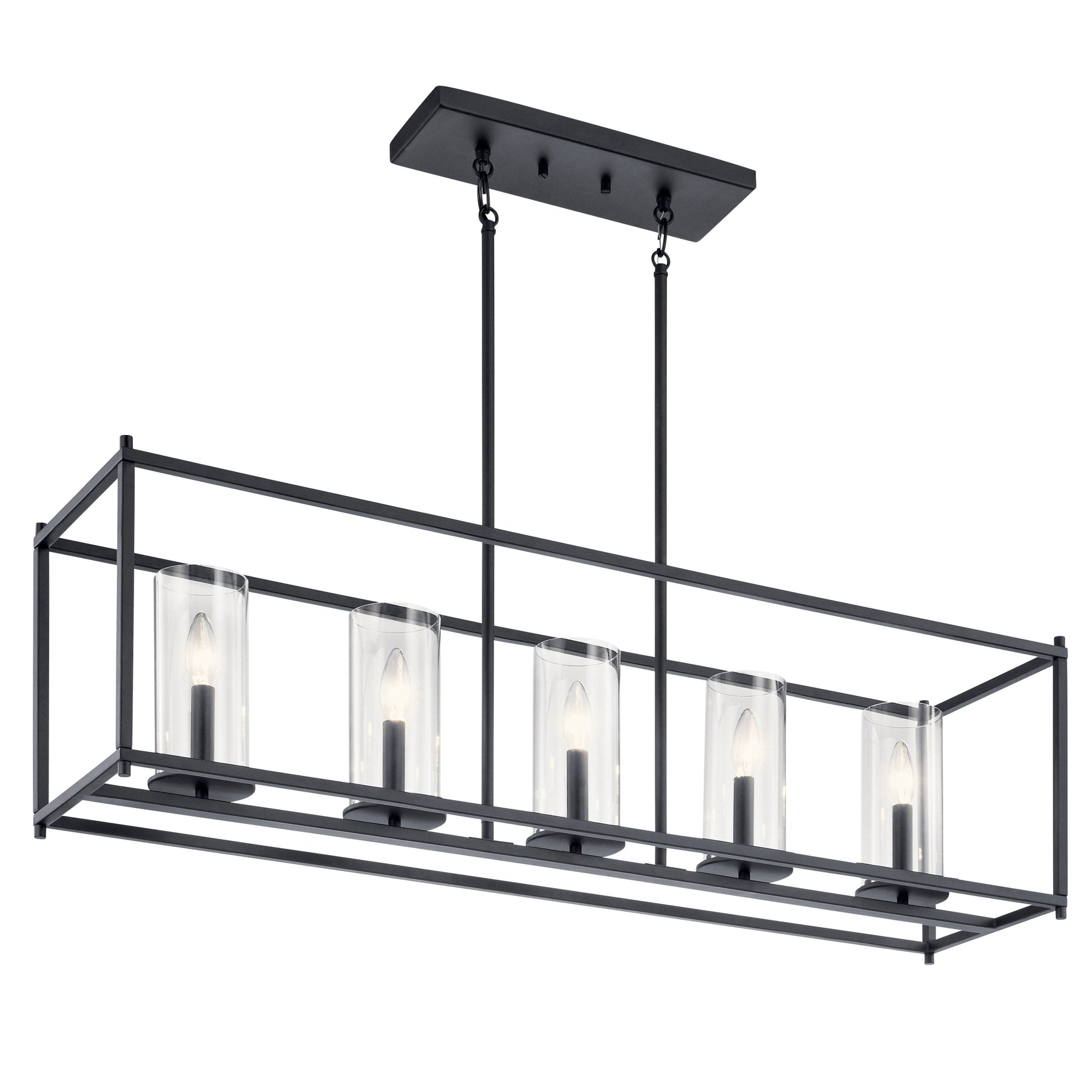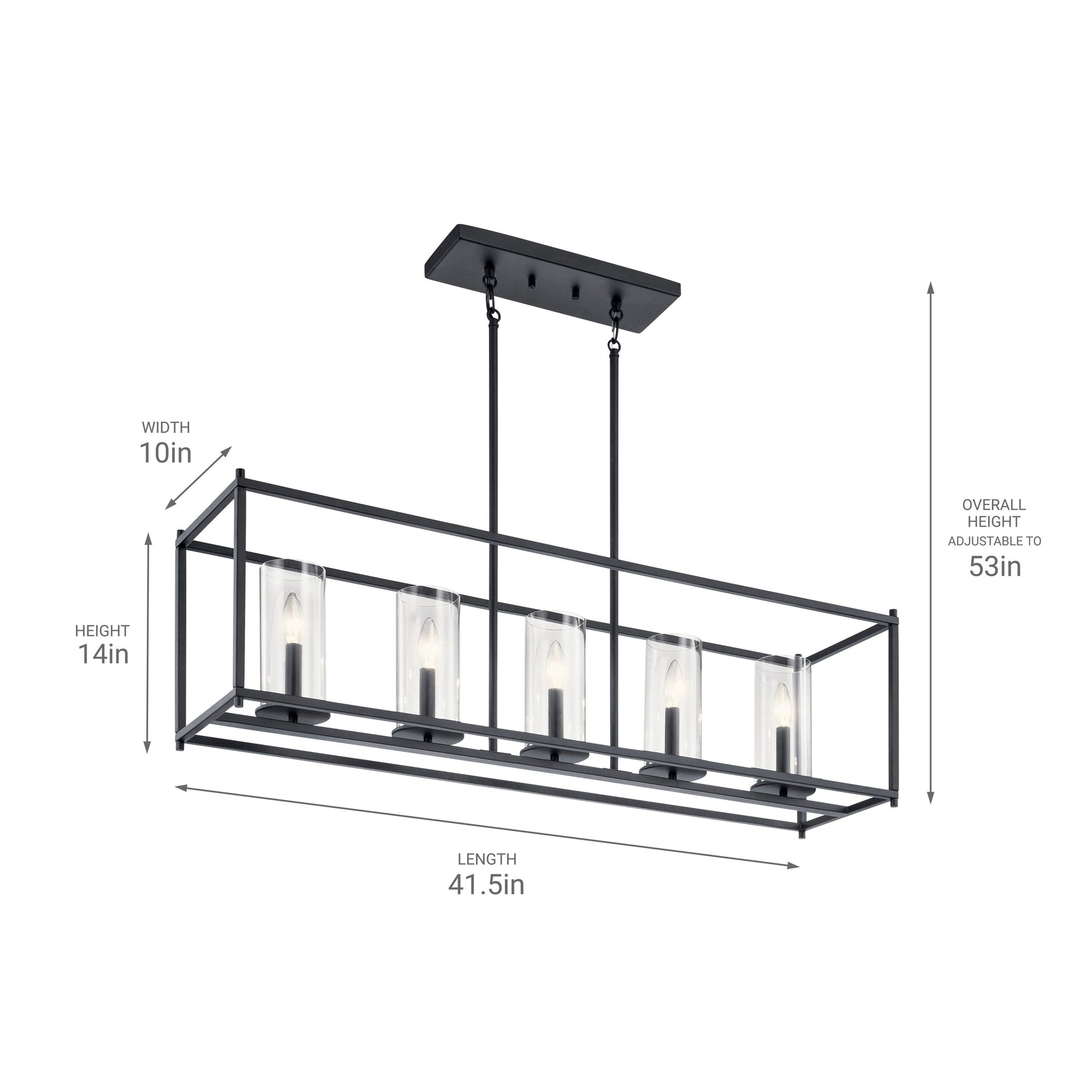 The Crosby 5-Light Black Chandelier introduces an air of minimalist luxury and charm to any space it adorns. Its linear form and clear glass shades offer a striking contrast to the bold black finish, capturing a refined blend of tradition and modernity. Imagine it gracing a dining room, casting a warm, ambient glow that sets the perfect mood for intimate gatherings or lively family meals. As an icon of contemporary design, this chandelier transforms ordinary rooms into extraordinary spaces, setting a standard for modern elegance.