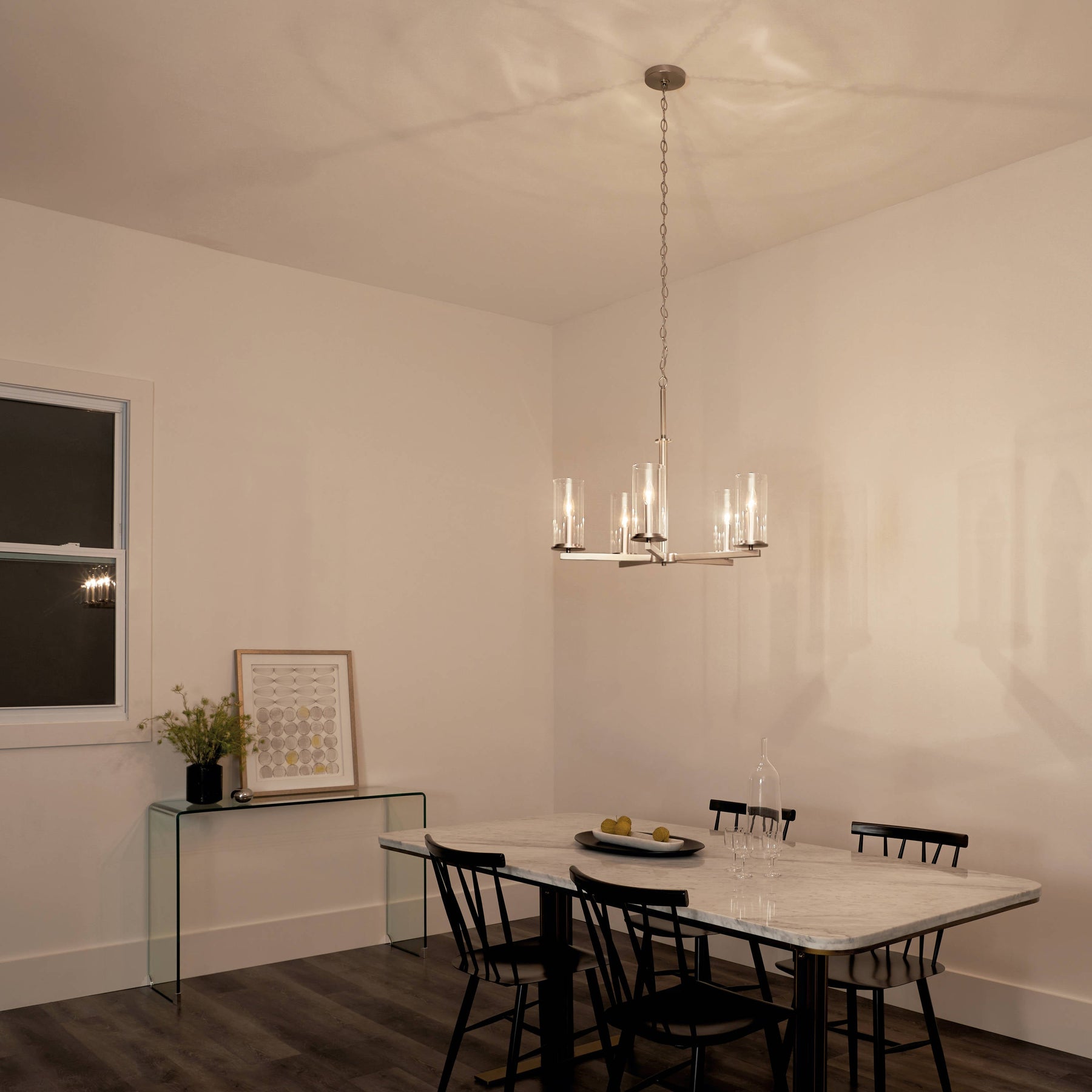 Illuminate your living space with the Kichler Crosby 5-Light Chandelier, a marriage of modern elegance and traditional charm. Featuring a beautiful brushed nickel finish and clear glass shades, this chandelier is perfect for adding ambient lighting to dining rooms or living rooms.