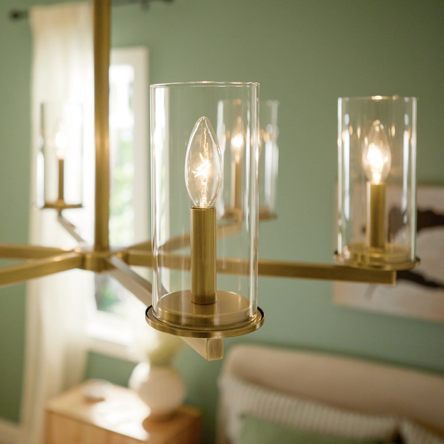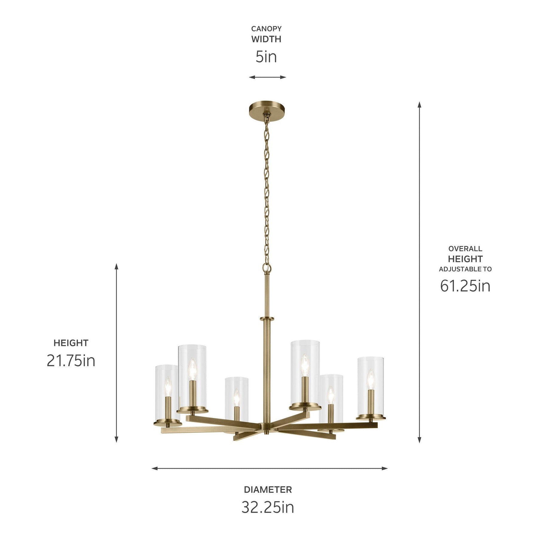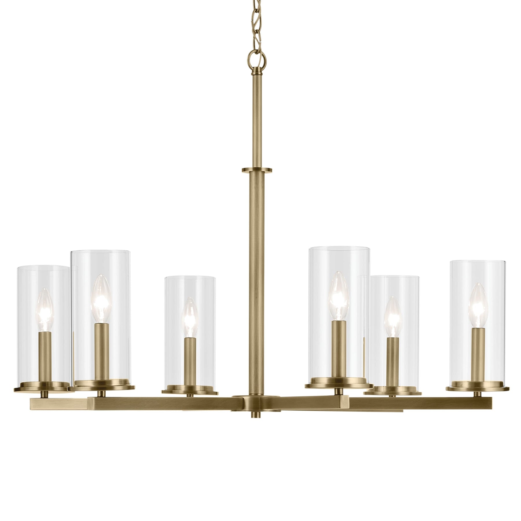 Illuminate your space with the timeless elegance of the Kichler Crosby 6-Light Chandelier. Featuring a versatile modern design, this chandelier enhances any room with its clear glass shades and stunning natural brass finish, making it a perfect fit for contemporary settings and adding a touch of luxury to your home.