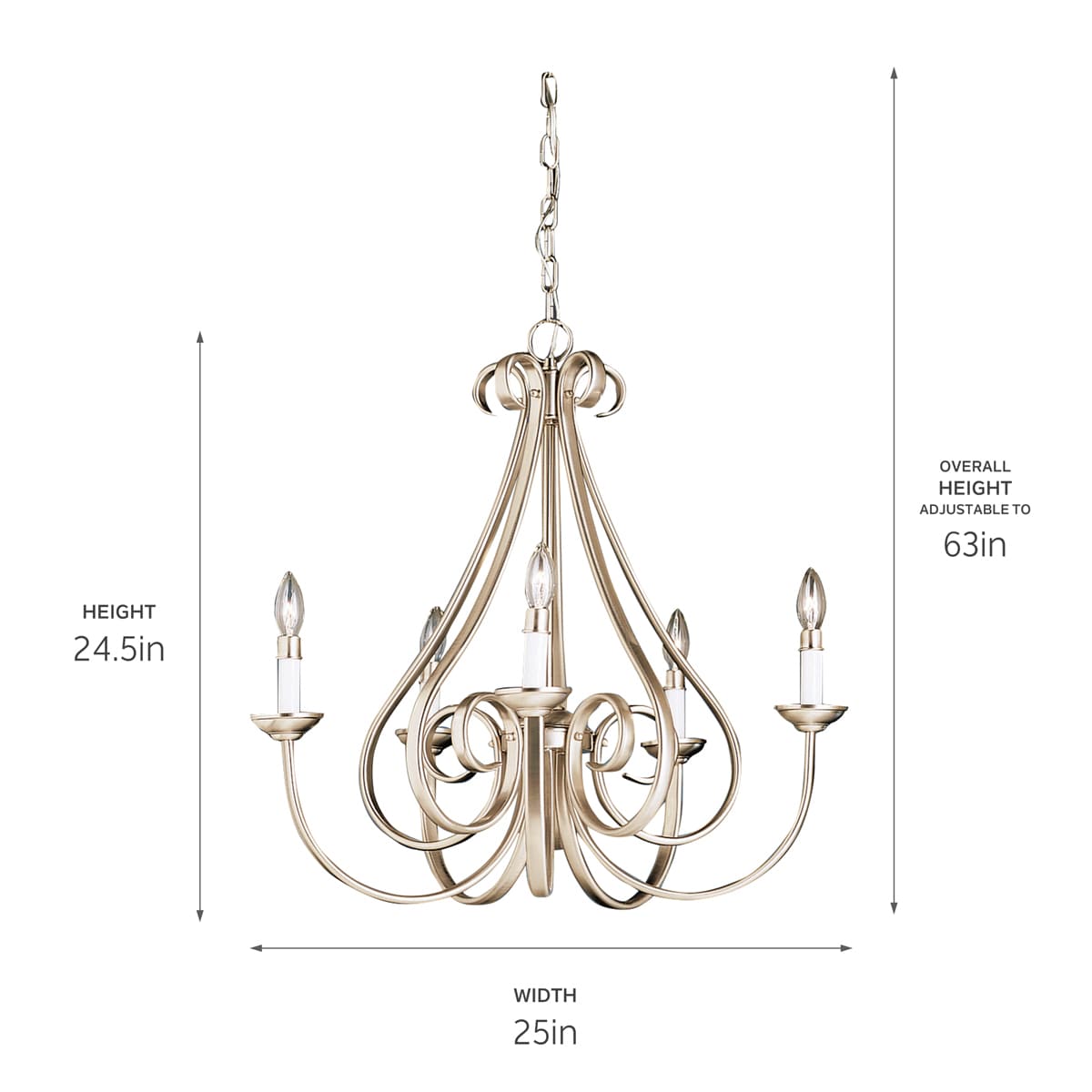 Illuminate your space with the Kichler Dover 5-Light Chandelier, an elegant blend of traditional design and modern functionality. Crafted from hand-wrought steel and finished in brushed nickel, this fixture brings a touch of sophistication to any room. Ideal for dining rooms, foyers, and living spaces, it offers both style and adaptability with its adjustable hanging height and compatibility with dimmable bulbs.