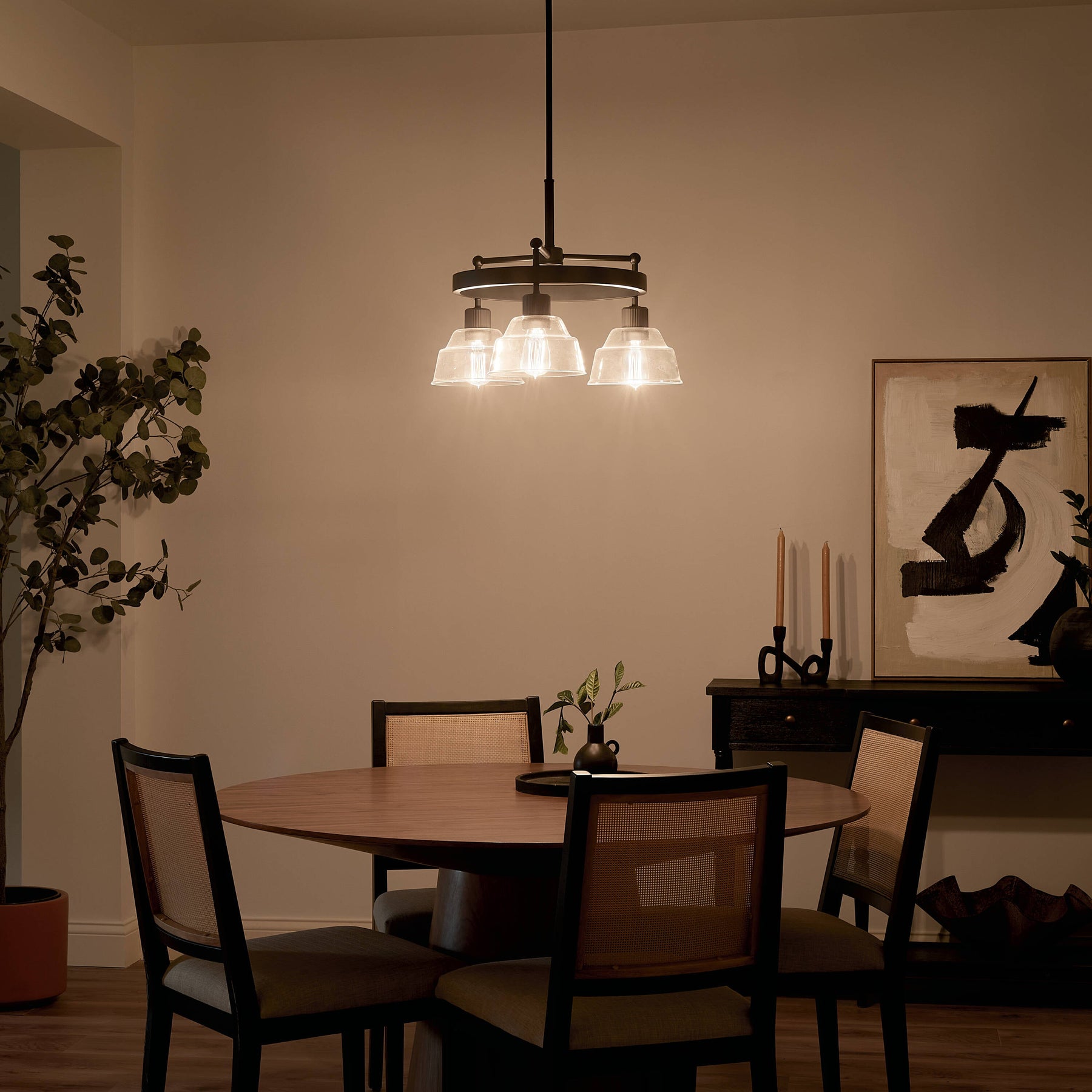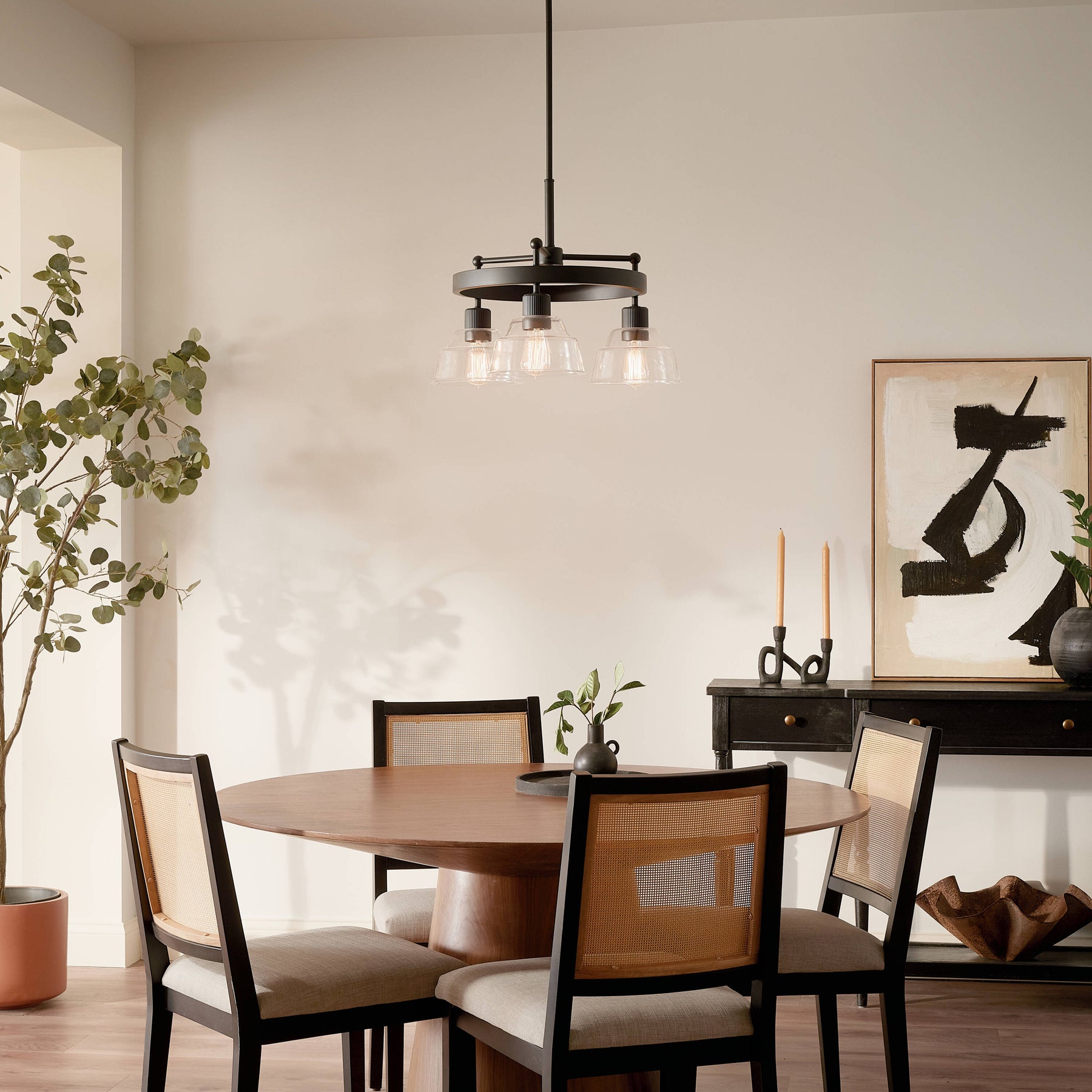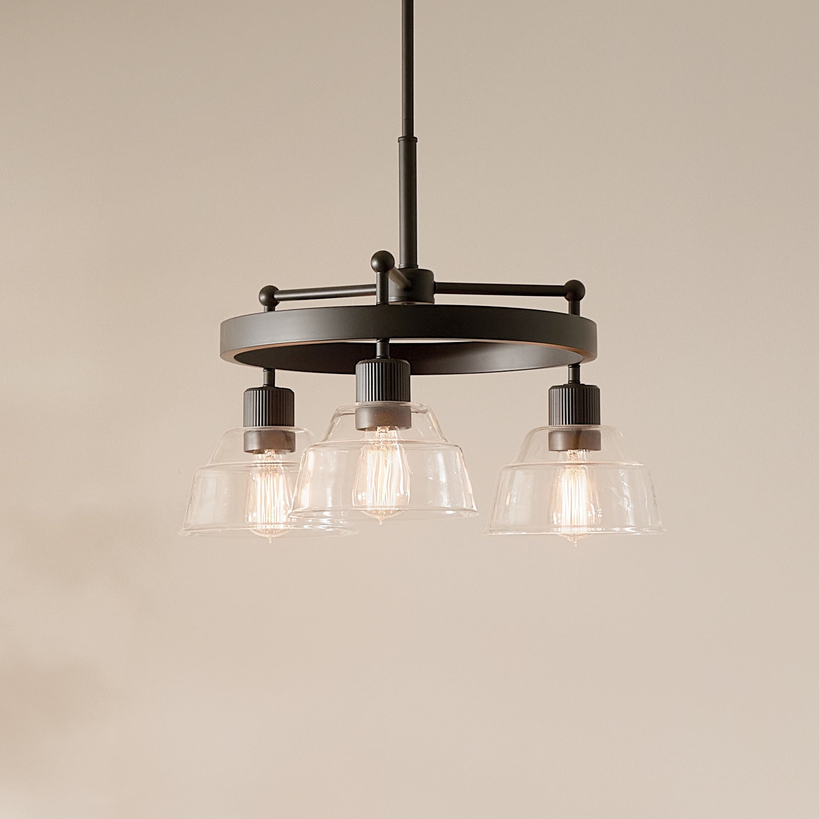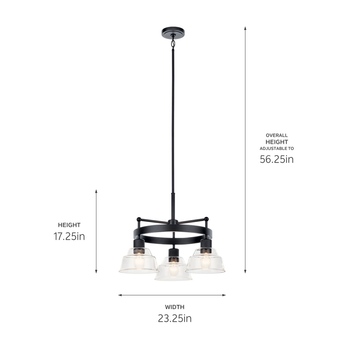 The Eastmont 3-Light Black Vintage Chandelier by Kichler combines elegant design with versatile functionality. Its black wagon wheel design features fine ribbed detailing, double-tiered clear glass shades, and a refined industrial charm that suits both vintage and modern décors. Adjustable in height, this chandelier is perfect for adding sophistication and drama to your dining room, kitchen, or living area.