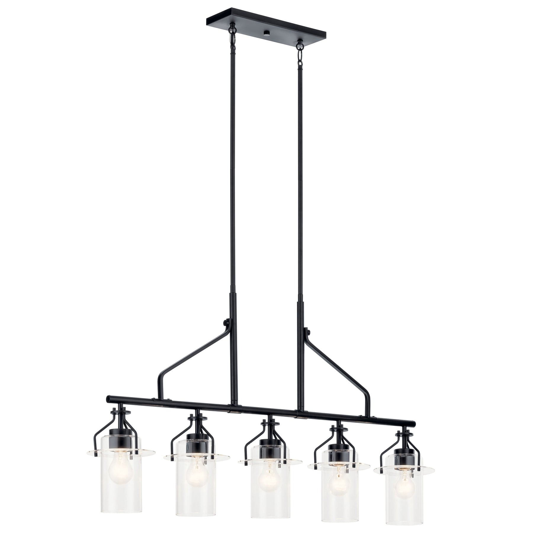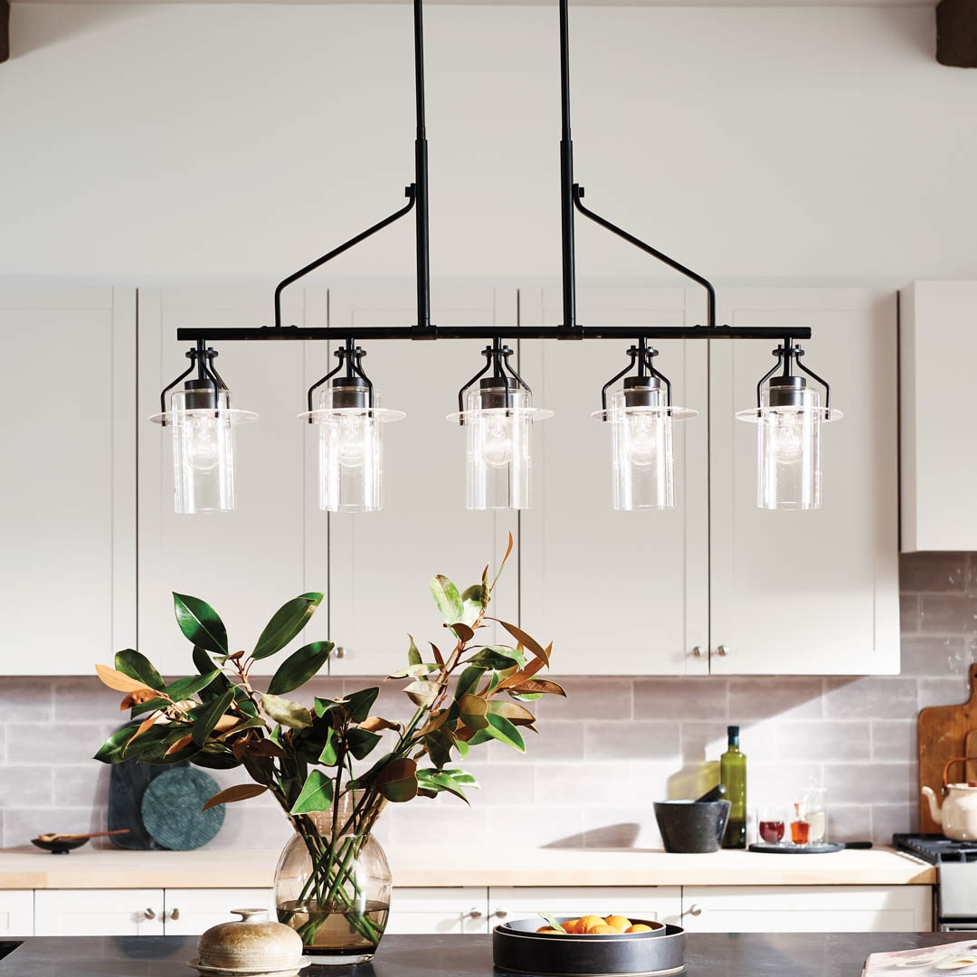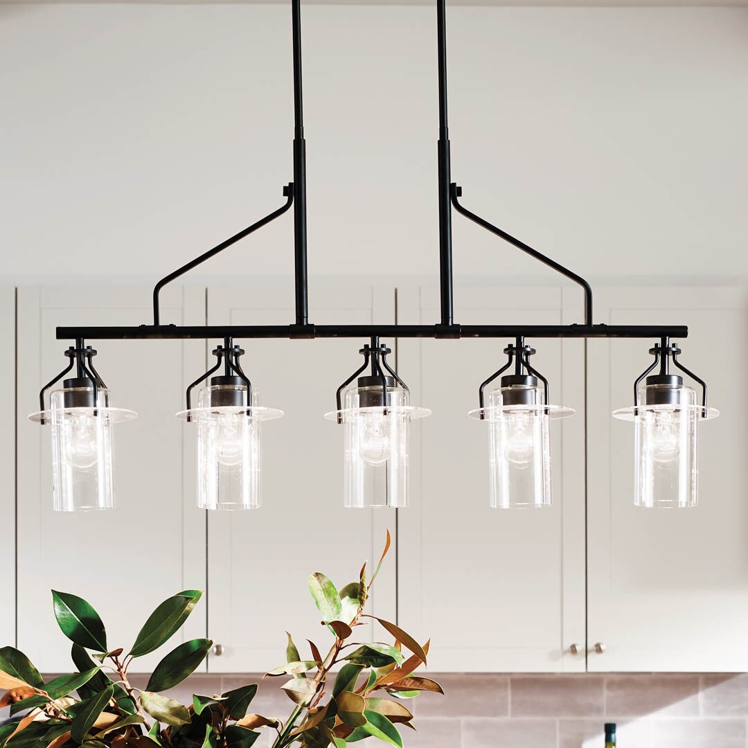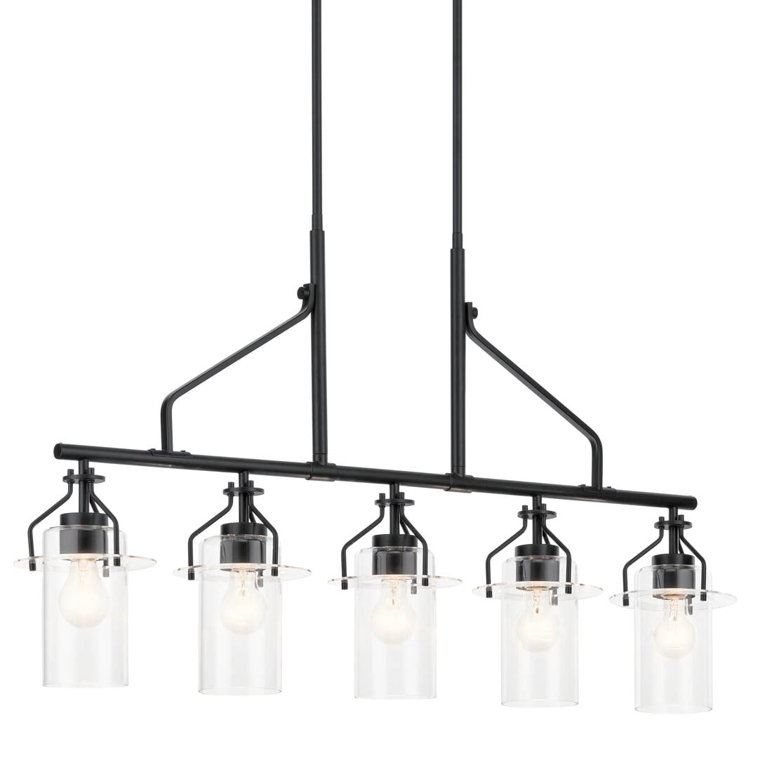 Illuminate your space with the Kichler Everett 5-Light Black Industrial Chandelier, a harmonious blend of edgy industrial style and luxurious design. This chandelier's clear glass shades and sleek black finish create a stunning visual effect, perfect for modern kitchens, dining rooms, or living areas.