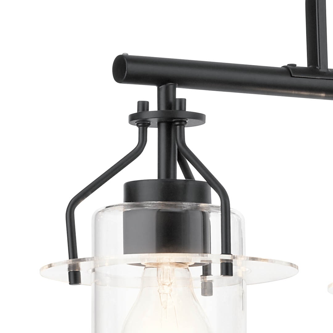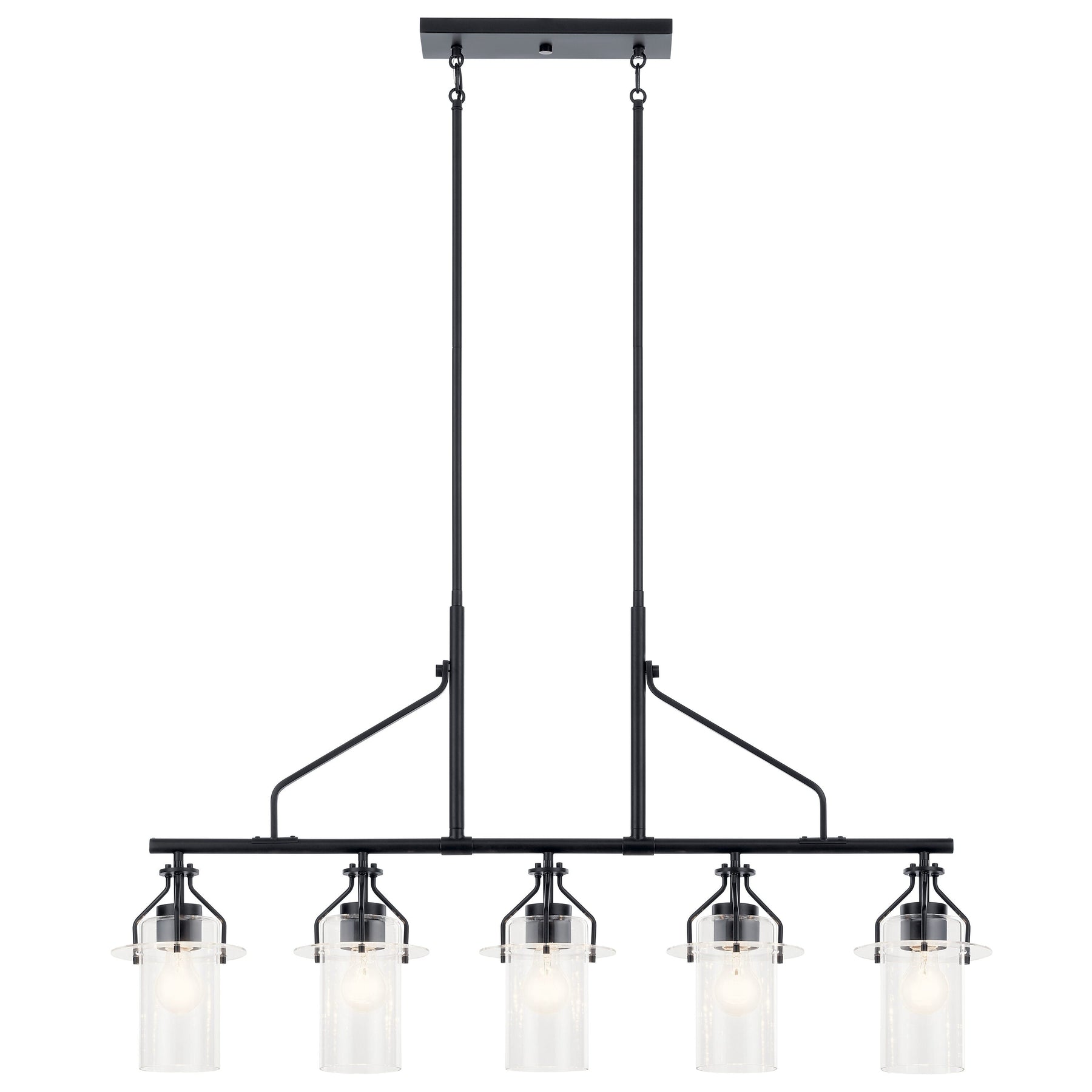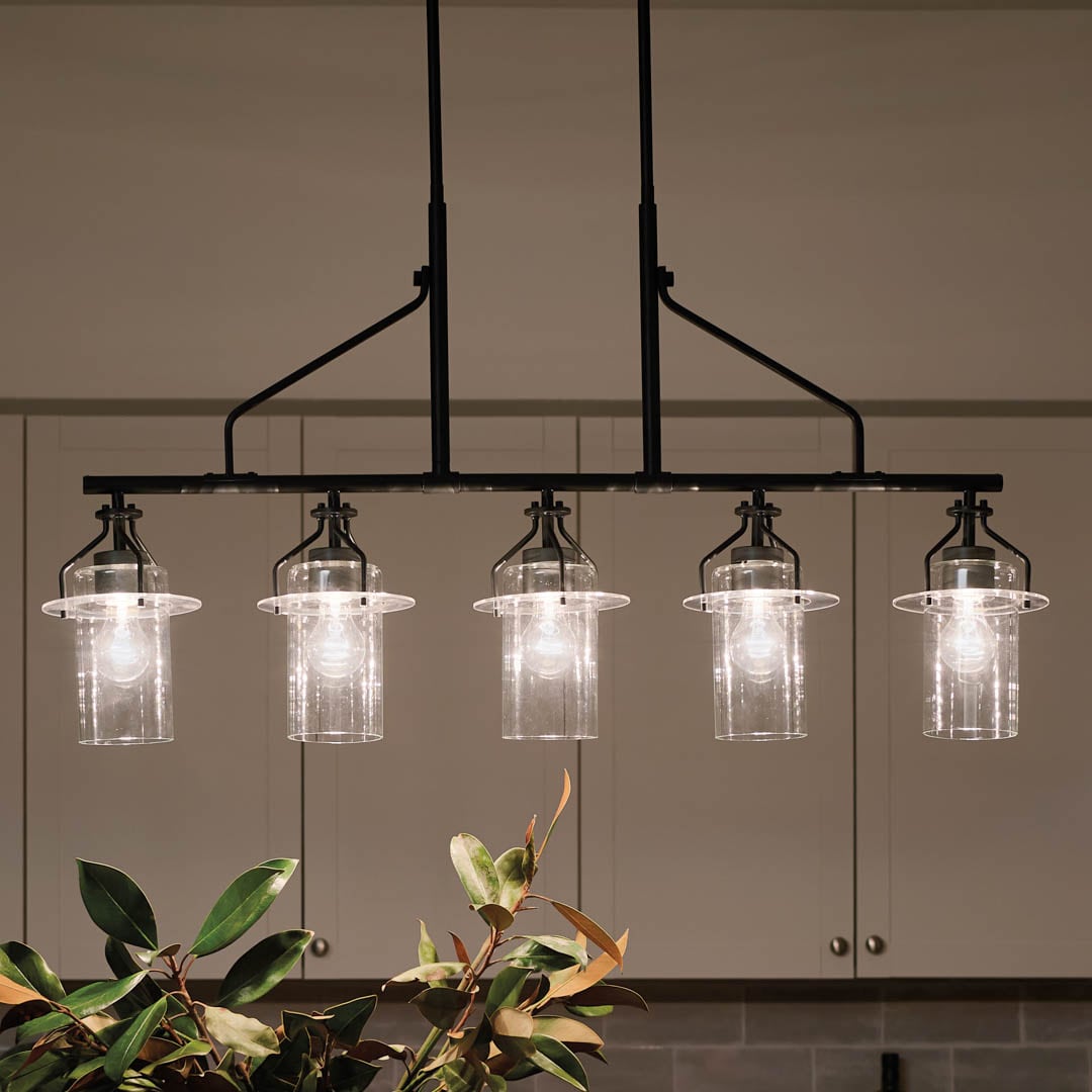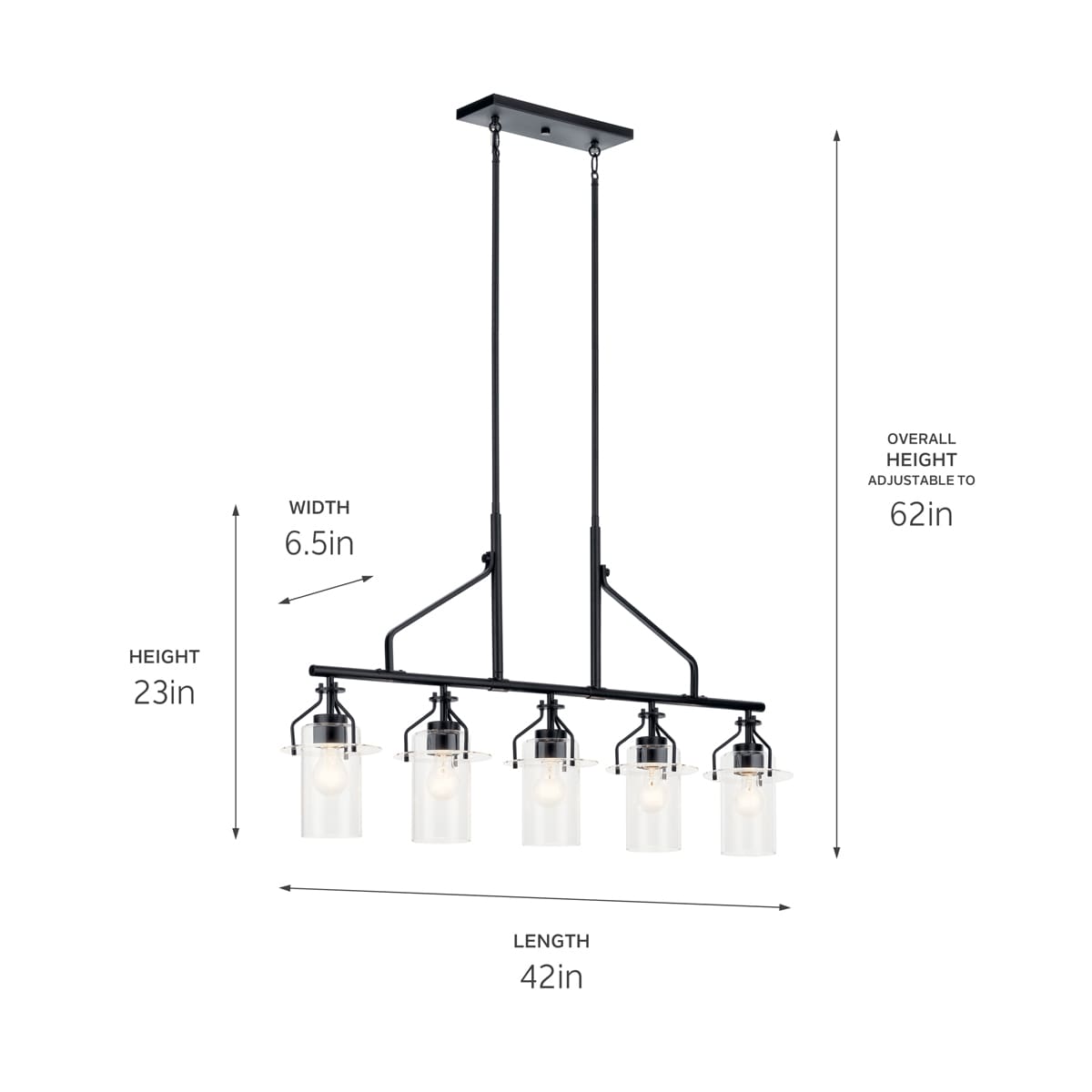 Illuminate your space with the Kichler Everett 5-Light Black Industrial Chandelier, a harmonious blend of edgy industrial style and luxurious design. This chandelier's clear glass shades and sleek black finish create a stunning visual effect, perfect for modern kitchens, dining rooms, or living areas.