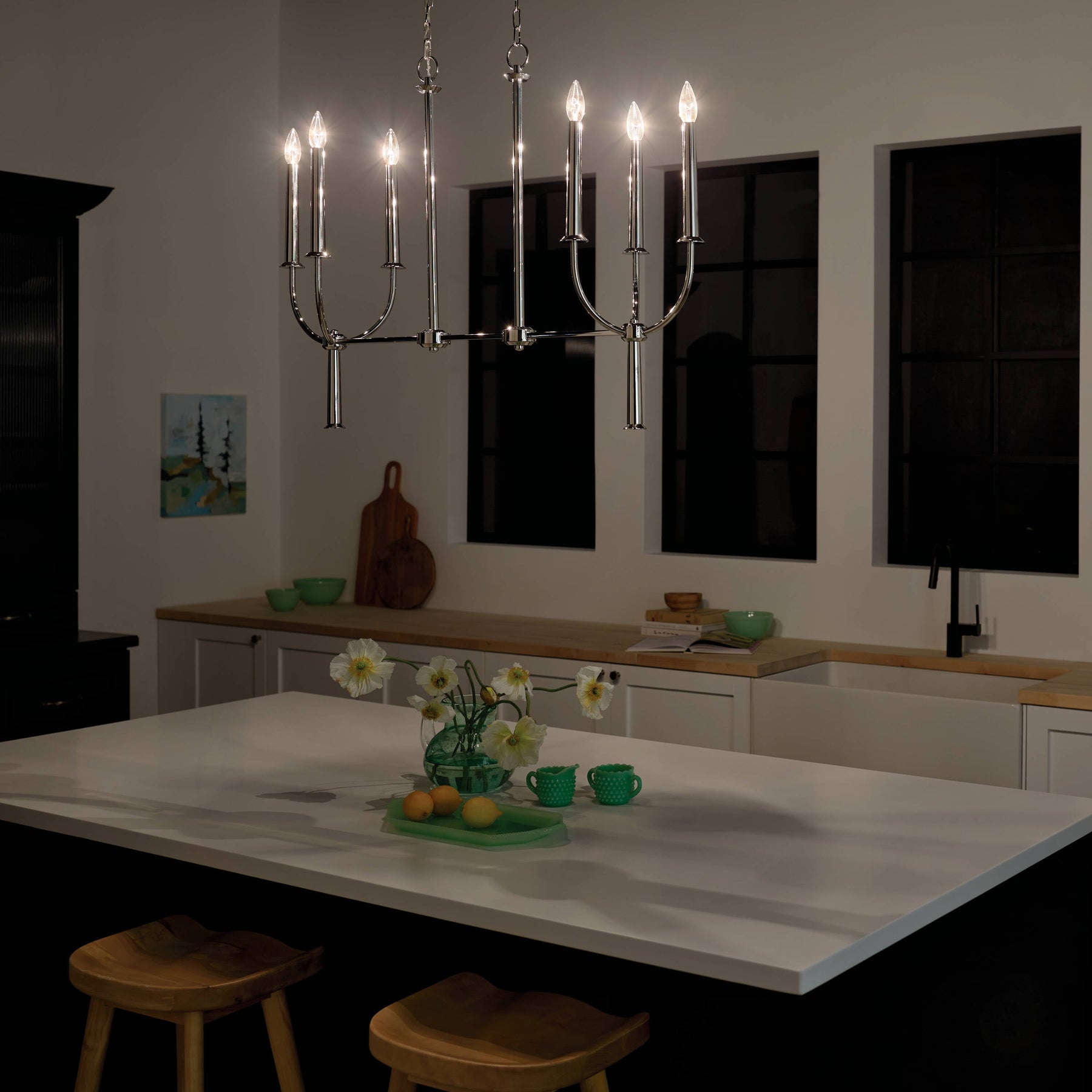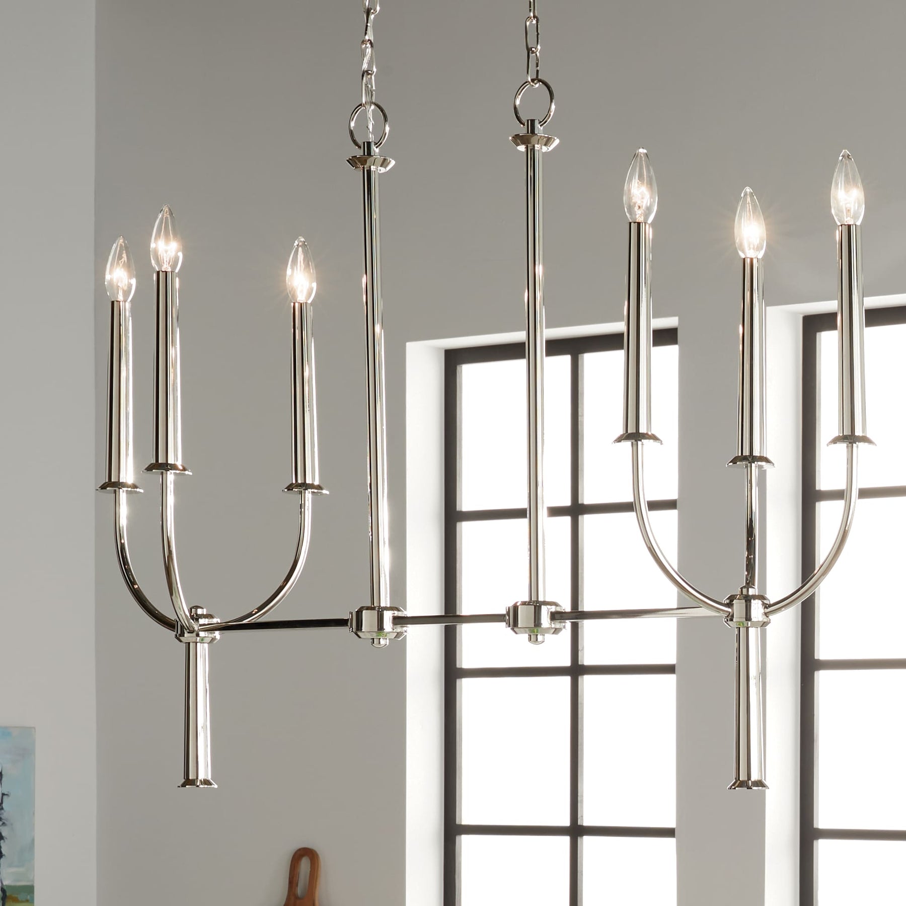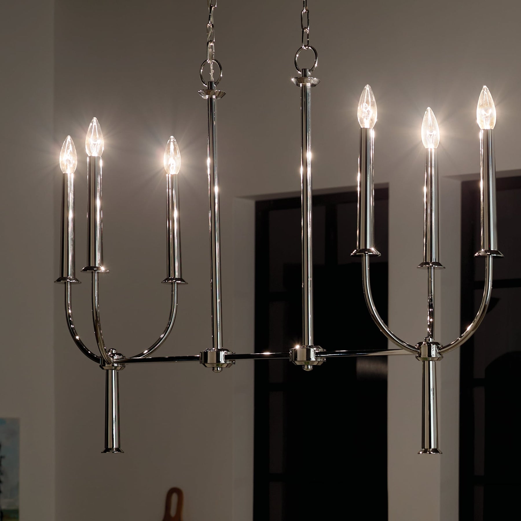 The Kichler Florence 6-Light Chandelier combines elegance and versatility, making it a stunning centerpiece for any room. With its polished nickel finish and elegantly tapered candelabra lights, this chandelier adds a timeless touch to your home, whether over a kitchen island or dining table. Embrace the sophistication of traditional design with this durable, steel-crafted fixture.