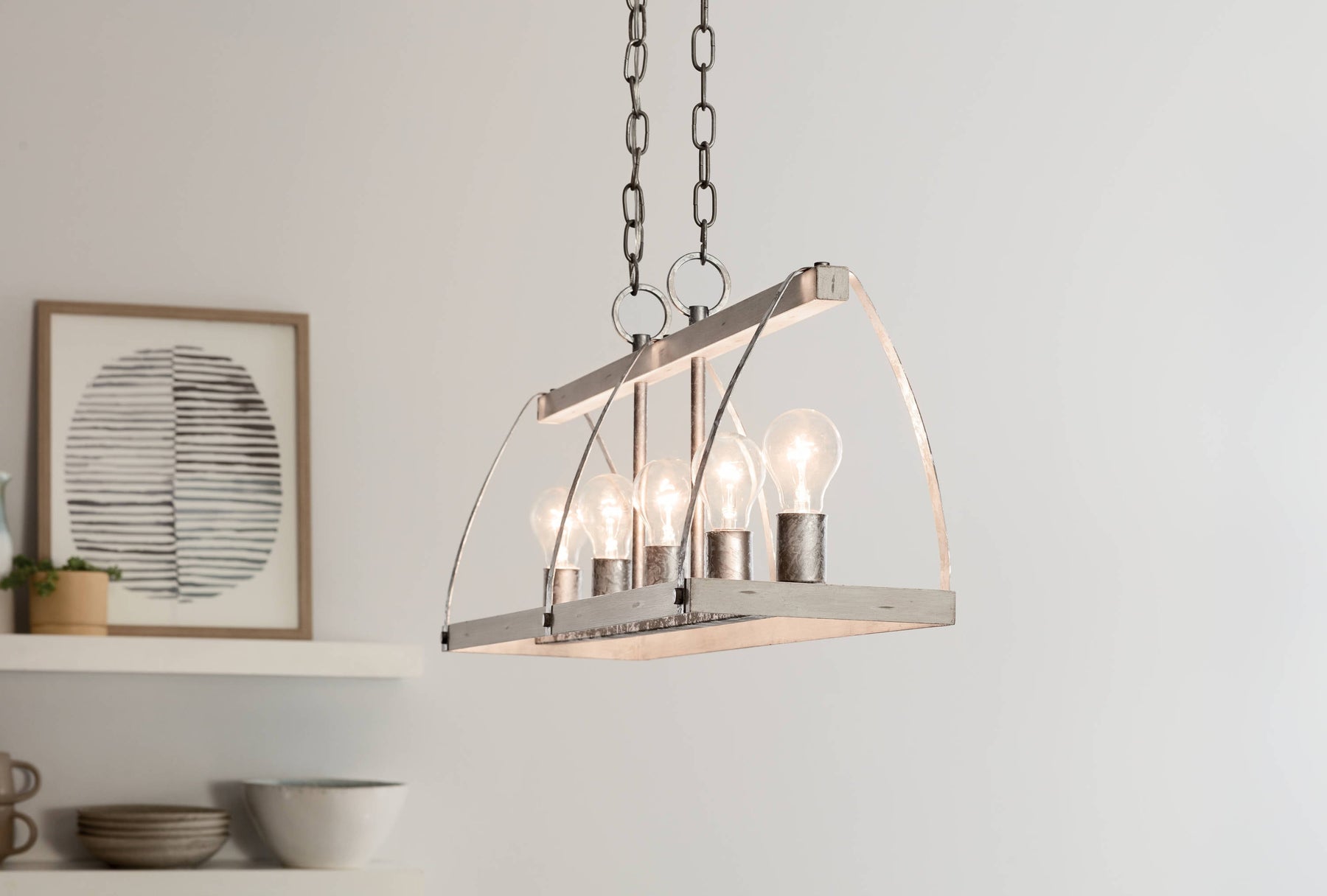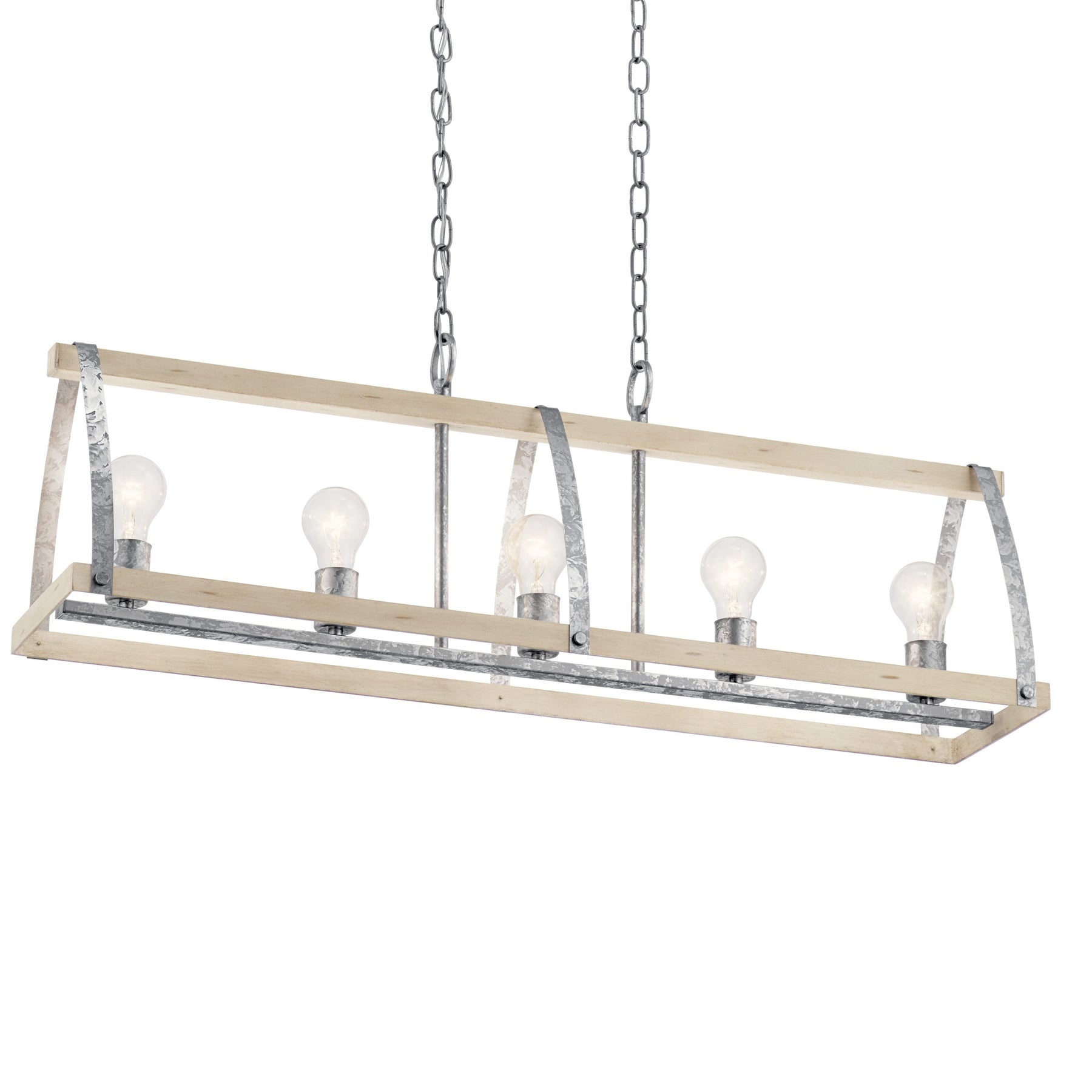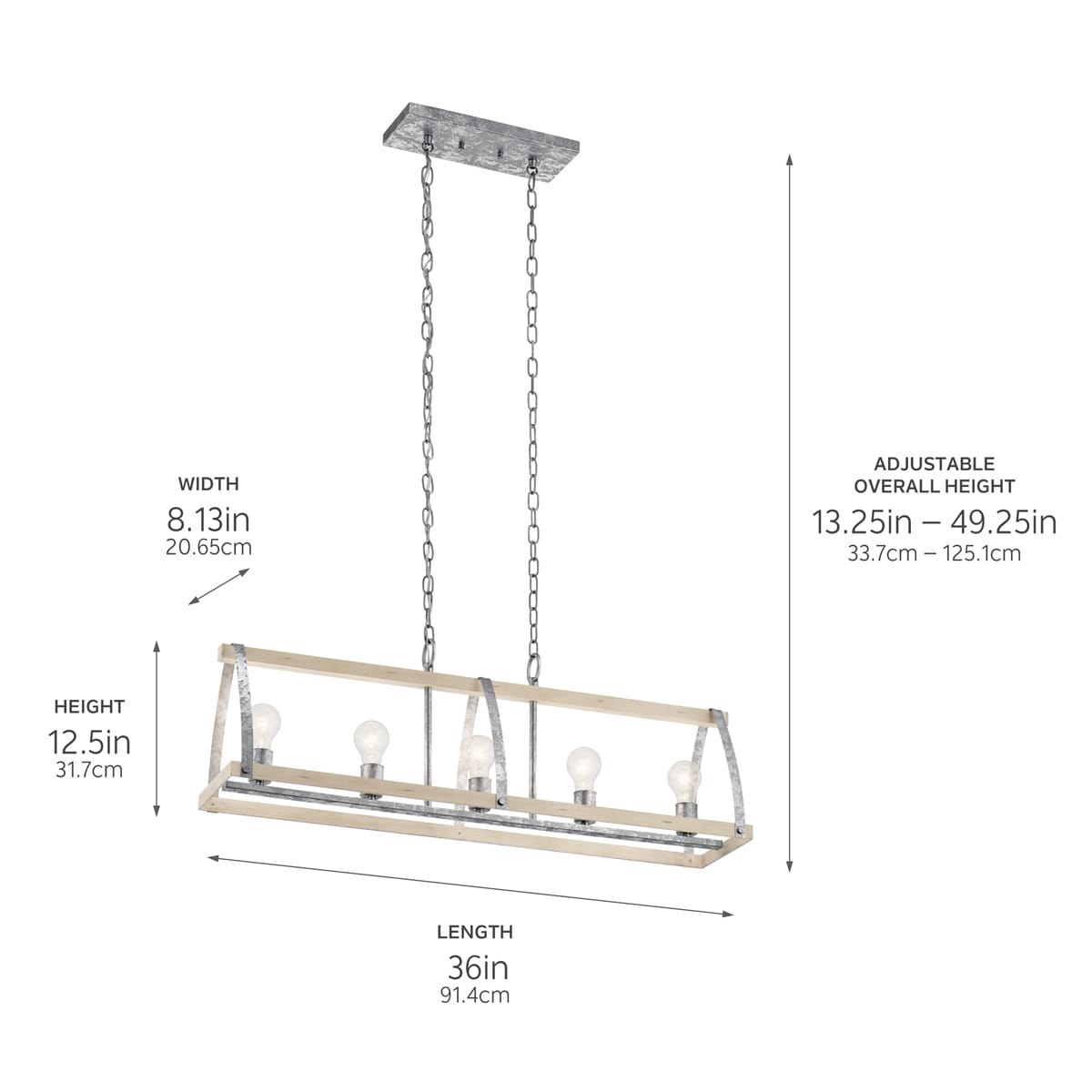Transform your kitchen island with the eye-catching Kichler Gartin 5-Light Industrial Linear Light. Crafted from galvanized steel and featuring a distressed antique grey wood tone finish, it beautifully complements rustic decor while providing functional, ambient illumination. This fixture is both stylish and versatile, perfect for adding charm and warmth to any interior with its unique open cage design.