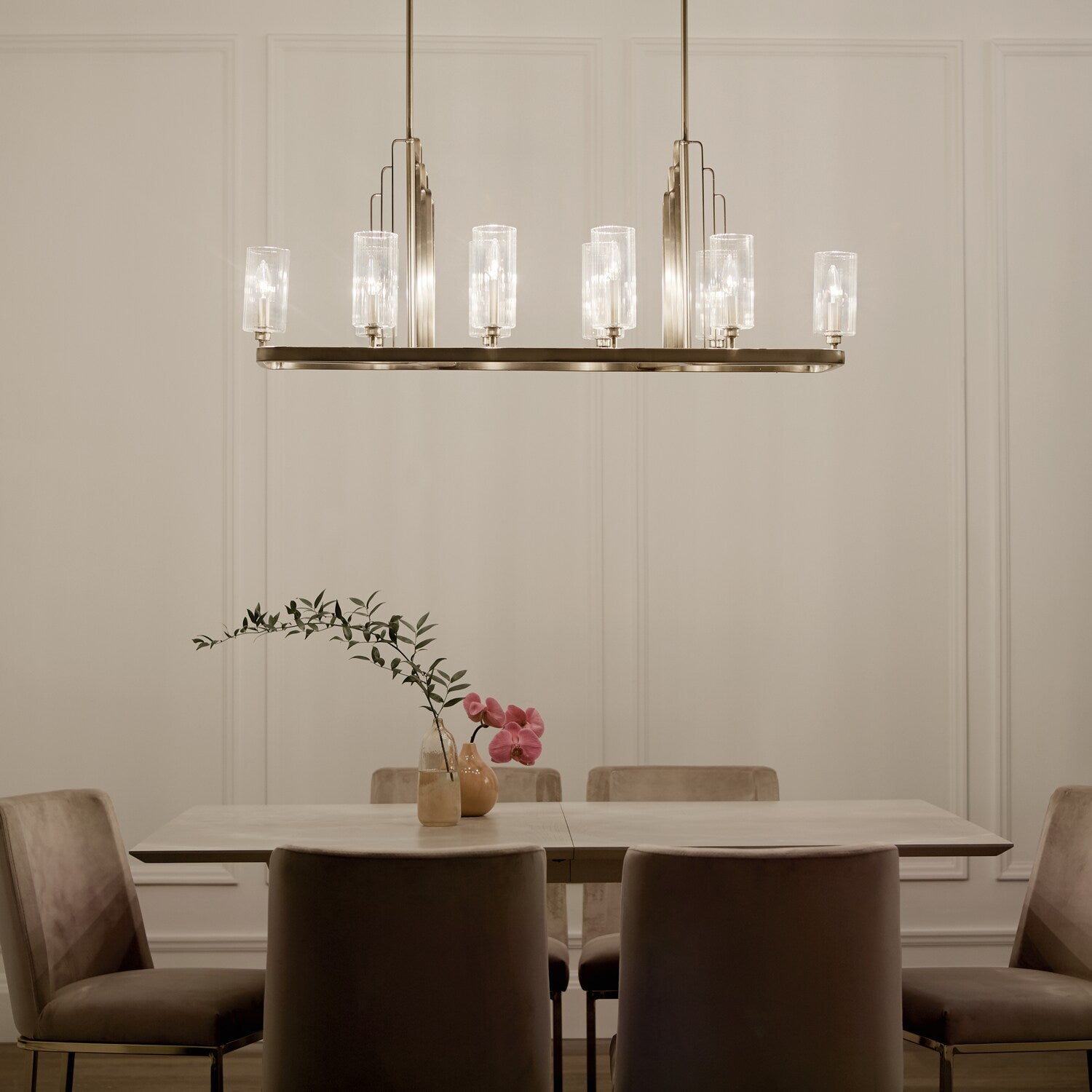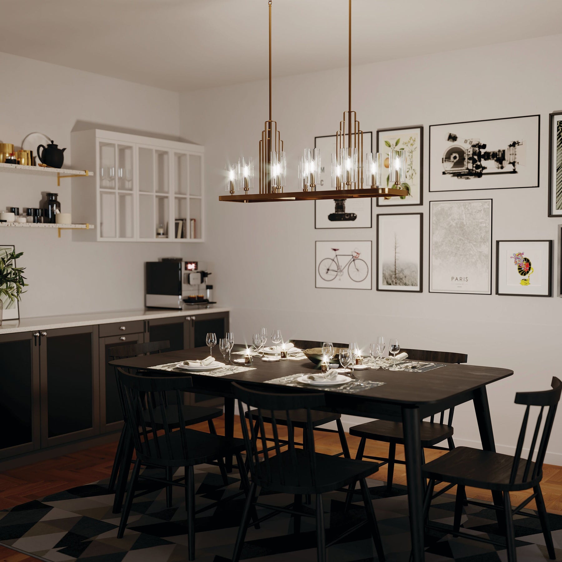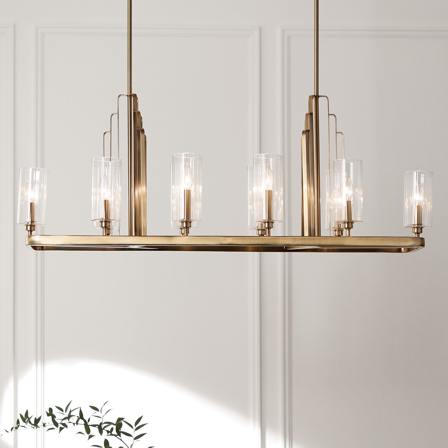 Illuminate your space with the striking Kichler Kimrose 10-Light Chandelier. With its Art Deco-inspired design and elegant Brushed Natural Brass finish, this chandelier makes a sophisticated statement. The ribbed glass shades offer a subtle lighting effect that's perfect for dining rooms, kitchens, or foyers.